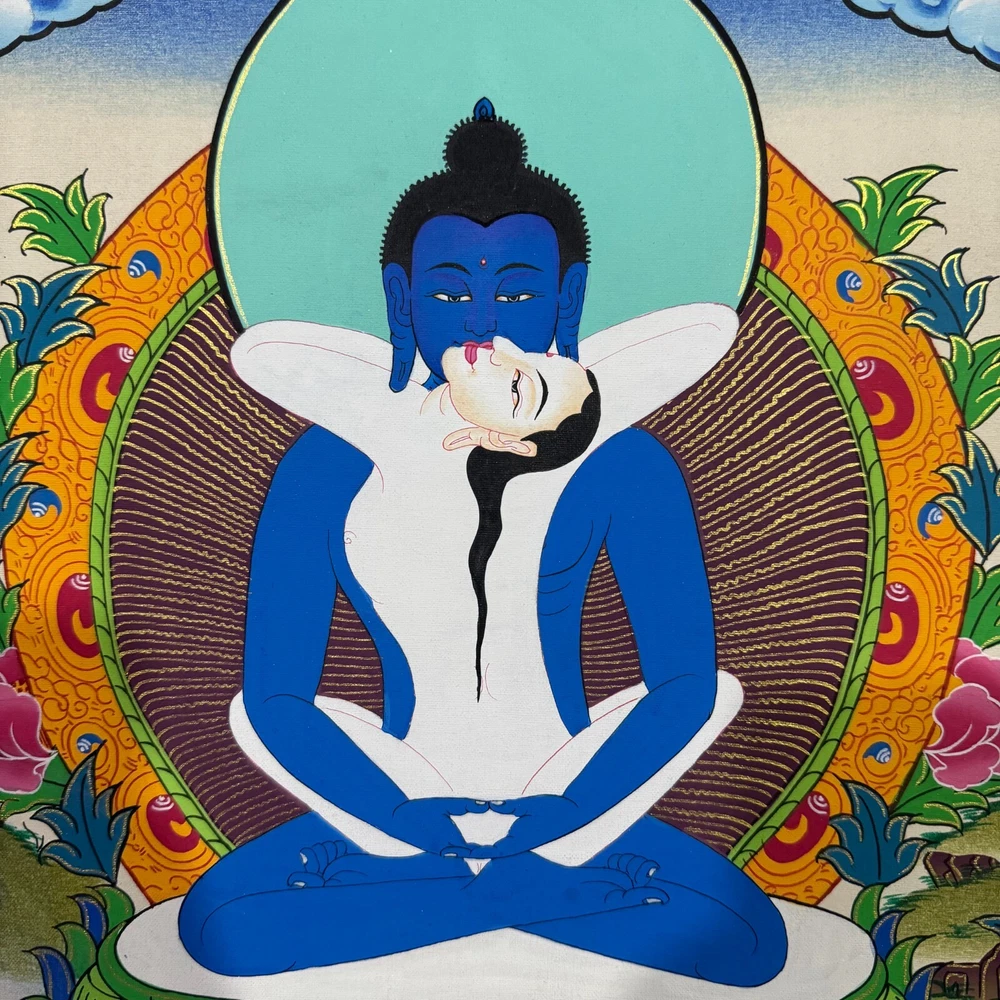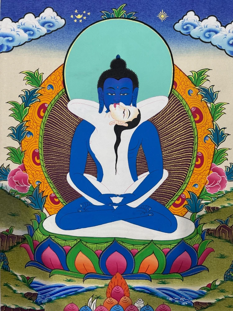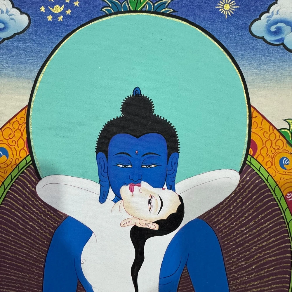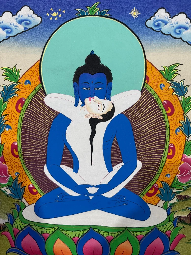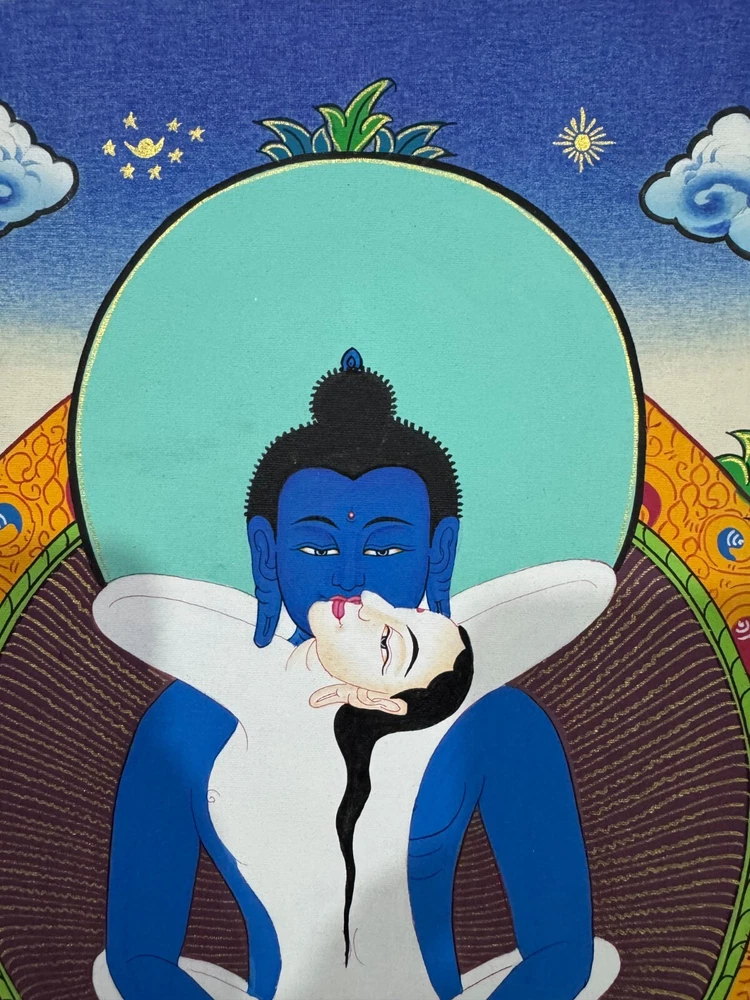 Namaste and Welcome to my Gallery!!! All of the paintings and arts in my gallery are originally handmade and hand-painted by my family members and other local artists who have been practicing their craft for over two decades. My father is Master Artist from Nepal with an experience of more than four decades; you can see some of his work in this Gallery. Also you can see some of the beautiful and soulful artwork of talented local artists from Himalayas. ~~ Buddha Shakti Thangka~~ Buddha Shakti is deep blue in color, symbolizing the sky or emptiness of mind. Samantabhadri or buddha’s consort is white in color, symbolizing the aspect of the clarity of our mind. The male female of Adi Buddha in union depict the unity of emptiness and cognizance. Samantabhadri is completely nude and while not ornaments symbolizing that she is free from all thought constructs. It means that enlightenment can be realized only when we are free from thought constructs and one perceives the empty nature of the mind directly. [Size = 42cm x 33cm] Material Used: • Cotton Canvas • Natural Pigments and colors • Gold leaf ~Excellent for meditation or home/office decor, ~Tibetan Yoga Wall Art ~Genuine 100% hand-painted from Himalayas Please feel free to contact me if you have any question regarding the painting.