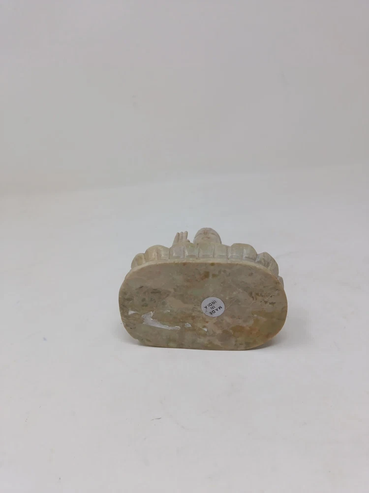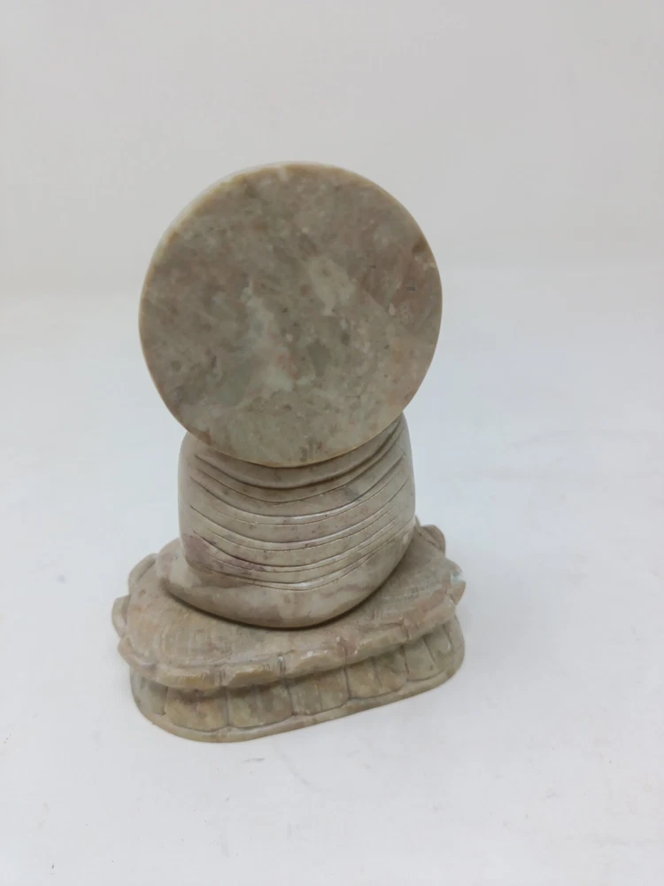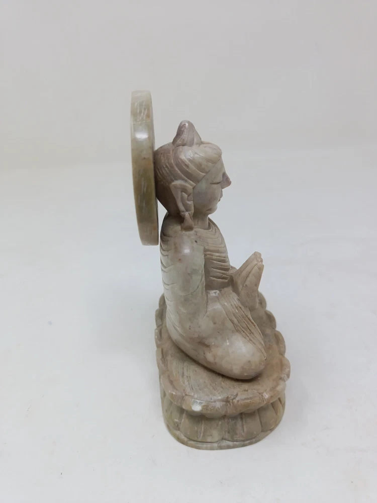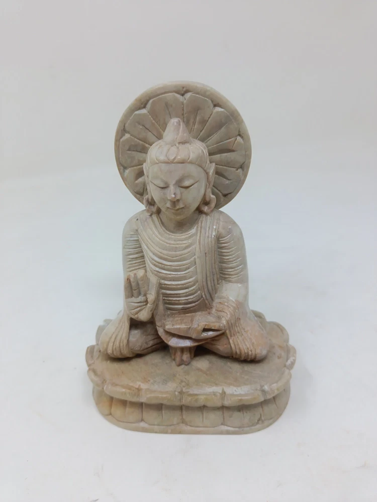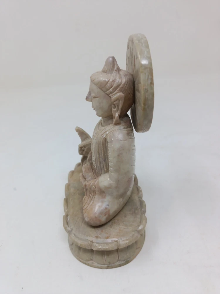 This is a 6-inch tall and 4-inch wide soapstone art sculpture of a Buddhist Buddha, originating from India. The sculpture is a religious item representing Buddhism, crafted from natural soapstone material. One small chip on side by right knee. Will pack for safe delivery. Ships in first 48. Thank you and God bless you!