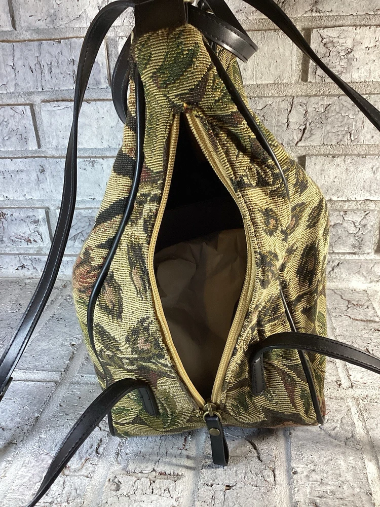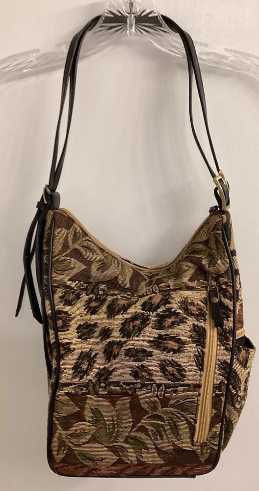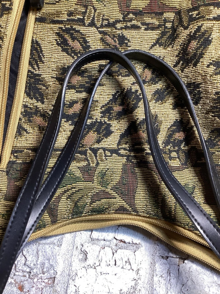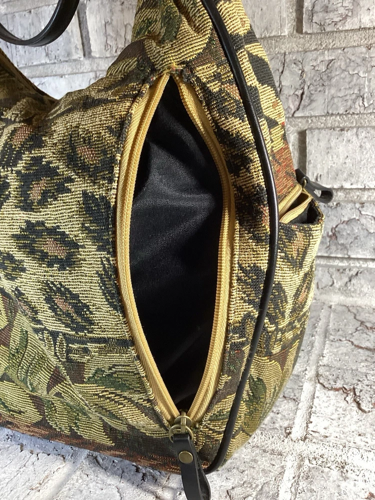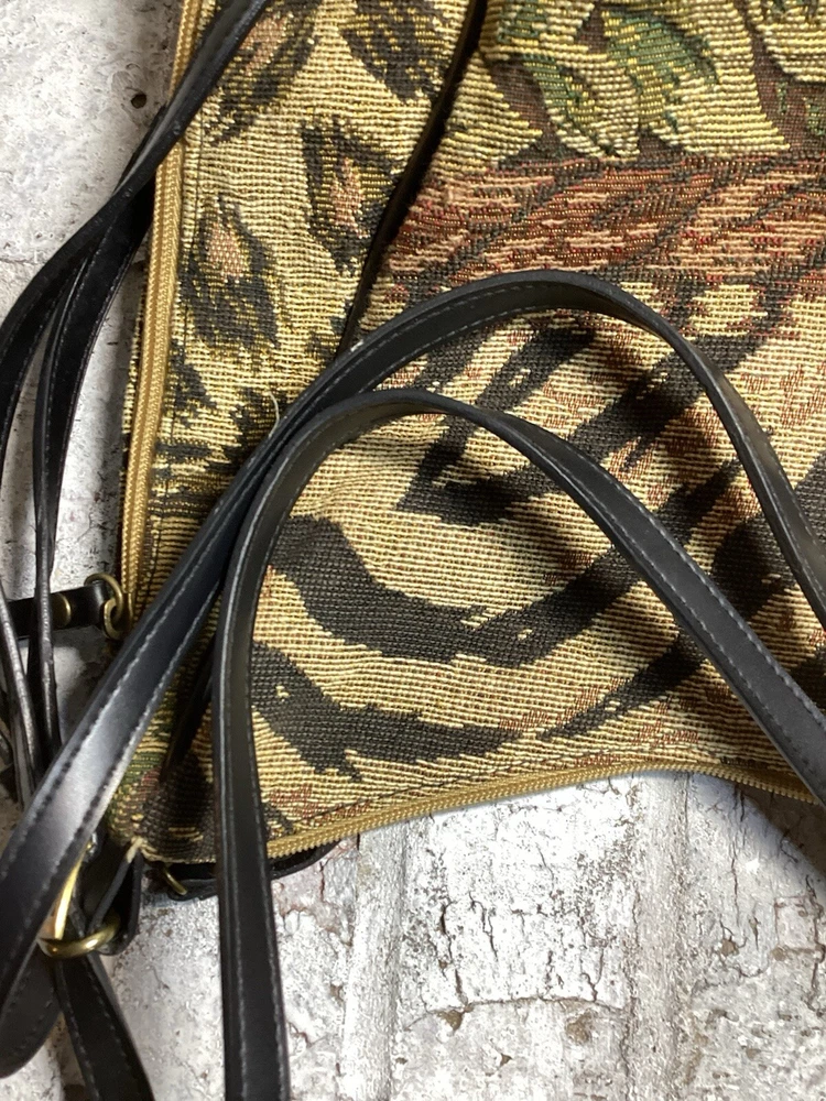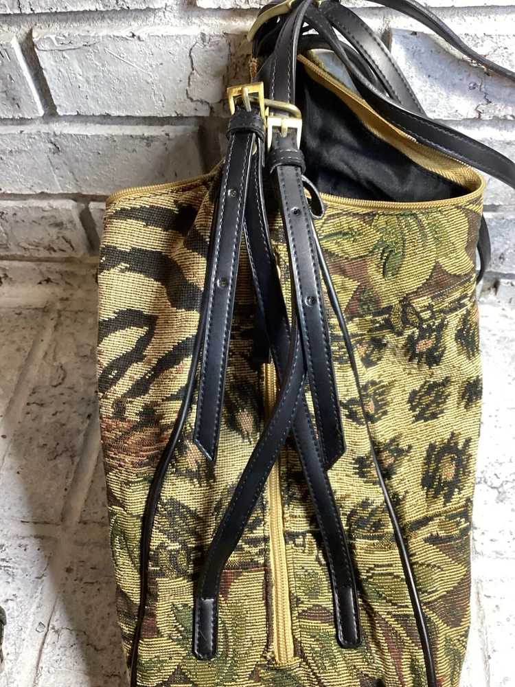 Floral and zebra/leopard (?) print tapestry bag. Two outside pockets, one leads to the interior and the other one is its own pocket. Double straps are adjustable. The bag is in excellent condition, almost no wear on it. Please see pictures for more details. I’m very happy to answer any questions you have. Thank you for stopping by!