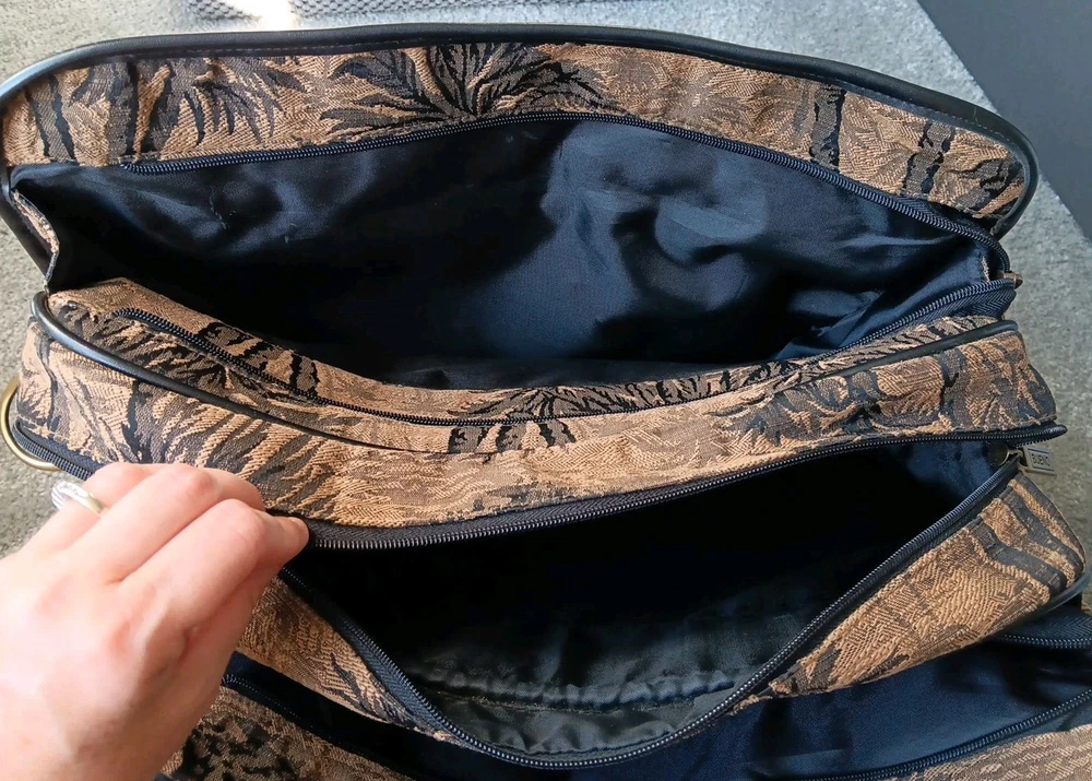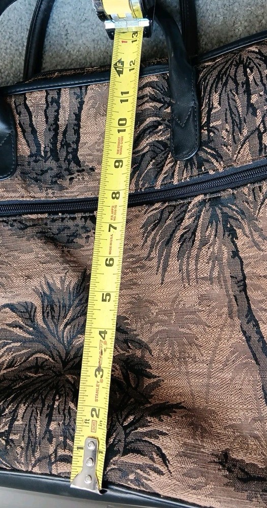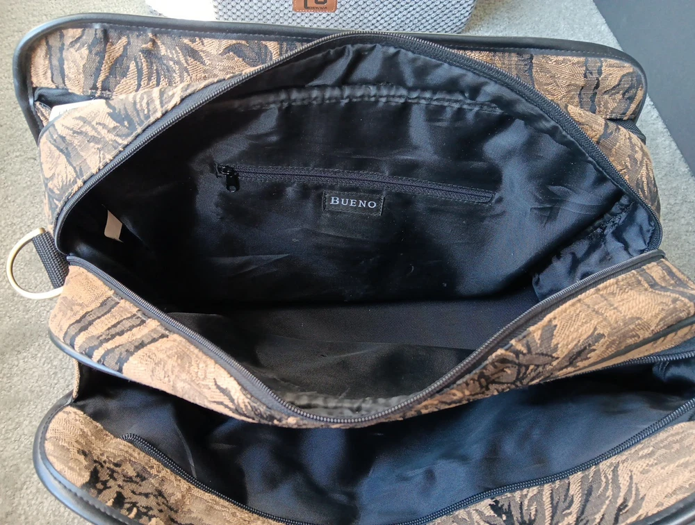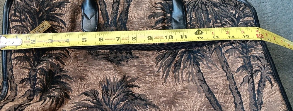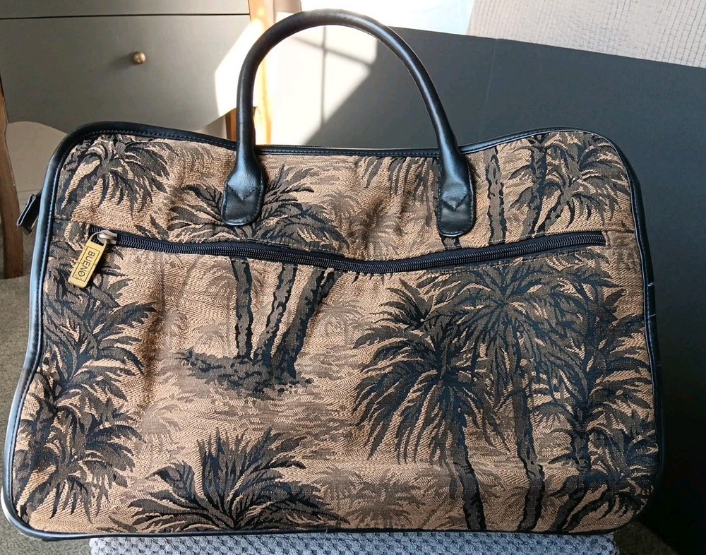 Nice size pre-owned overnight, carry-on, weekend bag by Bueno. It has many compartments and pockets. It's a bronze tone of brown with black trim and tropical/palm tree pattern. Good condition handles. It is missing the shoulder strap. There's is minor wear to the bottom. Please see photos. Please message me for additional photos or information.