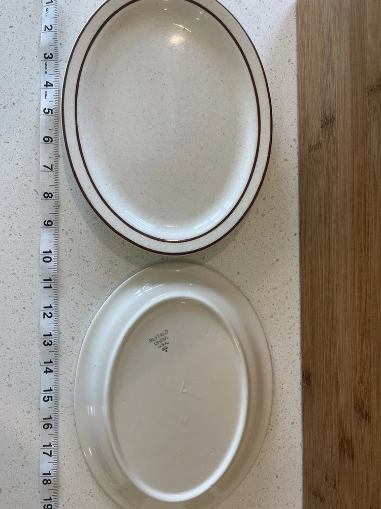 This beautiful set of two oval dinner plates is perfect for any restaurant or dining room. Made of high-quality ceramic material, these plates feature a unique brown stripe design that adds a touch of elegance to any table setting. The plates are perfect for serving a variety of dishes and are sure to impress your guests. The plates are part of the Buffalo China Restaurant Ware collection and are designed with a line pattern. They are beige in color and have a vintage feel to them. The set includes dinner plates, plate sets, and plates, making it a versatile addition to any kitchen. Upgrade your dining experience with these stunning plates today! These vintage plates are in excellent condition and from a smoke-free home.