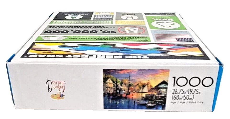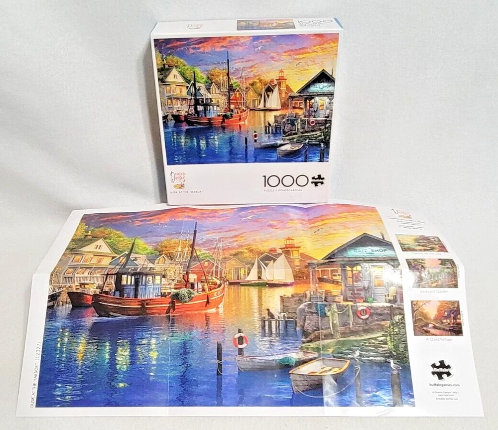 This 1000 piece jigsaw puzzle features a beautiful harbor scene at dusk, created by artist Dominic Davison for Buffalo Games. The puzzle is made of high quality cardboard material and includes a reference poster for easy assembly. The puzzle is recommended for ages 10 and up. It was made in the United States and is perfect for anyone who loves puzzles, art, or beautiful scenery. It also comes from a smoke-free household. Doing puzzles has some hidden benefits . Excellent qualities : Cultivate concentration, patience, and temper your will Movement development : Train hand-eye coordination and precise small movements Spatial intelligence : Improve visual discrimination of colors and shapes Critical thinking ability : Understand the relationship between parts and the whole, and draw inferences from one example to explore the future Relaxes your mind : Relieve work pressure and release yourself Brain development : Enhance memory and may help prevent or slow brain degeneration * We did not work the puzzle or count the pieces, but we verify the number count at your request. Each item we ship is carefully packaged to prevent any damage and is shipped immediately with tracking.