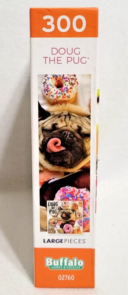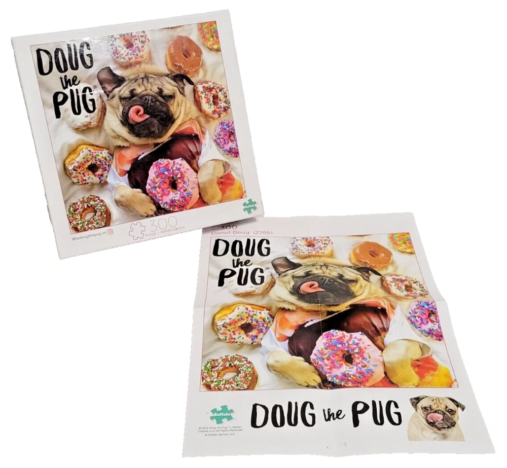 Piece together a sweet and satisfying puzzle experience with the Buffalo Games Doug the Pug Jigsaw Puzzle. This 300-piece puzzle features a colorful and cute design of Doug the Pug surrounded by delicious donuts. The interlocking pieces are made of high-quality material and come from a smoke-free household. In addition, this puzzle includes a reference poster to guide you along the way. Suitable for ages 8 and up, this puzzle is perfect for anyone who loves a good challenge and adorable designs. Made in China, this contemporary puzzle is a must-have for any puzzle enthusiast. Doing puzzles has some hidden benefits . Excellent qualities : Cultivate concentration, patience, and temper your will Movement development : Train hand-eye coordination and precise small movements Spatial intelligence : Improve visual discrimination of colors and shapes Critical thinking ability : Understand the relationship between parts and the whole, and draw inferences from one example to explore the future Relaxes your mind : Relieve work pressure and release yourself Brain development : Enhance memory and may help prevent or slow brain degeneration We did not work the puzzle or count the pieces, but we verify the number count at your request. Each item we ship is carefully packaged to prevent any damage and is shipped immediately with tracking.