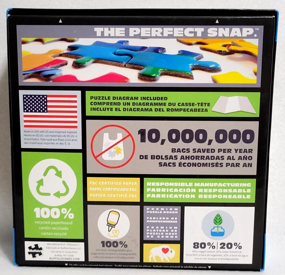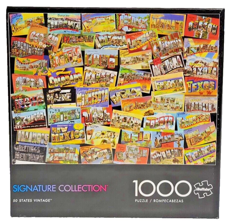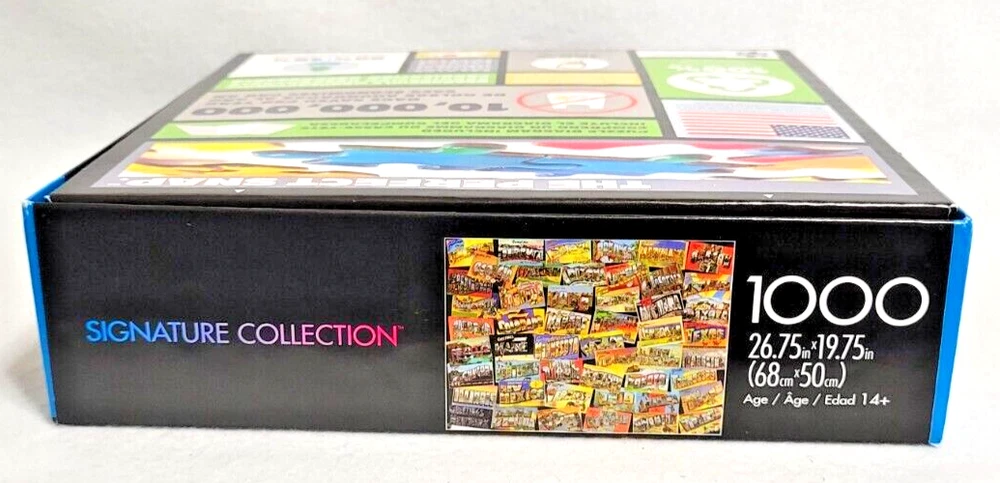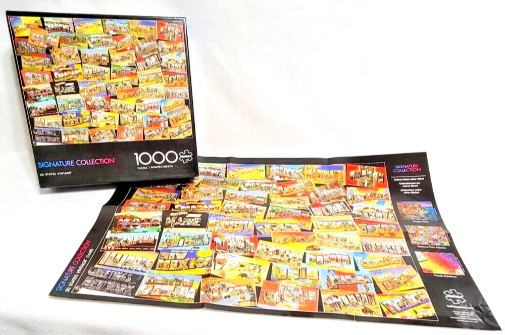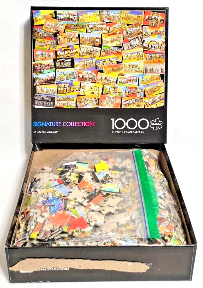 This 1000 piece jigsaw puzzle from Buffalo Games Signature Collection features vintage postcards from all 50 states of the United States. The puzzle is designed by artist Kathy Alpert and is made of high-quality cardboard material. The puzzle pieces are interlocking and the final size of the puzzle is 26.75" x 19.75". The puzzle comes with a reference poster to help you put the pieces together and is recommended for ages 8 and up. It is a colorful puzzle with a multi-color theme of maps that will provide hours of fun for puzzle enthusiasts. The puzzle has been kept in a smoke-free household and is made in the United States. It's time for a trip down Nostalgia Lane. Doing puzzles has some hidden benefits . Excellent qualities : Cultivate concentration, patience, and temper your will Movement development : Train hand-eye coordination and precise small movements Spatial intelligence : Improve visual discrimination of colors and shapes Critical thinking ability : Understand the relationship between parts and the whole, and draw inferences from one example to explore the future Relaxes your mind : Relieve work pressure and release yourself Brain development : Enhance memory and may help prevent or slow brain degeneration We did not work the puzzle or count the pieces, but we verify the number count at your request. Each item we ship is carefully packaged to prevent any damage and is shipped immediately with tracking.
