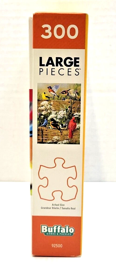 A little bit about the puzzle: Features colorful painting of different songbird species Variety of vivid plumage on cardinals, finches, sparrows, warblers Painted by renowned wildlife artists Robert, Jim, and John Hautman 300 large, shaped puzzle pieces make finished puzzle 21 1/4" x 15" inches High-quality blueboard puzzle pieces made in USA Part of series showcasing Hautman Brothers' bird art Great activity for bird enthusiasts and puzzle lovers Suitable for ages 10 and up Pieces carefully cut for snug interlocking fit Completed puzzle looks great framed and displayed Allows puzzlers to recreate acclaimed bird artwork Satisfying hobby that calms the mind Combines nature, art, and puzzles in one activity Each item is carefully packaged to prevent any damage and is shipped immediately with tracking.