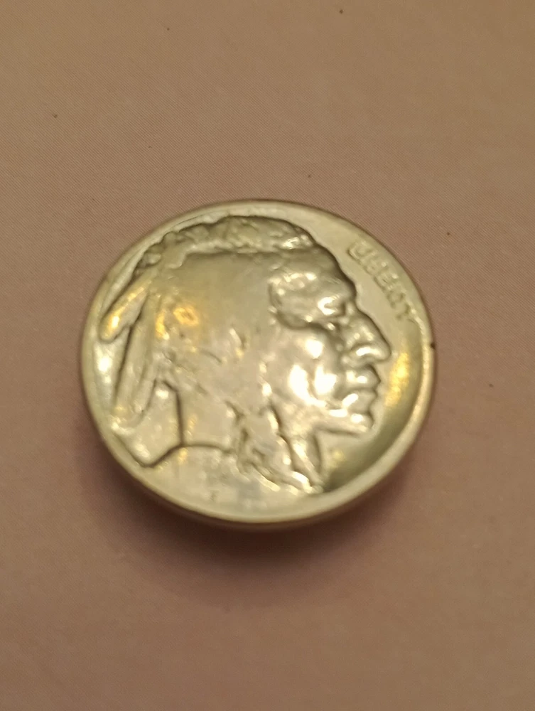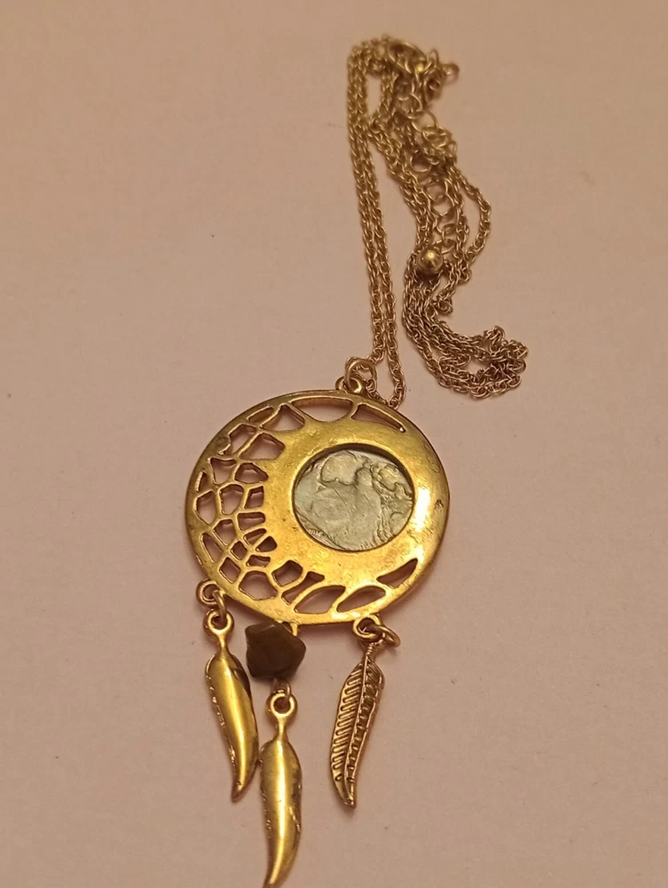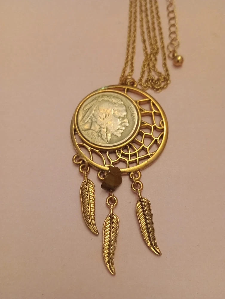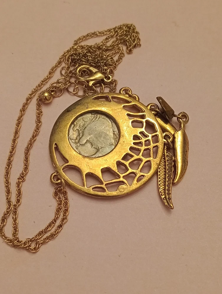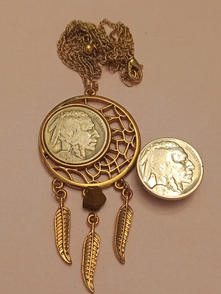 This necklace features a Buffalo Nickel Indian Head pendant set in a bezel with a round shape. The pendant is a coin style, specifically a Nickel from 1928, giving it a vintage aesthetic. This lot also has a 1929 button cover. D160/12