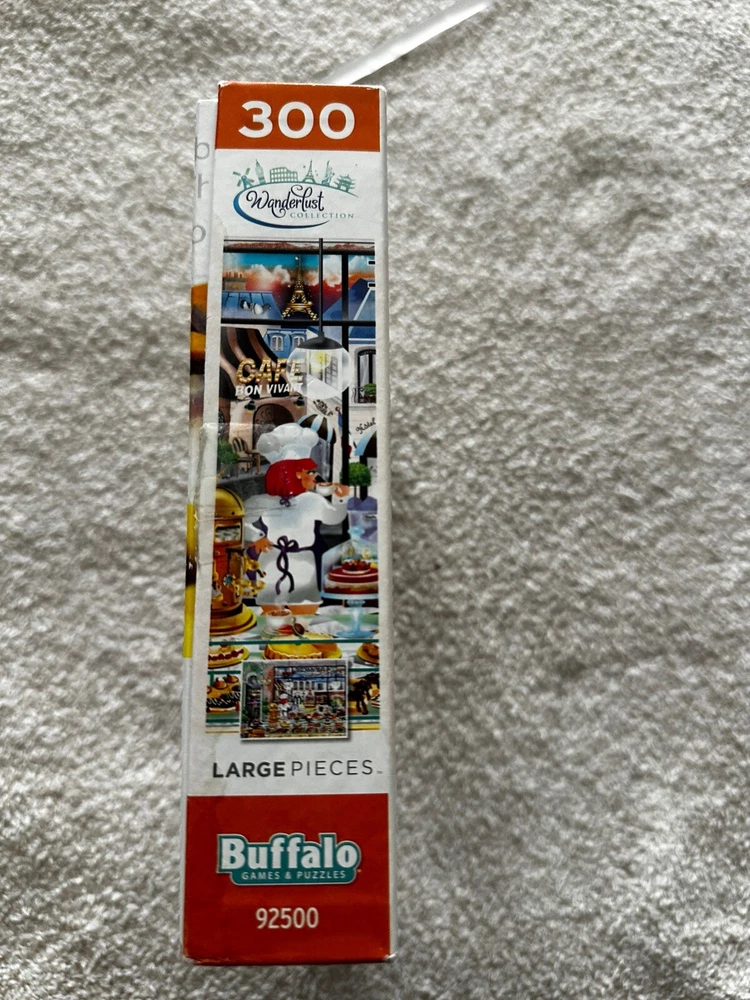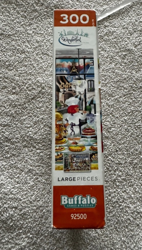 Enjoy a delicious challenge with the Buffalo Puzzle Paris Patisserie 300 Piece Puzzle. This puzzle features delightful pastel colors and a charming French patisserie theme that will captivate your mind and satisfy your love for puzzles. Each piece is large and sturdy, making it perfect for both young and old puzzle enthusiasts. With its intricate design and beautiful details, this puzzle will provide hours of entertainment and stress relief. It is perfect for a cozy evening with family and friends or for a relaxing afternoon alone. The Buffalo Puzzle Paris Patisserie 300 Piece Puzzle is a must-have for any puzzle lover who wants to experience the thrill of a new adventure while enjoying the warm feeling of completing a challenging puzzle.
