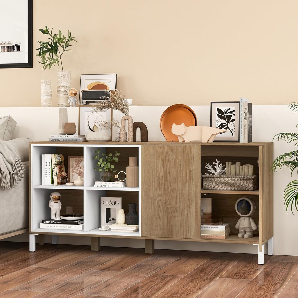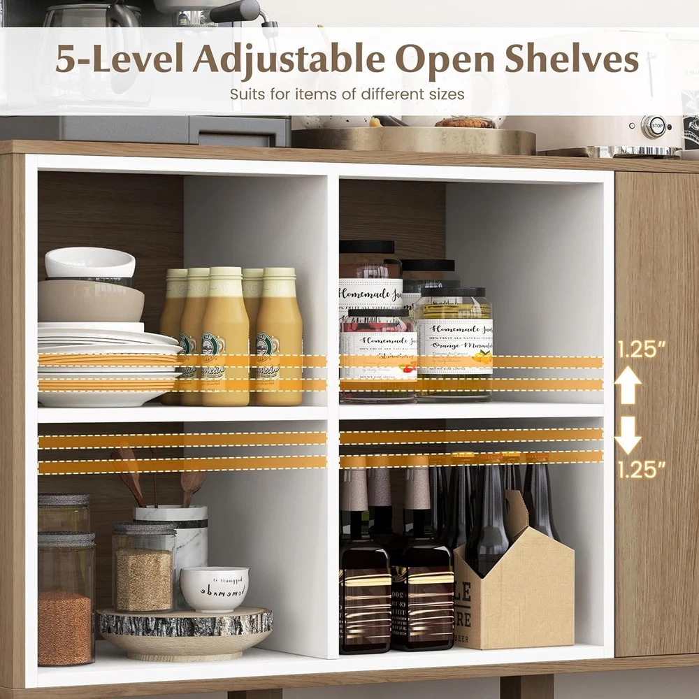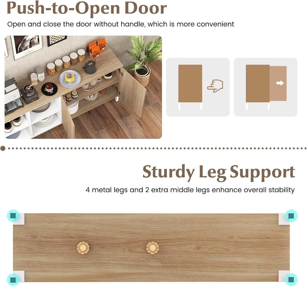 Product Description Description: This modern buffet sideboard is perfect for organizing essentials and keeping your space clutter-free. With a spacious countertop, 4 open compartments, and a 2-door cabinet, this cabinet caters to all your storage needs. And the 5-level adjustable design of the open shelves suits for items of different sizes. The sleek push-to-open design allows you to open and close the door without handle, which is more convenient. Moreover, the sturdy leg support as well as anti-tipping fitting ensure durability and safety. Whether you’re using it as a chic coffee bar cabinet, an elegant entryway organizer, or a classic dining room buffet, this sideboard is your ideal solution for sophisticated and orderly living. Features: Ample storage space for kitchenware, decorations, potted plants, books and so on 5-position adjustable shelves for items of different sizes Push-to-open design of the cabinet door for more convenience Made of high-grade material for long-term use 4 metal legs and 2 extra middle legs for strong support Anti-toppling device highly enhances safety Perfect for kitchen, living room, dining room, etc. With 2 boxes and you may receive them at different time Specifications: Color: Natural + White Material: MDF, Metal, Engineered Wood Overall Dimension: 63” x 16” x 29.5” (L x W x H) Dimension of Upper Open Shelf: 14.5” x 14.5” x 10.5” (L x W x H) Dimension of Bottom Open Shelf: 14.5” x 14.5” x 11”(L x W x H) Dimension of Inner Shelf: 31” x 14.5” x 11.5”(L x W x H) Clearance from Ground: 5” Net Weight: 105 lbs Package Includes: 1 x Buffet Sideboard 1 x Instruction On Aug 14, 2025 at 21:36:30 PDT, seller added the following information: