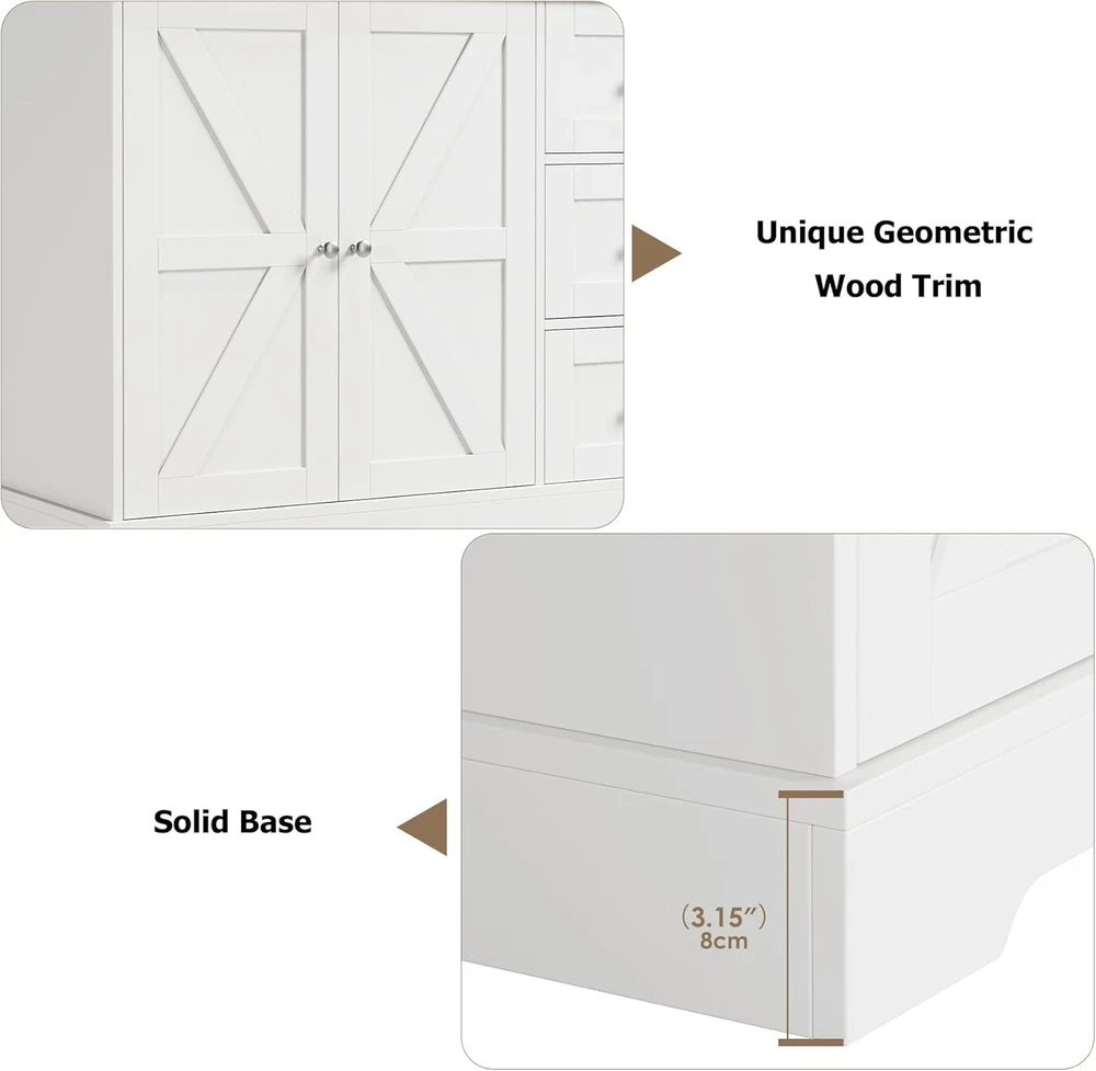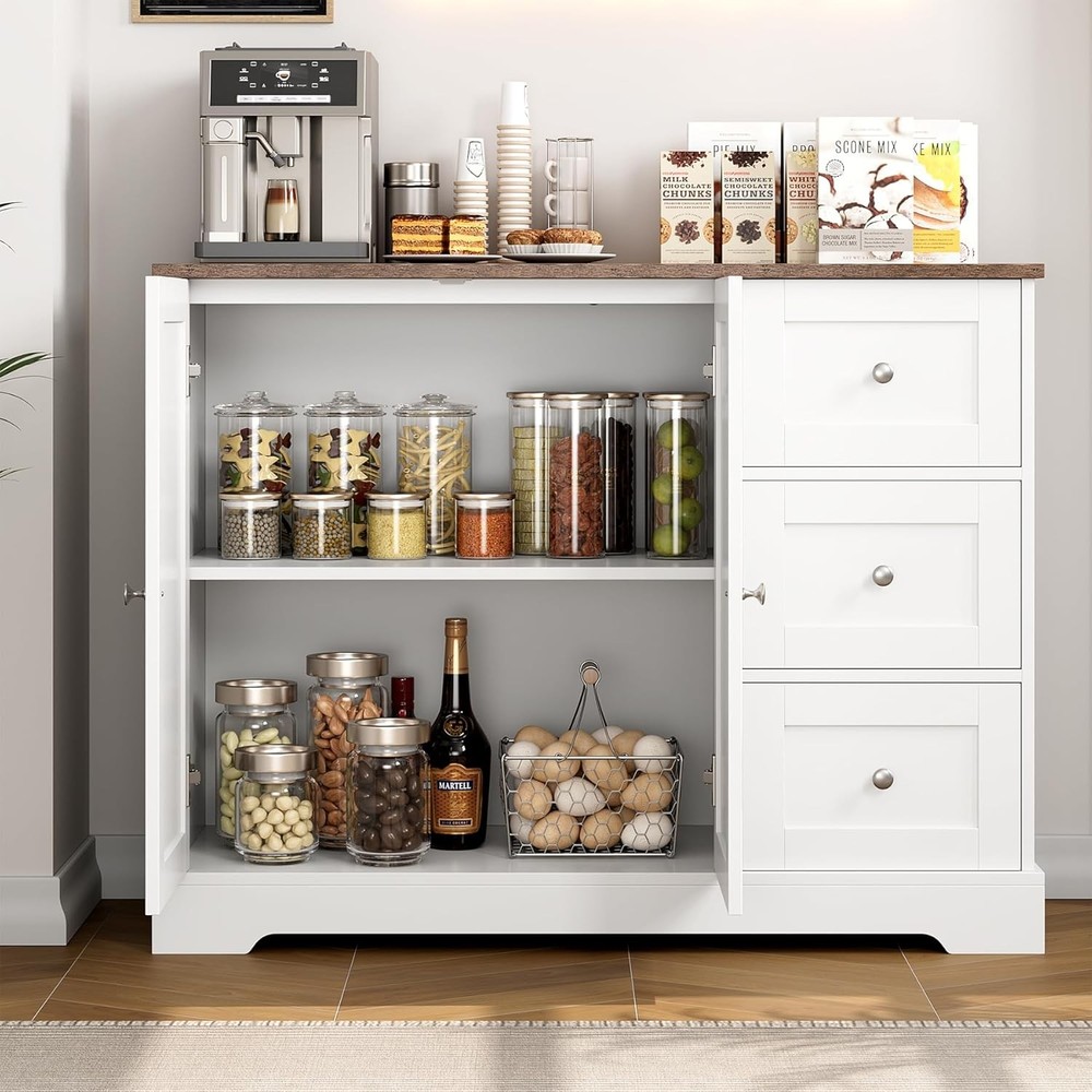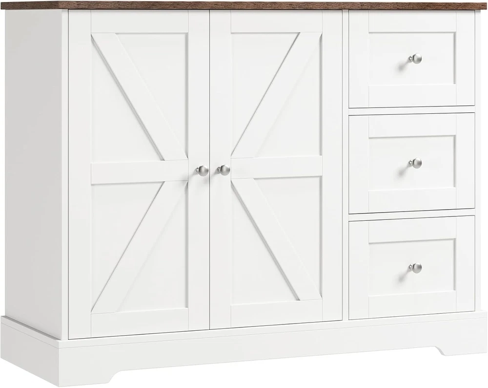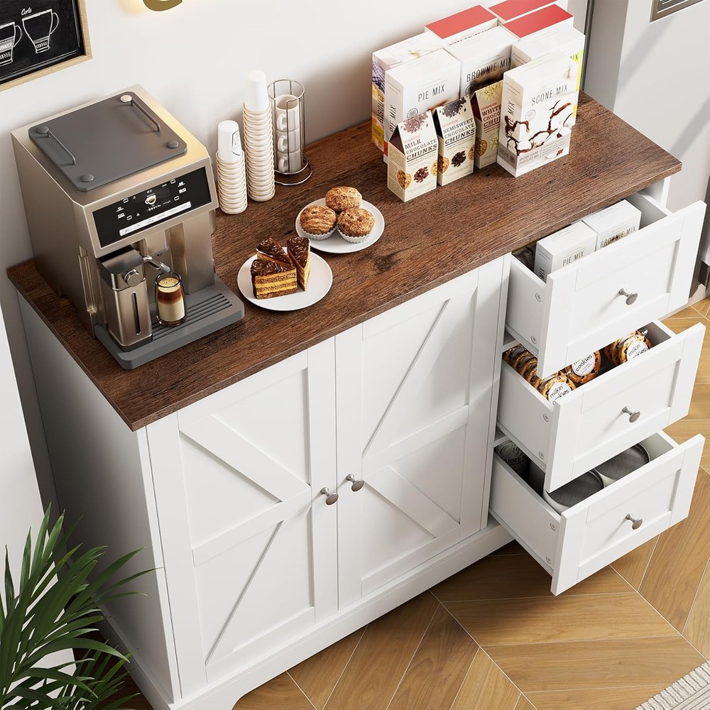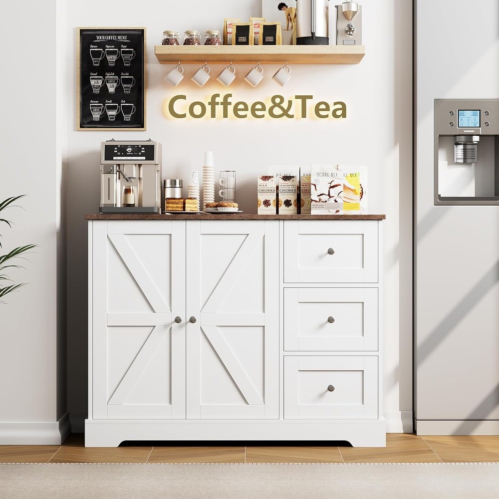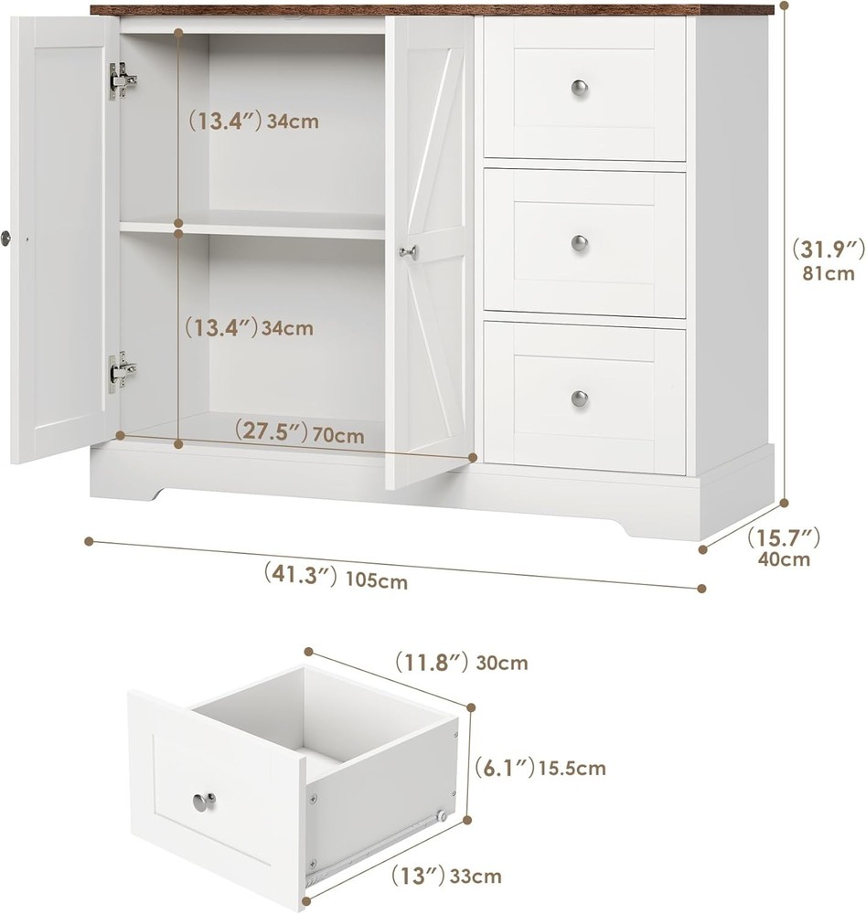 Product Description About this item • 【Modern Farmhouse Style】The Farmhouse Coffee Bar features classic country elements such as X-shaped decorative doors, black metal handles and brown finishes, full of rich country style, suitable for most rural, cabin or coastal residences • 【Large Capacity Sideboard】The accent cabinet features large fixed shelves and a 41.5-inch tabletop, providing storage space for your coffee machine, utensils, baking supplies, and three drawers to keep other kitchen supplies tidy, this sideboard is an absolute must-have for any loft apartment • 【High Durability】This buffet cabinet with storage is made of high-quality wood, with a scratch-resistant and wear-resistant surface, ensuring its excellent durability. The base is slightly larger than other sideboards, making it thicker and more stable • 【More Durable Shelves】The barn door with spliced wooden strips is more three-dimensional and has a sense of design. The fixed shelves inside the door are more stable than the movable shelves. They have strong bearing capacity and will not bend after many years. No matter you want to store books, Tableware, or red wine, etc., it can meet your needs • 【Multi-functional storage cabinet】With a versatile design and lots of storage space, this practical unit can be neatly tucked away as a sideboard, coffee bar cabinet, storage cabinet or console table. It can also be used as a console table in the hallway to display family photos and treasured keepsakes or as a TV stand to store media equipment WELCOME TO BOTLOG If you want a multifunctional storage cabinet, BOTLOG sideboard buffet will be a perfect choice for you! BOTLOG farmhouse buffet cabinet combines beauty and practicality , with 2 in-door zones and 3 drawers , the combined collection provides you with a variety of storage solutions to fully improve the utilization of space, whether it is to store spices, dishes, cutlery, daily necessities, toiletries or other miscellaneous items, ceverything is in order! BOTLOG is committed to providing you with premium furniture. The kitchen cabinet is made of high-quality panels with sturdy structure and solid base , which can be used for many years. Delicate Details Spacious Counter top The surface of the sideboard is wear-resistant and easy to clean, and the load-bearing capacity of 110 catties can easily place any kitchen utensils Door panel design White paint, doors inlaid with wood strips, and silver metal handles make your storage cabinet more stylish and three-dimensional Flexible Hinges Flexible hinges can help novices solve installation difficulties and make your door more seamless Thick base The solid base is more stable and majestic in appearance, and also increases the stability of the buffet cabinet More tidy and beautiful Large Storage Space The shelf inside the door can hold up to 44 pounds, and can store dishes, kitchen utensils, and even small kitchen appliances such as a toaster 3 drawers provide more space for your odds and ends, and you can also DIY a cutlery box Whether you're looking for a kitchen cabinet, coffee bar cabinet or sideboard, this versatile storage unit will surprise you! Elegant Choice The kitchen cupboard consists of a white cabinet and antique top , and the wood stripes add an artistic touch to the kitchen sideboard, making it a simple but unique style that is always memorable. On Aug 15, 2025 at 01:55:54 PDT, seller added the following information:
