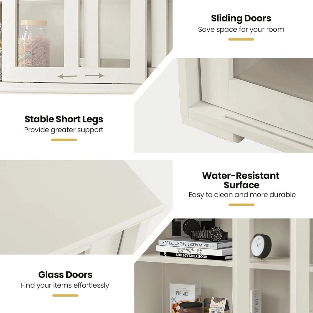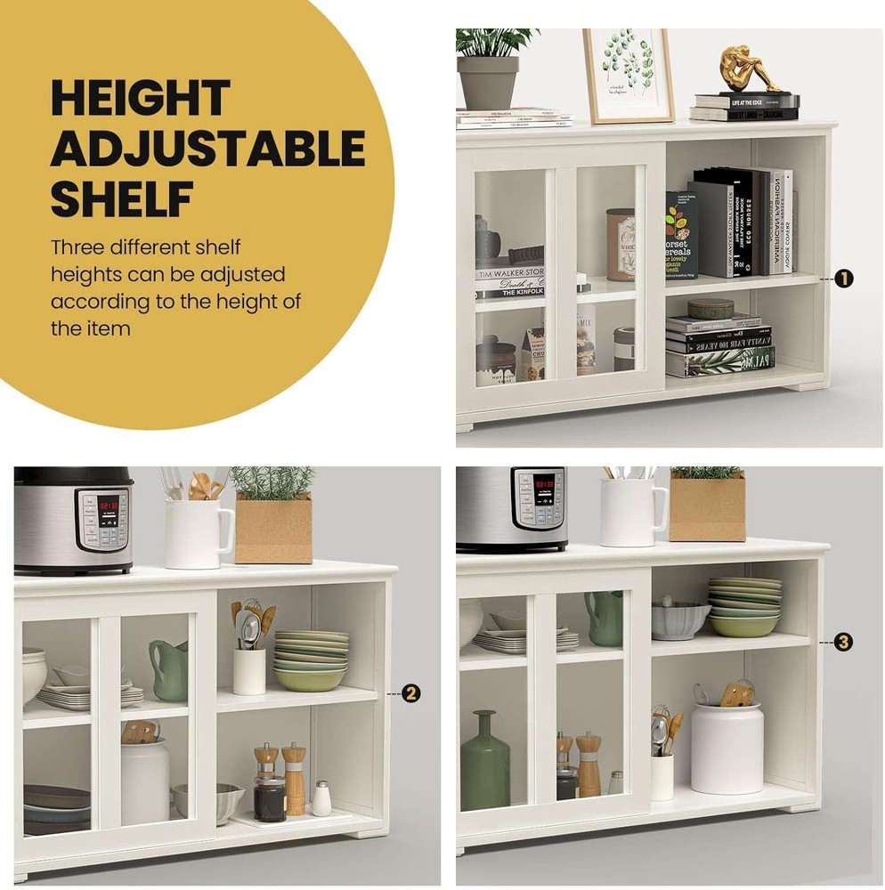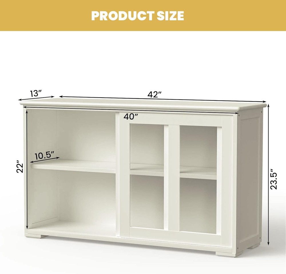 Product Description Buffet Cabinet with Sliding Slat Doors and Adjustable Shelf WELL - Instead of using a cardboard back, the back is actually 1/4" press board that matched the wood of the rest of the cabinet. The inside shelf was painted on all 4 edges and there were no raw sides. SLIDING SLAT DOOR - The doors were on rolling plastic wheels that were already attached to the doors but with a flick of a switch inside of each of the doors you are able to take the doors out of the cabinet. They roll very smoothly thanks both to the nylon wheel and the felt lining inside of the tracks. STORAGE SPACE - This cabinet help with some small appliance storage, cookie cutter storage, hand mixer, bundt pan, and basically anything that you use for baking on a semi regular basis that tends to get lost if it goes into a large cupboard. Sideboards And Buffets With Storage Nafort : Natural gift of comfort home. Nafort Kitchen Storage Sideboard - High quality MDF material, solid and durable. - Simple and fashionable design, suitable for dining room, kitchen, livingroom, etc. - Height-adjustable shelf meet more needs. Sliding Doors with Glass Sliding doors are very smooth to use The clear glass design on the 2 sliding doors allows you to quickly find the items you need Adjustable Shelf The shelf is adjustable in 3 heights The height of the shelf can be adjusted according to the stored items Moisture-proof Legs Cabinet is supported by short legs, not directly on the floor Short legs provide greater support and are effective against moisture Stackable Design The sideboard cabinet is stackable so that you can stack two or more cabinets vertically to get more storage space. Storage Space Double storage space with sliding doors Ideal for storing kitchen items such as dishes and glasses, also works as a bookshelf Product Size Overall size: 42.0”L*13.0”W*23.5”H NOTE: Please pay attention to the size of the product before purchasing! Sideboard And Buffet for Kitchen & Dining Room Specifications: Material: MDF Color: Cream White Overall dimension: 42.0”L*13.0”W*23.5”H Adjustable shelf weight capacity: 44 lbs Product weight: 45.4 lbs On Aug 11, 2025 at 00:00:25 PDT, seller added the following information: