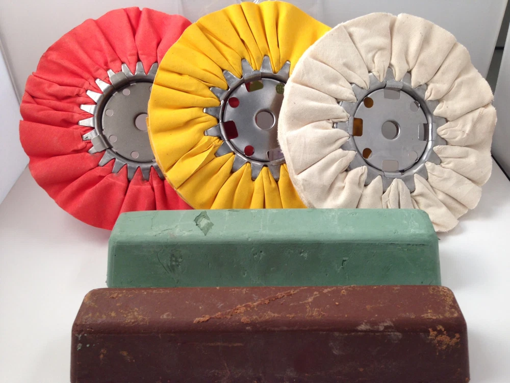 US SELLER AND PRODUCTS ARE MADE IN THE USA (BETTER QUALITY) LIMITED TIME ONLY - +1 FREE WHITE WHEEL FOR A TOTAL OF 6 PCS. These are brand new airway buffing wheels (3 pieces) and polishing compounds (2 pieces) direct from the manufacturer. Airway buffing wheels: are a versatile buff used for heavy-duty finishing of ferrous metals, nonferrous metals and plastics. Its construction has a self-cooling property and it exhibits longer life in high-speed buffing operations. It is the most popular buff used in the trucking industry. All the wheels are 8" with 5/8" arbor hole. Buffing stage: I: Orange - is use with tripoli/brown compound for initial cut-down operation II: Yellow - is use with green compound for one-step shine maintenance III: White - is use with green for final polishing Safety Precaution : To prevent serious injury in case buff falls apart, ALWAYS use a SAFETY FLANGE, such as a 4" cupped disc with 5/8" arbor hole. Polishing Compound : Tripoli - a brown color compound about 2 lbs. is use with orange wheel for first-step cut-down operation or use with white wheel for minor scratch/haze removal. Green - a light green color compound about 2-1/2 lbs. is use with white wheel for second-step finishing operation or with yellow wheel for one-step cut-and-finish operation. (shine maintenance). Supplies are limited. Seller makes no warranty, express or implied, nor accepts responsibility for any direct or consequential damages beyond purchase price, because seller cannot control user's handling, end of use or effect of use . SAFETY FIRST! Fast USPS Priority mail shipping