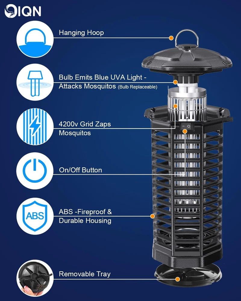 Effectively reduce mosquitoes around your home -electric bug zapper uses a 15W UVA light to attract mosquito, aedes, gnats, midges, flies, horse flies, fruit flies, house flies, moths, wasps and most small flying insects and kills them via 4200V high-efficiency electric shock once they contact the electric grid. It works indoor and outdoor covering more than 1500 square feet, ideal for your porch, back yard, patio, swimming pool, kitchen, living room, garden, deck or garage etc. Easy to use -mosquito zapper outdoor is well prepared with a 5.6ft long cord, just plug in then it start to work. There’s a switch on the outdoor bug zapper which can be used to turn on or off this mosquito trap without unplugging it. An extra metal chain hook is equipped except for the hanging hoop on the top so that you can have more options to hang or put it indoor or outdoor. It’s lightweight and portable to move around. Safe to use -APE, FCC and UL certified, three-layered security protection -A. The housing is made of ABS - sturdy, durable and fireproof; B. Horizontal isolation baffles with 0.23 inch gap can effectively protect people or pets from accidental contact while doesn't block mosquitoes from flying in; C. Short-circuit protection -positive and negative electrode alternating design with small intervals, power will be off immediately in case that object contact both positive and negative electrodes. Easy to clean -Please turn off or unplugging the insects zapper before cleaning. Insects debris will fall into the removable tray at the bottom, you can twist and take the tray out, we suggest cleaning it one time a week at least. Use the brush to clean dust or mosquito debris on housing or grid. What’s in the box -1 bug zapper with bulb and 5.6ft cord, 1 metal chain with hook, 1 brush and 1 user manual -all of them are put in gift-box. All products are safety certified and manufactured under strict quality control standard but bulb can be loose or damaged during transportation. Please don’t hesitate to contact us for a replacement, making you a happy customer matters to us.