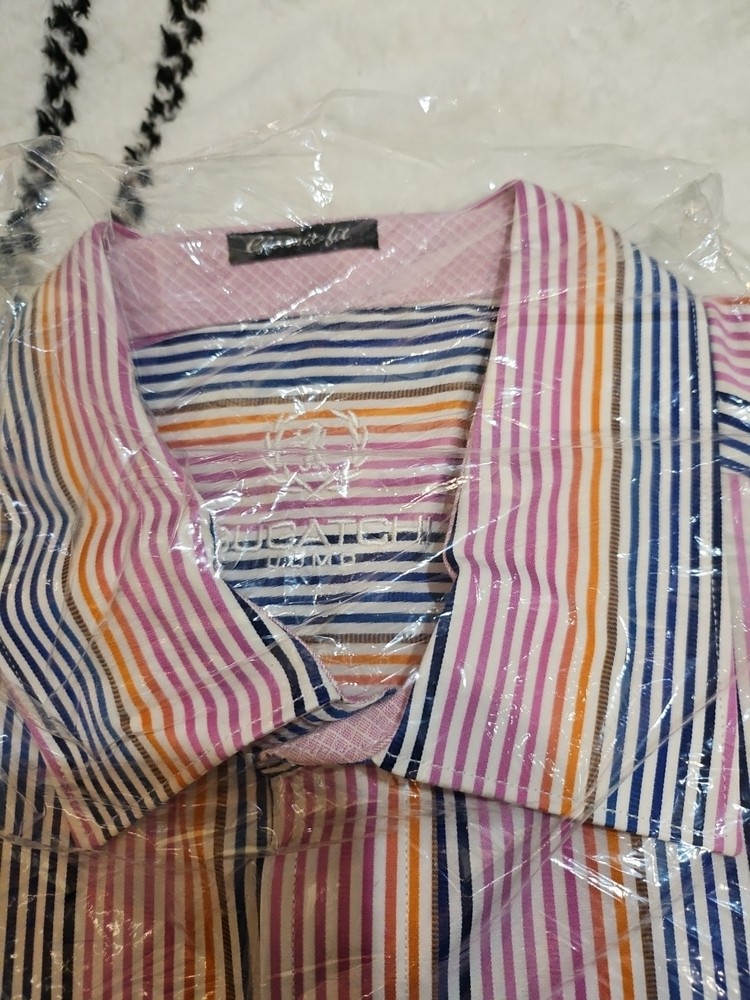 Step out in refined style with this Bugatchi Uomo men's dress shirt in a vibrant vertical stripe pattern. Features a classic fit with crisp lines, spread collar, and long sleeves. High-end quality with signature details from a luxury menswear brand. Ideal for both professional settings and upscale casual looks. Still in original packaging, appears to be new and unworn.