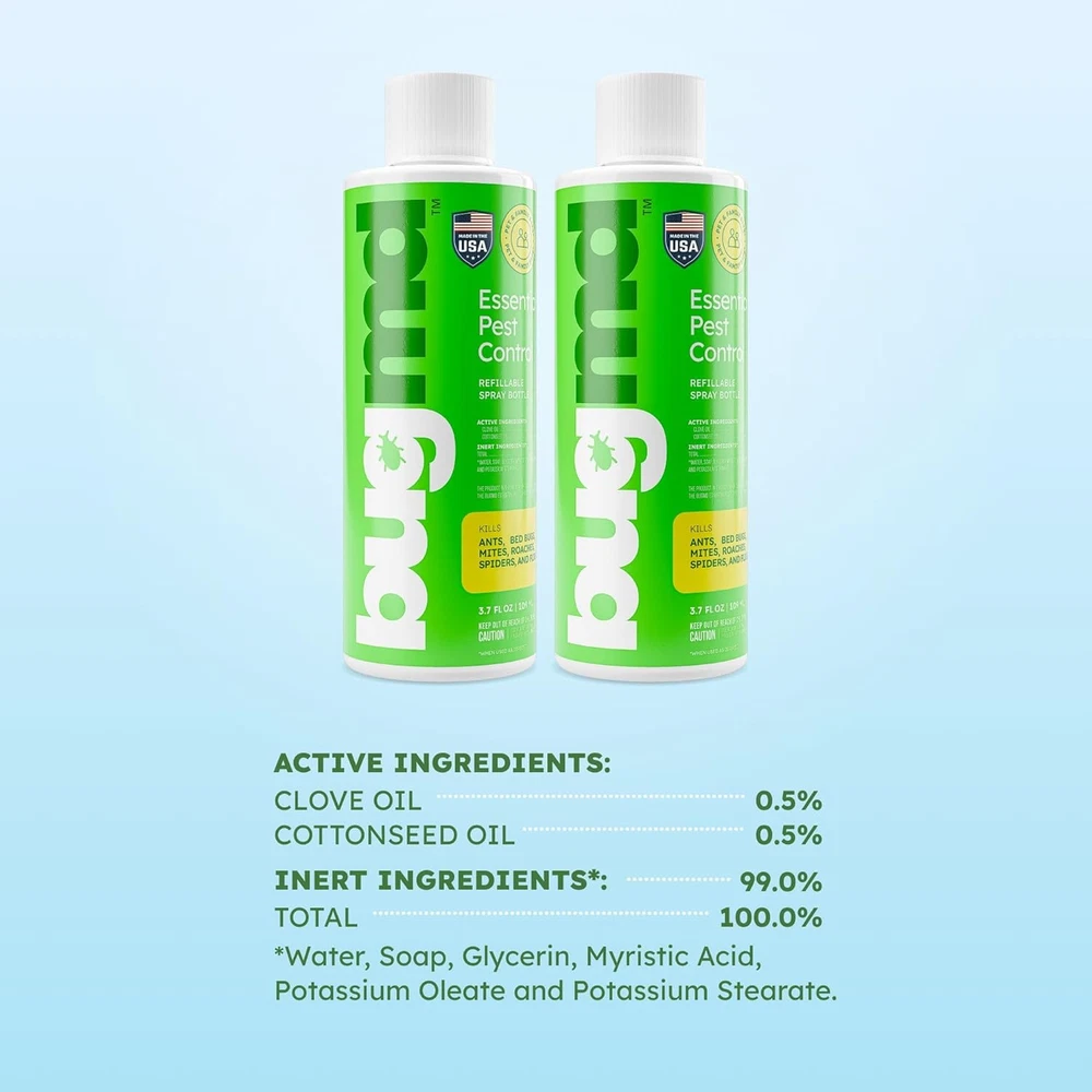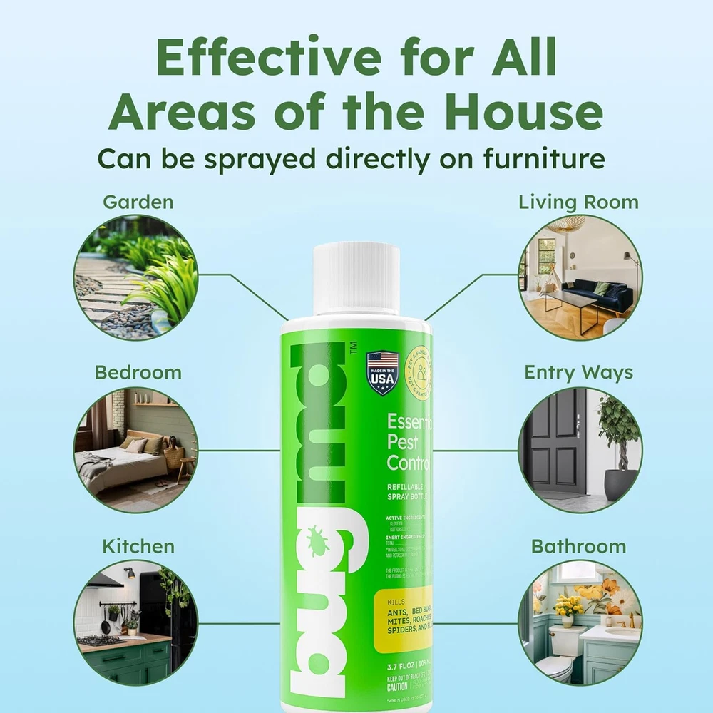 Eliminate Home Invading Pests: bugmd is the effective way to target hundreds of indoor and outdoor pests, including ants, mosquitoes, roaches, mites, moths, spiders, and more. This essential oil-powered spray is the perfect solution to keep your home, yard, and other spaces pest-free without sacrificing your family's health and safety (when used as directed). One small concentrate bottle is all you need to create a 32 oz bottle of pest control spray that can easily be sprayed in and out of the home, including bathrooms, bedrooms, kitchens, baseboards, sheds, cabinets, gardens, and outdoor areas. Simply add your full Essential Pest concentrate to 27 oz of cold water into a bugmd Essential “Forever” Spray bottle, shake, and spray. Plant Powered Formula: bugmd utilizes the power of plant oils such as cottonseed oil and clove oil. bugmd doesn’t contain any harsh chemicals, so it's better for you and your family while you effectively control pest invasions. bugmd is good to use on wood, carpet, and fabrics. Fast Acting Formula: Our essential oil-based spray kills some species in seconds and eliminates many within 30 minutes. Plus, bugmd can even work on some species known to have resistance to typical insecticides and sprays. Utilize this versatile formula as often as needed to quickly and safely defend your home (when used as directed). Effectively Protect Your Home: Our multi-use pest control spray effectively kills insects at all stages of their lifecycle. From eggs to larvae to adults, our formula powerfully eliminates pests on contact at any stage. Works great as an effective cockroach killer indoors and outdoors. Product Description 1 FOR DOZENS OF BUGS 2 FAMILY-FRIENDLY 3 SUPER EASY 4 VERSATILE 5 GARDEN USE BUGMD Add to Cart Add to Cart Add to Cart Add to Cart Customer Reviews 4.0 out of 5 stars 8,040 4.0 out of 5 stars 17,753 3.9 out of 5 stars 2,846 3.9 out of 5 stars 2,846 Price $18.50 $ 18 . 50 $31.59 $ 31 . 59 $34.99 $ 34 . 99 $19.99 $ 19 . 99 PEST 46 Household Insect Species 46 Household Insect Species Fleas, Ticks, Mites Fleas, Ticks, Mites FEATURES Neutralizes Pests On Contact Neutralizes Pests On Contact Eliminates Flea/Tick instantly Eliminates Flea/Tick instantly INCLUDES SPRAY BOTTLE ✘ ✔ ✔ ✘ PEOPLE & PET FRIENDLY ✔ ✔ ✔ ✔ 30-DAYS RETURN ✔ ✔ ✔ ✔