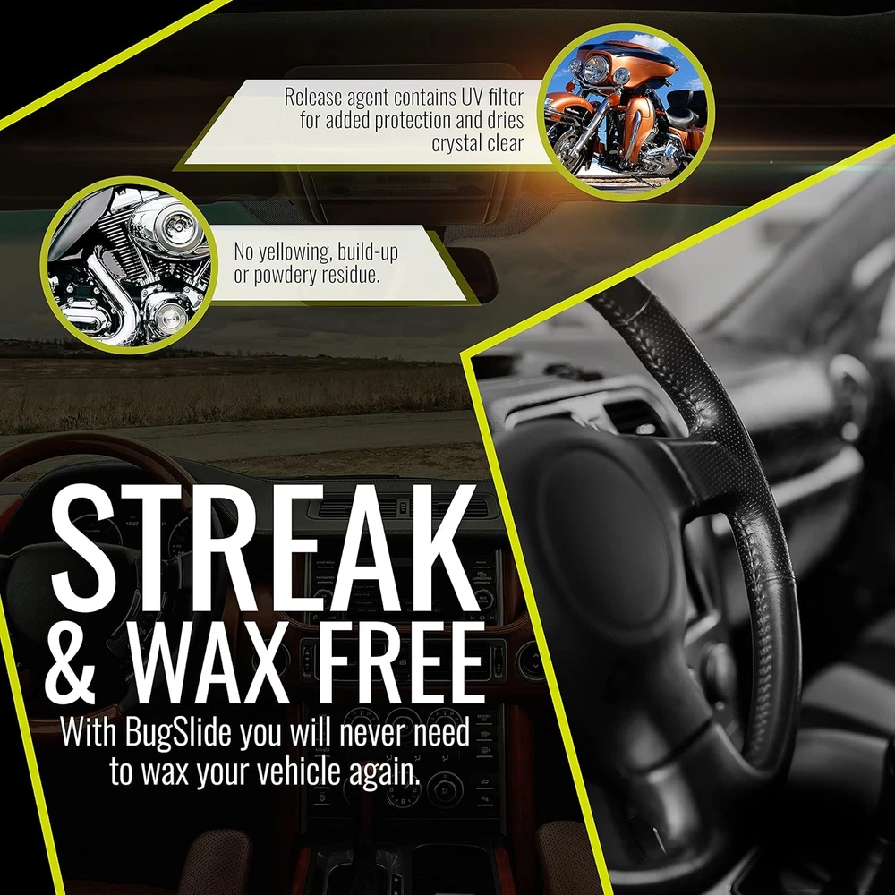 Store New Arrivals Add to Favorite View Feedback Contact Bugslide 16 Oz Shop Kit Cleaner and Polisher with Microfiber Towel, Tree Sap Remover, Waterless Detailer for Removing Bugs without Scratching, Shining and Degreasing All Surfaces Description Grit Number 180 Item Weight 12.8 ounces Item dimensions L x W x H 5.5 x 3 x 14.5 inches Number of Items 126 Compatible Material Aluminum, Glass, Plastic Brand BugSlide Material Aluminum Manufacturer Part Number BSK-16 Grit Material Plastic Global Trade Identification Number 00854740003049 Item model number BSK-16 Special Features Non-toxic Manufacturer BugSlide Is Discontinued By Manufacturer No Product Dimensions 5.5 x 3 x 14.5 inches Size 16 Oz Shop Kit All-In-One-Cleaner– Care for your vehicles year-round with Bugslide's cleaning spray. Use on your vehicle's body, mirror, window, windshield and more for ultimate shine. Solution is completely waterless, scratch free and cleans bugs and other surface contaminants with ease. Works on Multiple Surfaces – Bugslide's car cleaning solution is safe, all-purpose, and used to polish all non-porous surfaces including paint, chrome, glass, fiberglass, acrylic, aluminum, plexiglass, plastic, Lexan, vinyl, and leather. Works well on cars, RVs, campers, trailers, motorcycles, boats, ATVs and more. Streak and Wax-Free – With Bugslide’s car cleaner, you will never need to wax again. Applied and paired best with the included microfiber cloth to wipe clean, the release agent in the spray bottle contains a UV filter for added protection and dries crystal clear with no yellow tint, film, build-up or powdery residue. No Harsh Chemicals – BugSlide's non-toxic cleaning spray is body shop safe and contains no wax, petroleum, silicone, Teflon or ammonia. A finish that removes dust, dirt, water, and fingerprints, it's a must-have car detailing and cleaning product. One Step Cleaner – The ideal addition to your car accessories, this spray bottle is easy to use. Simply spray directly on a surface, let sit for 30-60 seconds, wipe, then flip the microfiber cleaning cloth to dry side and lightly buff. Can be used in direct sunlight. Product Description Safe to use on all types of vehicles Free of wax, petroleum, silicone, Teflon, or harsh chemicals BugSlide offers 100s of uses. It is great for cleaning and polishing, while leaving a protective, microscopic coating on motorcycles, ATVs, farming equipment, cars (inside and out), boats, mirrors, stainless steel, marble, granite and quartz counter tops, tv screens, computers, and much more. BugSlide is a completely waterless detailer that cleans, shines and degreases while removing bugs and other surface contaminants with ease. BugSlide leaves a protective, microscopic finish that continuously repels dust, dirt, water and fingerprints. Never wax again! BugSlide is body shop safe and contains no wax, petroleum, silicone, Teflon or ammonia. BugSlide is free of abrasives and is safe on all non-porous surfaces including; paint, chrome, glass, fiberglass, acrylic, aluminum, plastic, vinyl, leather, Plexiglas and Lexan. Don't Ride Without The Slide BugSlide is a complete waterless detailer that cleans, shines and degreases while removing bugs and other surface contaminants with ease. BugSlide leaves a protective, microscopic finish that continuously repels dust, dirt, water and fingerprints. Never wax again! The release agent in BugSlide makes clean up quick and easy. BugSlide contains a UV filter for added protection and dries crystal clear with no yellowing, no build-up and no powdery residue. BugSlide is body shop safe and contains no wax, petroleum, silicone, Teflon or ammonia. BugSlide is free of abrasives and is safe on all non-porous surfaces including; paint, chrome, glass, fiberglass, acrylic, aluminum, plastic, vinyl, leather, Plexiglas and Lexan. BugSlide offers 100s of uses. It is great for cleaning and polishing, while leaving a protective, microscopic coating on motorcycles, ATVs, farming equipment, cars (inside and out), boats, lawn mowers, mirrors, stainless steel, marble, granite and quartz counter tops, television screens, computers, laptops, cell phones, GPS screens, musical instruments and much more. Safe to use multiple surfaces including Lexan, glass, fiberglass, plexiglass, chrome, stainless steel, aluminum, leather, vinyl and any non-porous surfaces. Free of wax, petroleum, silicone, Teflon or harsh chemicals. Leaves a protective, microscopic finish that continually repels dust, dirt, water and fingerprints. Contains a UV filter for added protection, dries crystal clear with no yellowing, no buildup or powdery residue. Proudly made in USA. BugSlide Products to Fit Your Needs Add to Cart Add to Cart Add to Cart Add to Cart Add to Cart Customer Reviews 4.6 out of 5 stars 1,632 4.8 out of 5 stars 2,082 4.7 out of 5 stars 94 4.6 out of 5 stars 371 4.7 out of 5 stars 491 Price $28.99 $ 28 . 99 $40.99 $ 40 . 99 $10.99 $ 10 . 99 $69.99 $ 69 . 99 $14.99 $ 14 . 99 Wax-Free ✔ ✔ ✔ ✔ ✔ Spray Bottle ✔ ✘ ✘ ✔ ✔ Travel Size ✘ ✘ ✘ ✘ ✔ Made in USA ✔ ✔ ✔ ✔ ✔ UV Filter ✔ ✔ ✔ ✔ ✔ Refill Bottle ✘ ✔ ✘ ✔ ✘ ABOUT US We offer the best prices around on high quality products. Our E-store includes media such as books, movies, music and games while offering electronics, toys, sporting apparel, clothing, tools, general home, garden items and more. SHIPPING We are always working hard to ensure your package arrives as soon as possible. Please understand that some factors like weather, high postal traffic, and the performance of shipping companies are outside of our control. We offer free shipping to the lower 48 states and ship within 2 business days of payment, usually sooner. We do not accept P.O. Boxes. Please provide a physical address. RETURNS We offer a 30-Day Return Policy on items which you are not completely satisfied with. You have the option for a full-refund or an exchange of the item. No returns are availabl