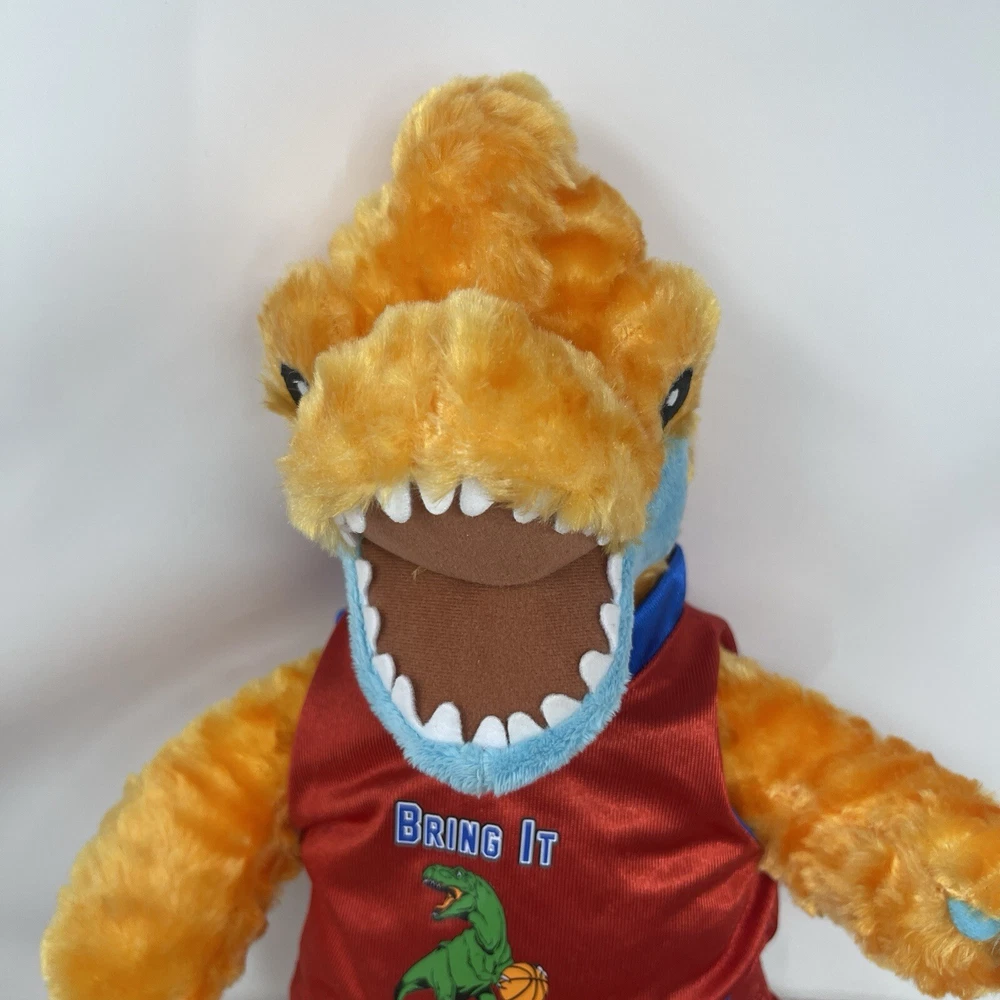 This Build-A-Bear Workshop plush toy is a limited edition Brachiosaurus dinosaur character dressed in a basketball-themed outfit. The 18-inch orange plush bear features a blue shirt, shorts, shoes, and jersey, making it an adorable and unique addition to any plush toy collection. With machine washable material and a retired status, this 2019 release is perfect for dinosaur enthusiasts or fans of Build-A-Bear Workshop's special editions. FULLY CLOTHED RARE