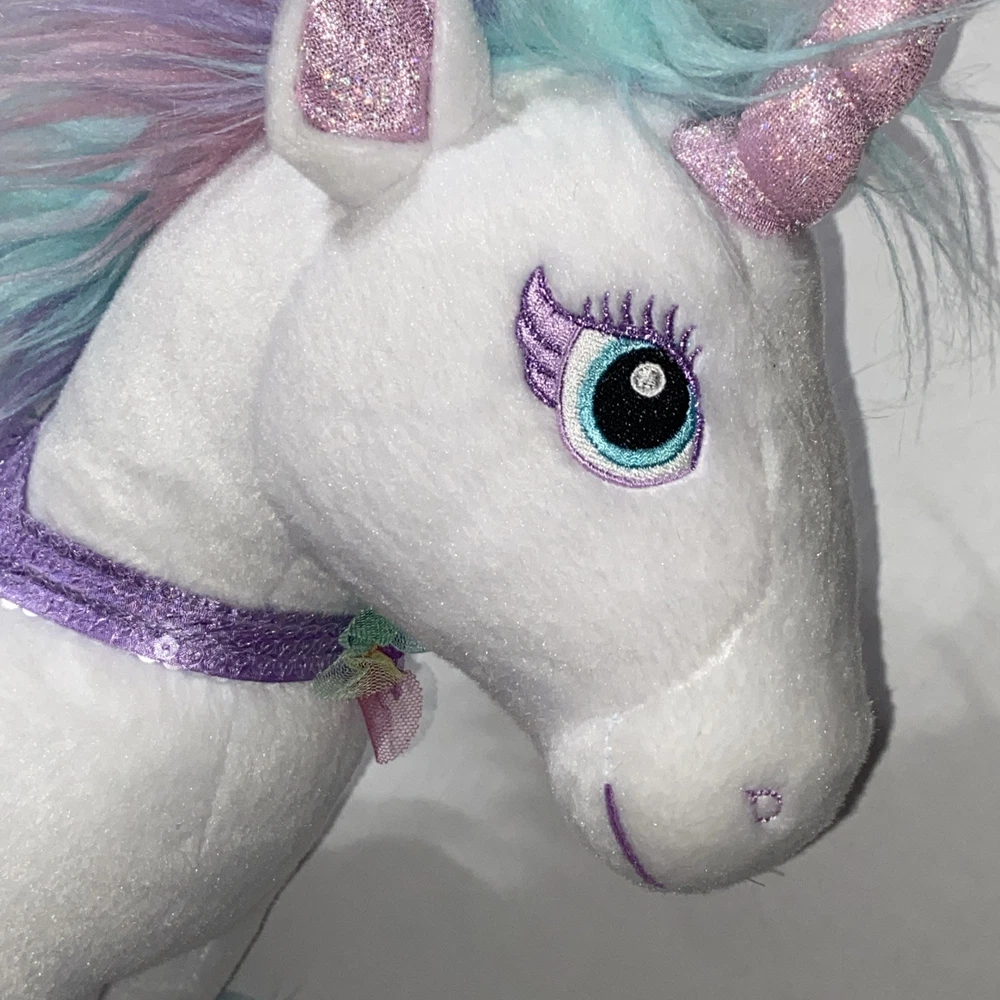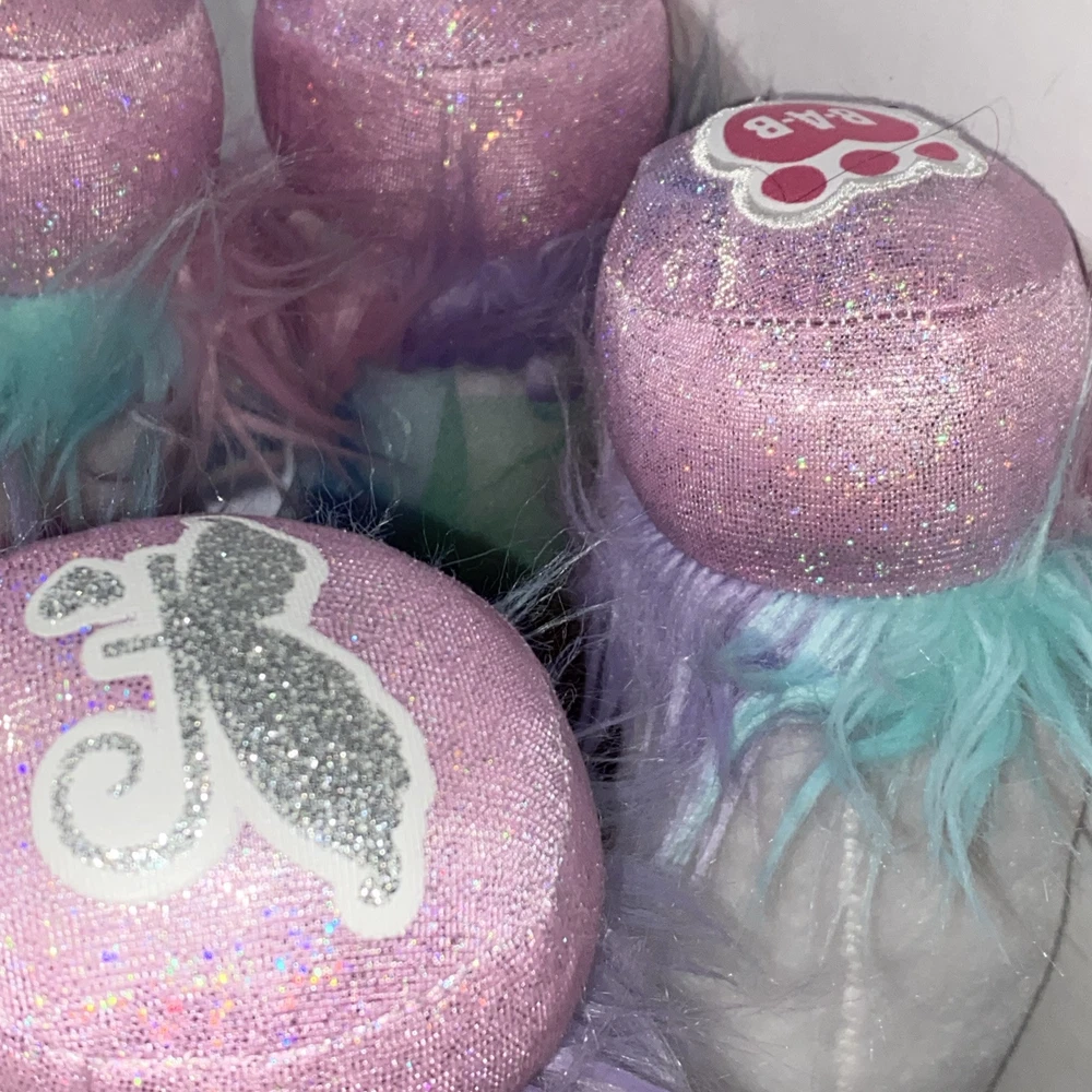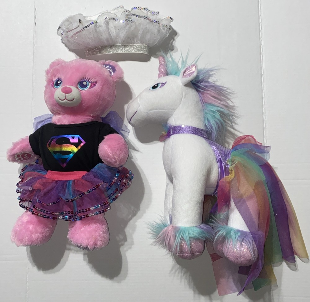 Two adorable Build A Bear Workshop BAB large Fairy Friends plush. The enchanted Unicorn in rainbow is fully dressed and has an extra tutu. It plays a version of “Girls Just Wanna Have Fun”. Pink Bear has a few different sayings when her button is pressed. She is wearing the rainbow Batman outfit. Both are clean and free of holes, stains, or smells.