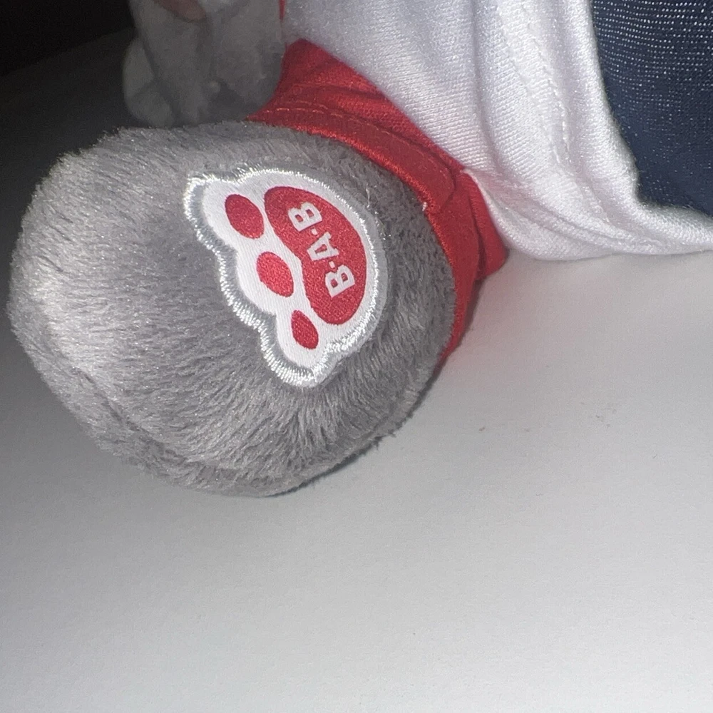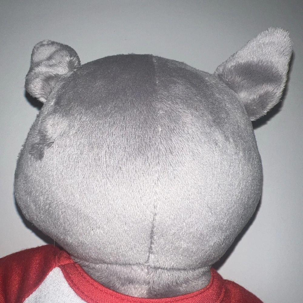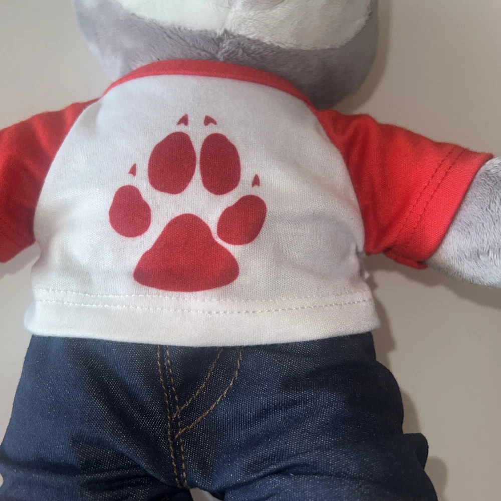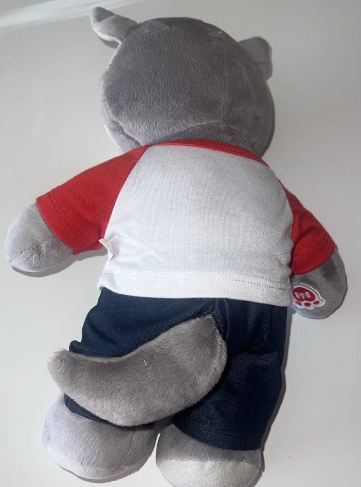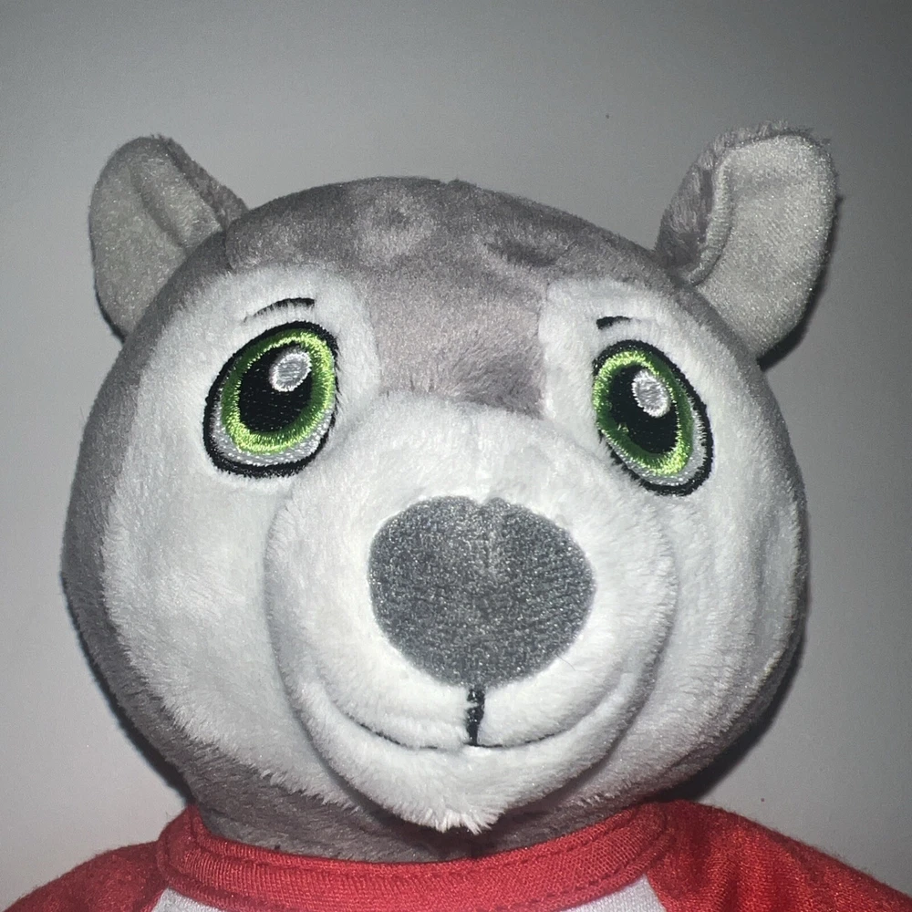 This is a 12" Build-A-Bear Workshop plush bear named Wiley the Wolf from the Great Wolf Lodge franchise. The bear has green eyes and comes with a shirt and pants. It is not antique or vintage, and is suitable for children aged 3-4 years. This non-signed bear is gray in color and is not personalized. It is an original creation, not a licensed reproduction, and is made of plush material. The bear is from China and does not come with packaging.