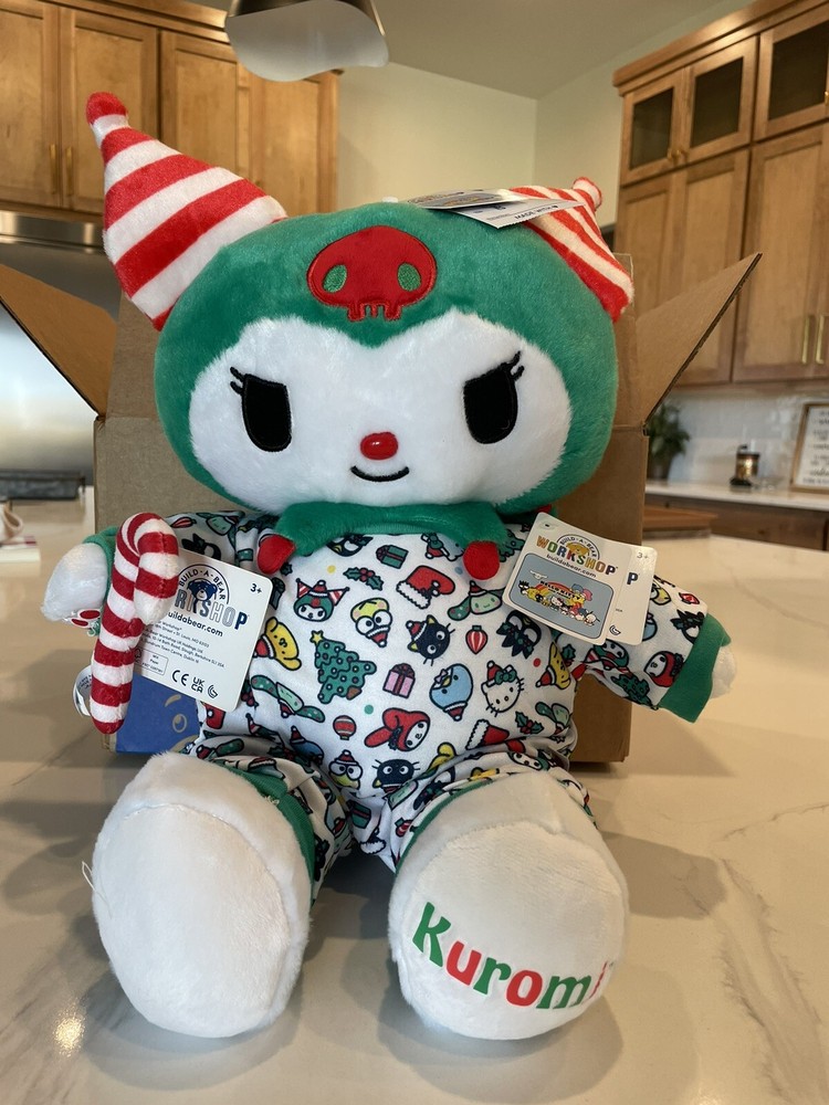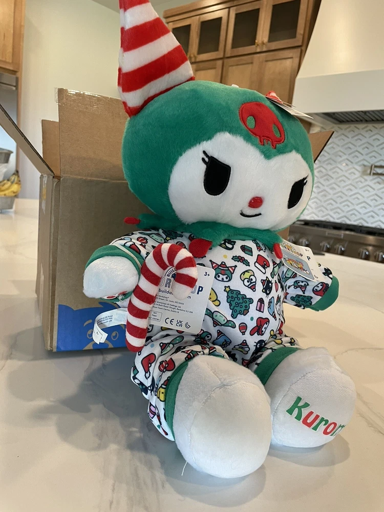 Get ready for the holiday season with this adorable Build-A-Bear Workshop Kuromi plush toy! This cuddly friend is dressed in festive holiday pajamas and holding a delicious candy cane. With her black and white color scheme and Hello Kitty character family, she is the perfect addition to any stuffed animal collection. This brand new plush toy is perfect for Christmas occasions and is sure to bring joy to any child or adult alike. Don't miss out on the chance to add this cute and charming Build-A-Bear Workshop Kuromi to your collection! Brand new with tags!!
