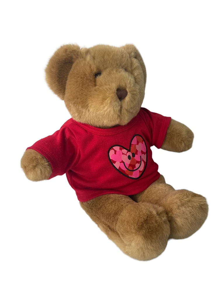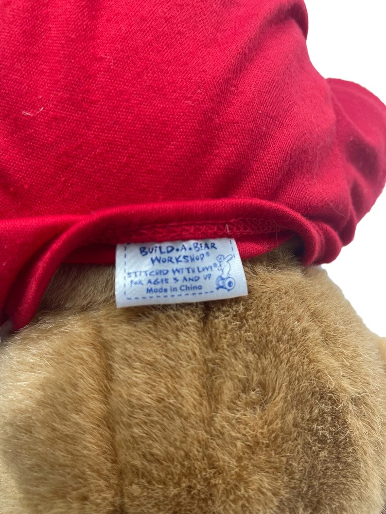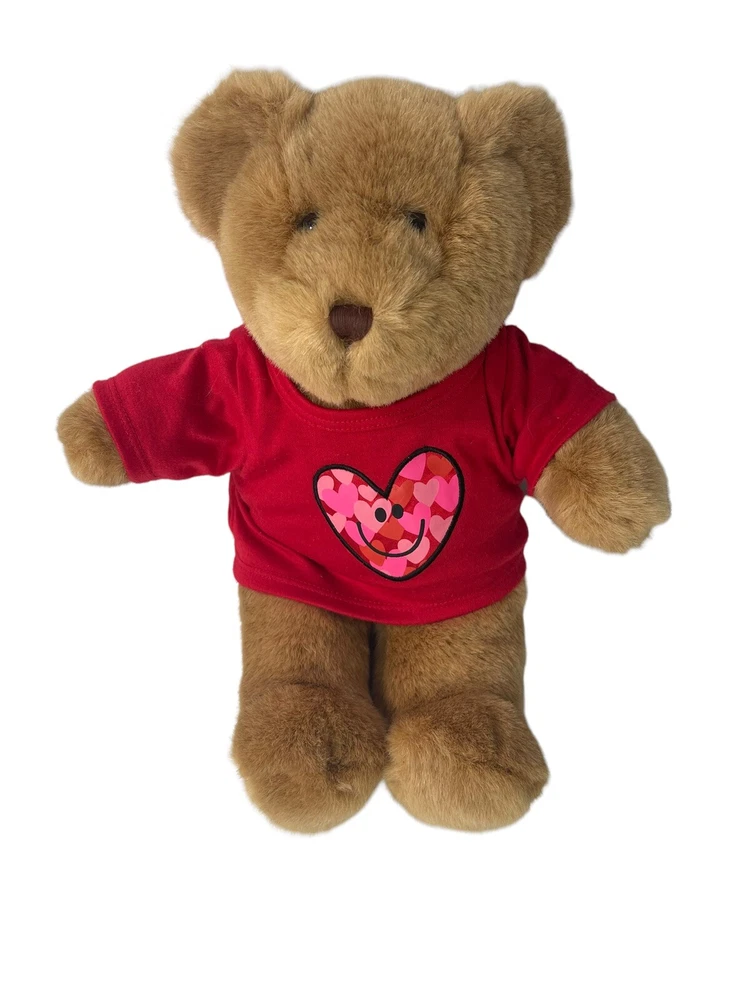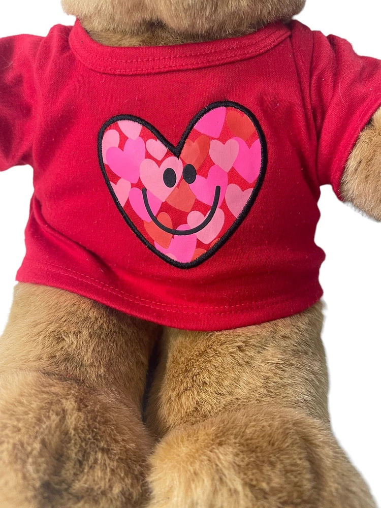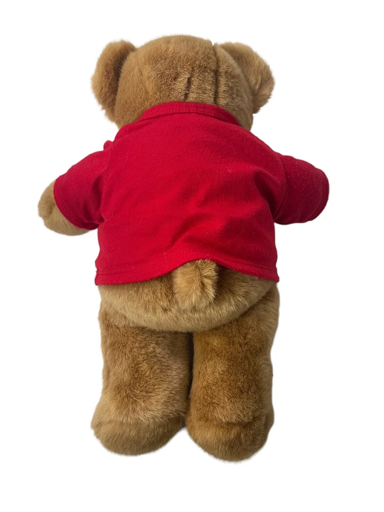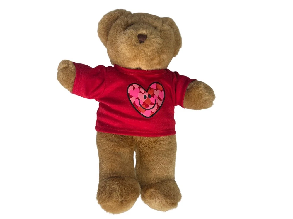 Build A Bear Plush Light Brown Teddy Bear, Stuffed Animal Toy. Bear wearing a red tsihrt with smiley face heart applique. Dimensions: Sitting Up 10", Laying Down 15". Condition is Gently Pre-Loved. Light Sign of Use. No Tears, Holes, Stains or Flaws. See photos as part of description. Item will ship USPS First Class Mail B1043