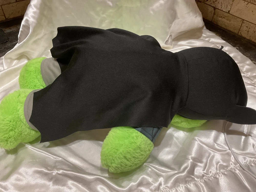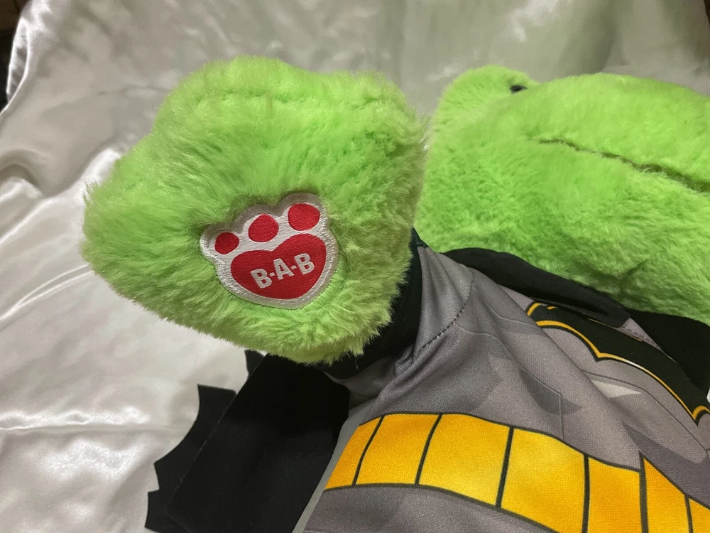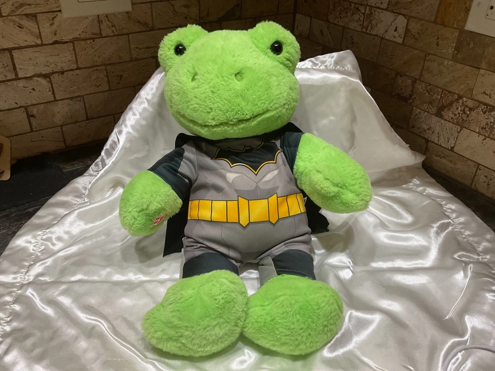 Embrace the whimsy of spring with the Build-A-Bear Workshop's charming 16-inch plush frog, clad in an adorable Batman outfit. This delightful stuffed animal features a vibrant spring green color, complemented by sleek black eyes, capturing the essence of the much-loved character. Crafted from soft, plush material, this frog is a perfect companion for all occasions. It comes complete with clothing, including the Batman costume, and is part of the current 2020-now collection. Whether for play or display, this original, non-antique Build-A-Bear creature is a unique treasure for collectors and fans alike.