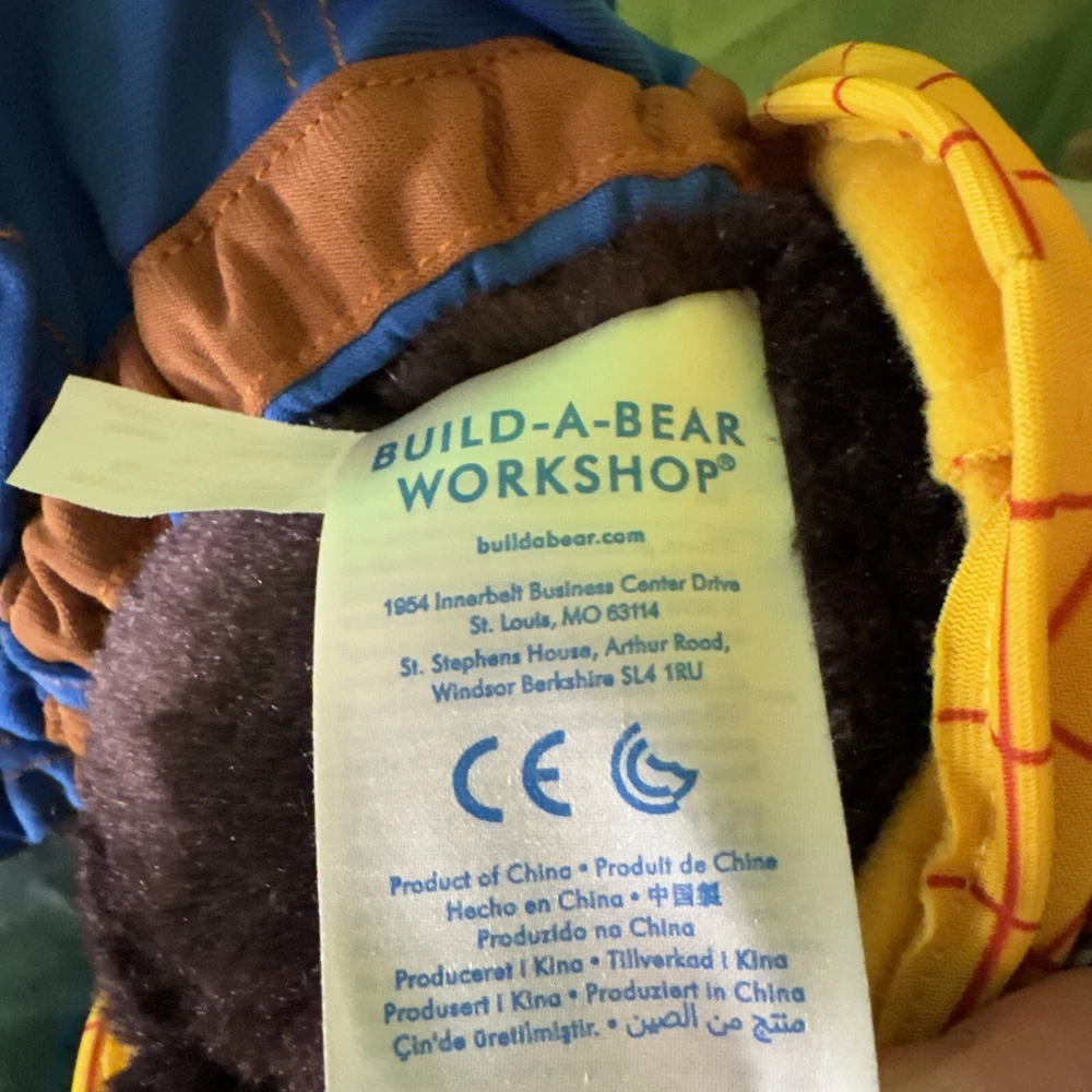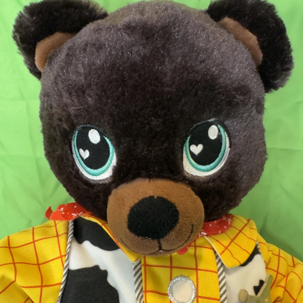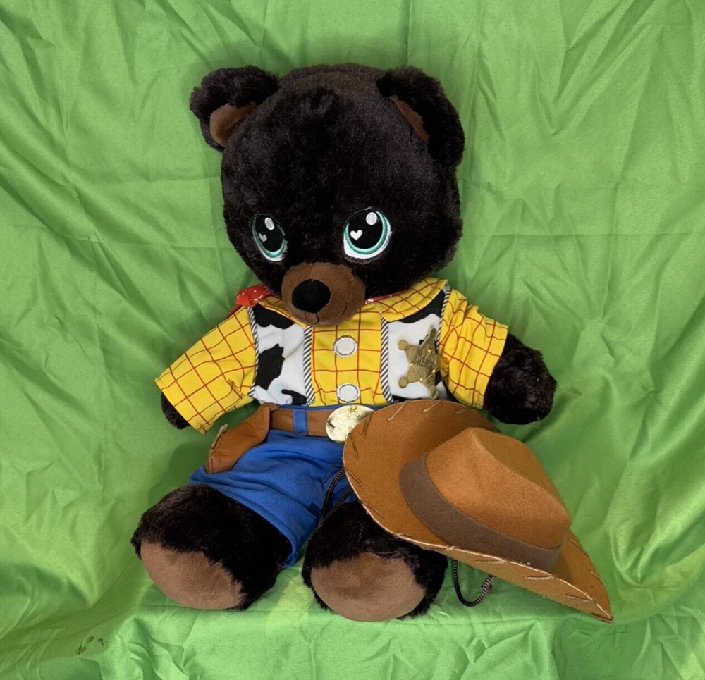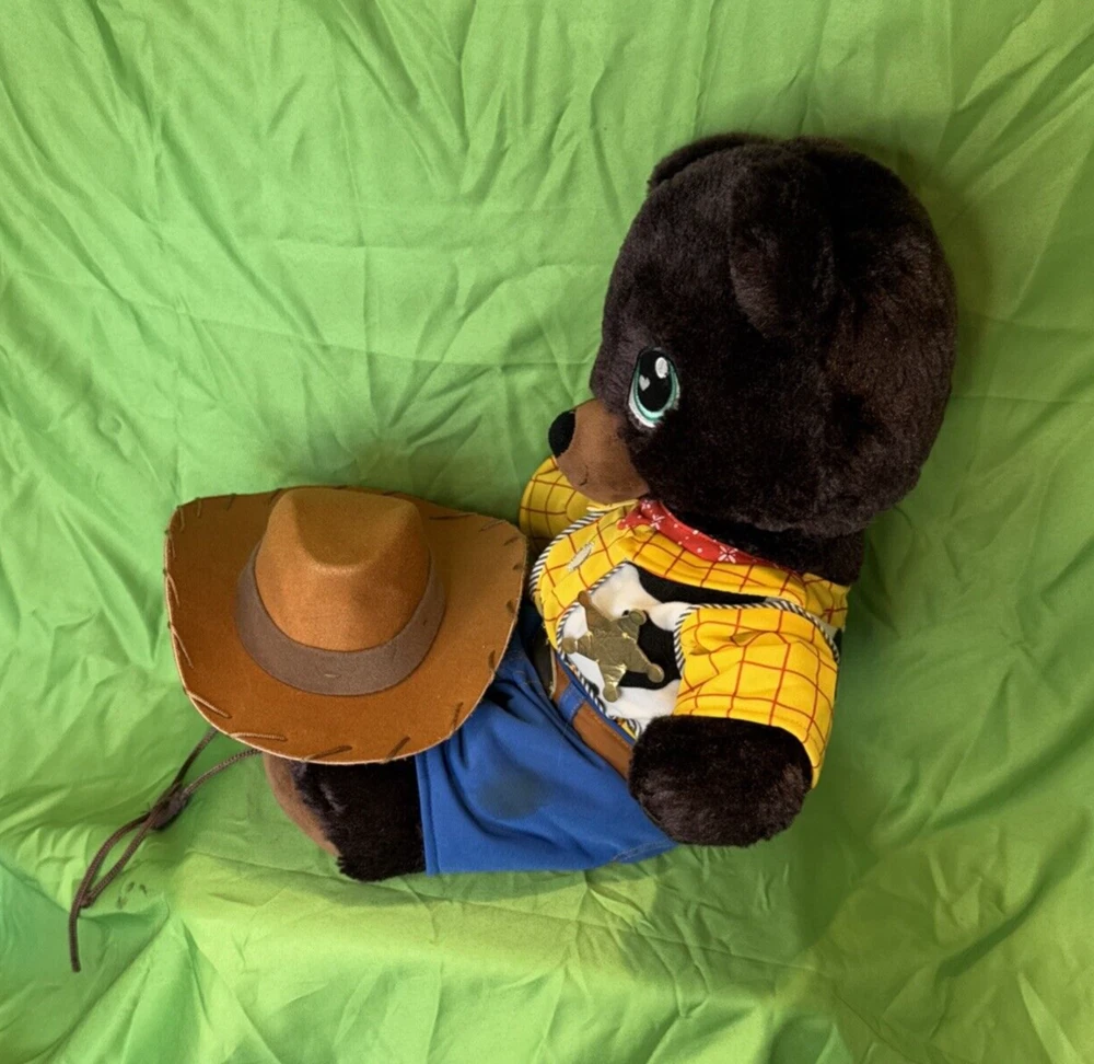 This is a 16-inch Build-A-Bear Workshop plush toy featuring Sheriff Woody from the Disney Pixar Toy Story franchise. The bear is brown and includes clothing and accessories such as a shirt, pants, hat. The set also includes a custom bundle of items and is recommended for children ages 3 and up. The plush toy was manufactured in 2016 and is an original licensed reproduction.