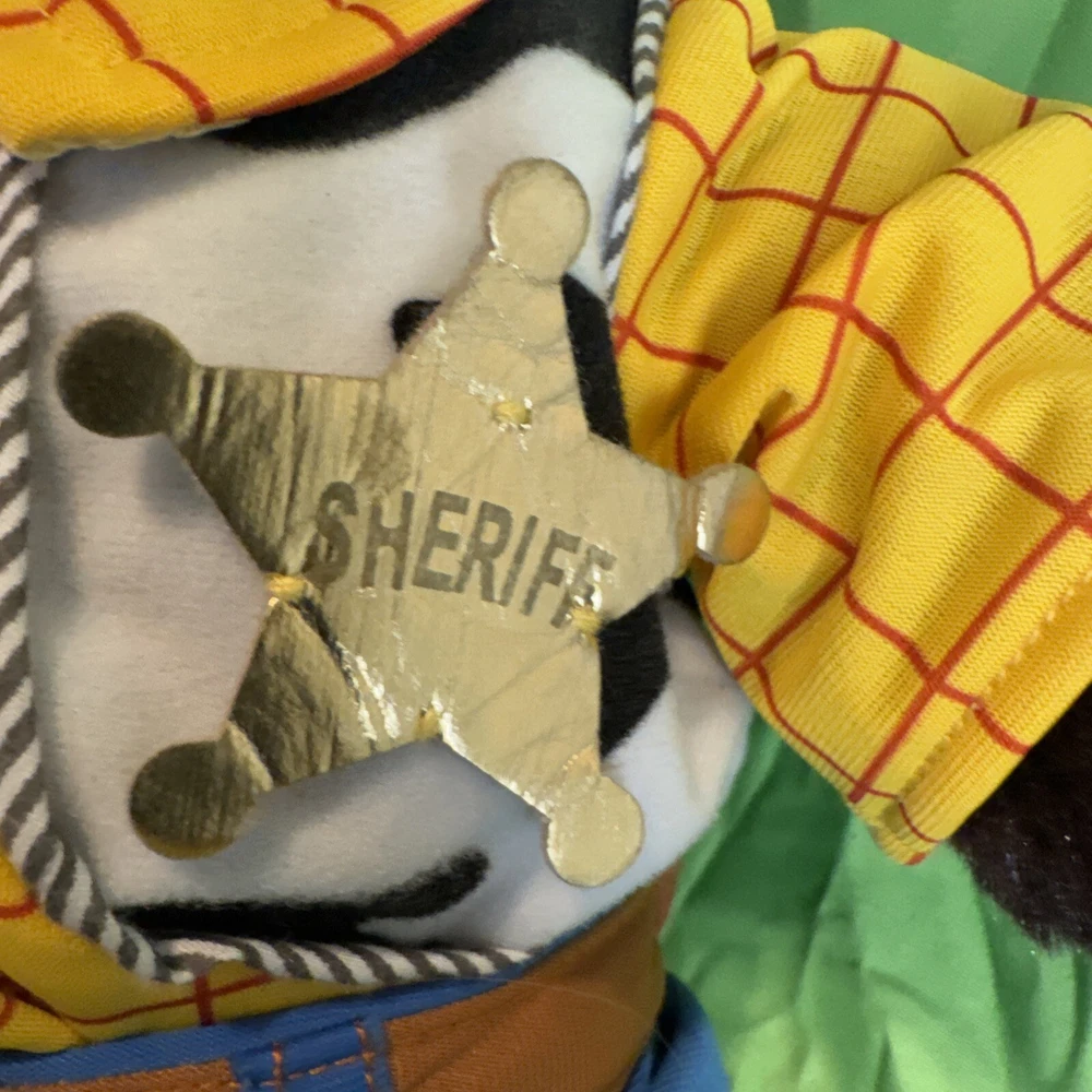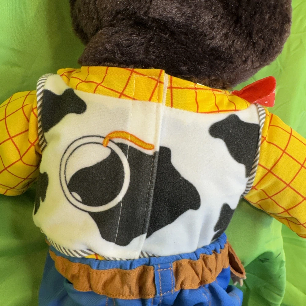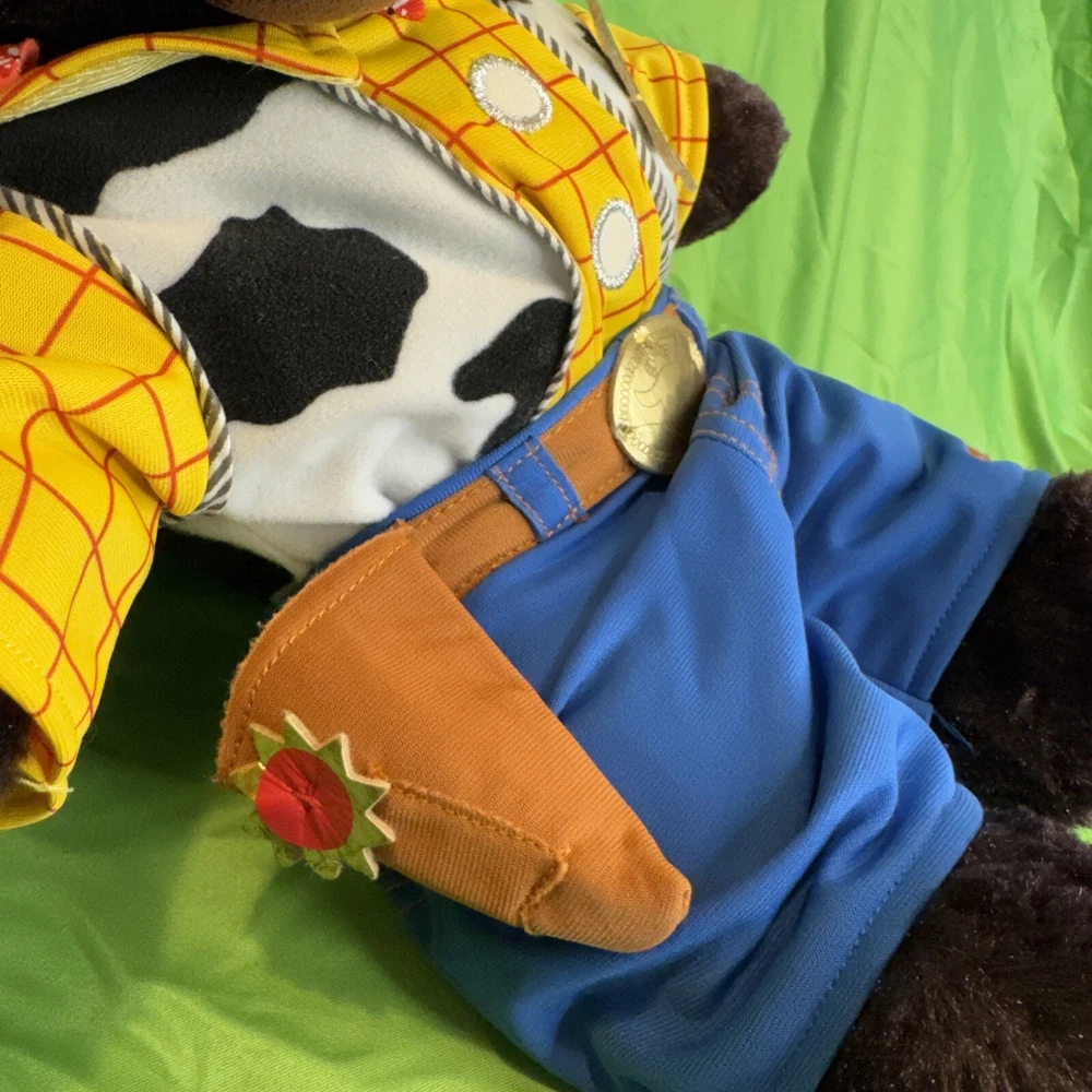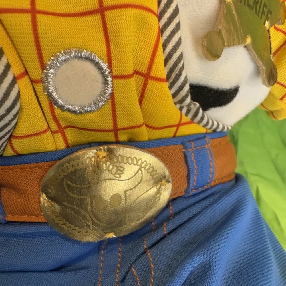 This is a 16-inch Build-A-Bear Workshop plush toy featuring Sheriff Woody from the Disney Pixar Toy Story franchise. The bear is brown and includes clothing and accessories such as a shirt, pants, hat. The set also includes a custom bundle of items and is recommended for children ages 3 and up. The plush toy was manufactured in 2016 and is an original licensed reproduction.