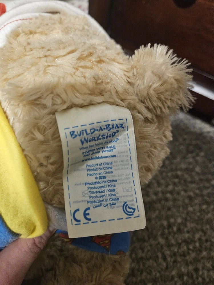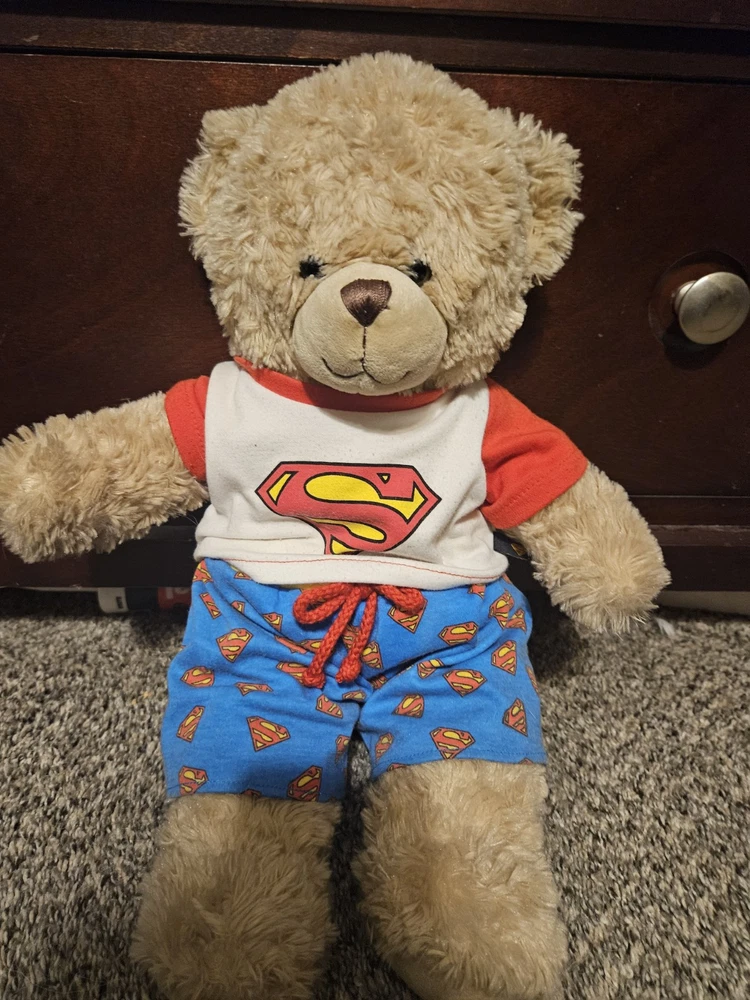 This lovely plush bear from Build-A-Bear Workshop is dressed in Superman pajamas and is the perfect addition to any collection. The bear is 18 inches in length and 8 inches in width, with black eyes and a friendly expression. It comes with a Superman onesie, hat, and pants, all made of high-quality plush material. This rare and retired item was manufactured in 2012 in China and is in excellent condition.