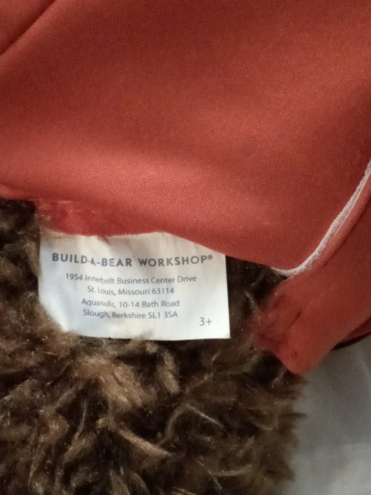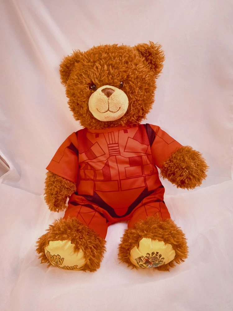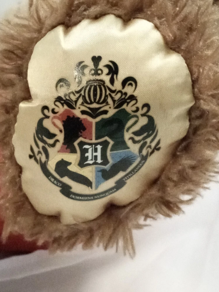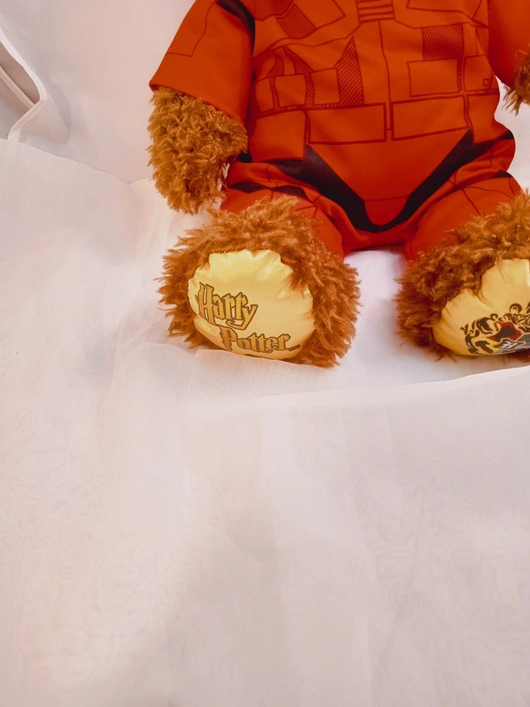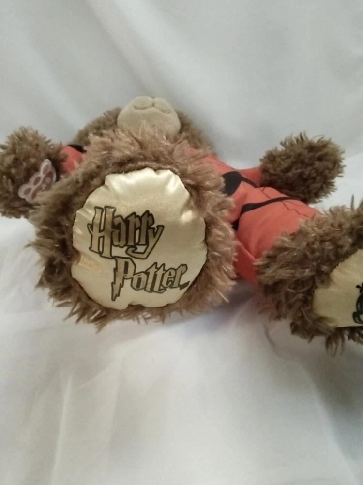This is a Build-A-Bear Workshop plush bear from the Wizarding World of Harry Potter collection. The bear has black eyes and a multicolor fur. It comes with a drawstring bag and is 16 inches in size. Released in 2019, this original plush bear is part of the Harry Potter themed collection, perfect for all occasions.