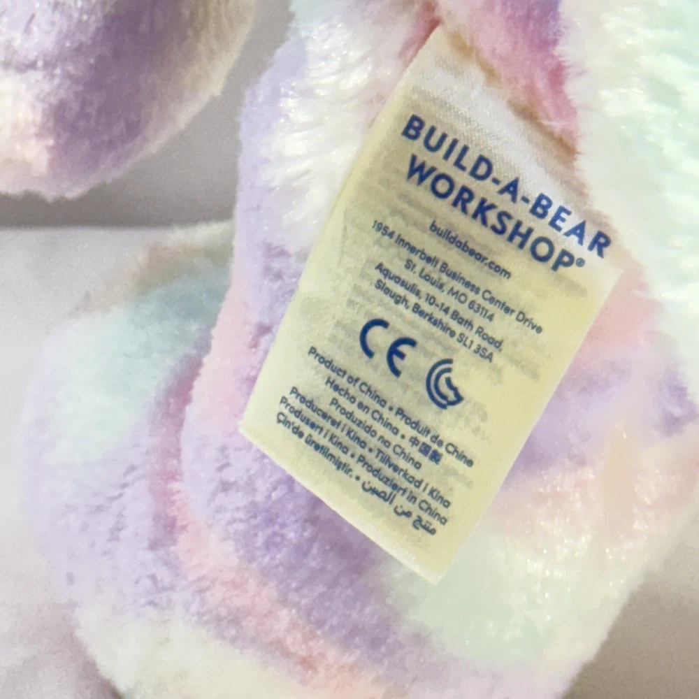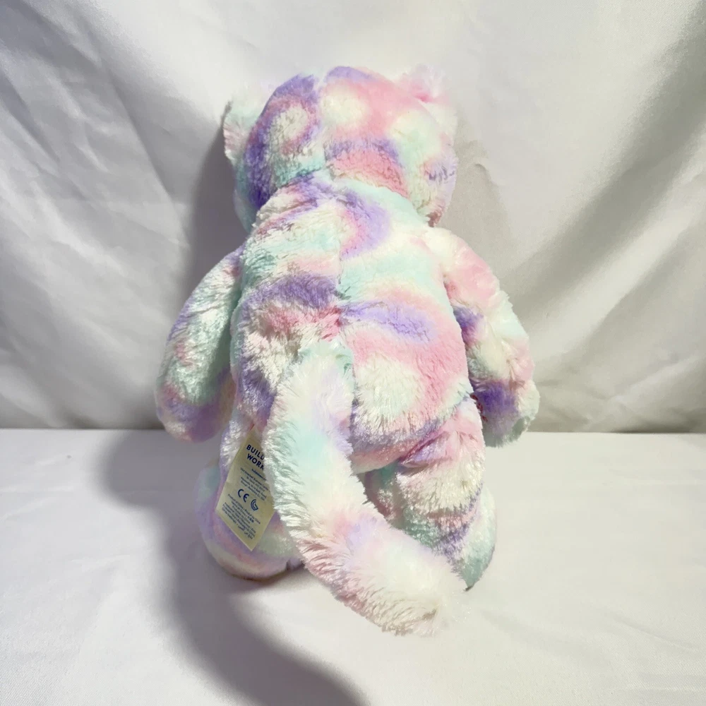 This is a 17-inch Build-A-Bear Workshop stuffed animal cat with pastel tie-dye pink and purple swirl plush. It has purple eyes and is retired from the Rainbow collection. The cat is made of plush material and is an original, licensed reproduction from Build-A-Bear. It is without packaging and was manufactured in 2017 in the United States.