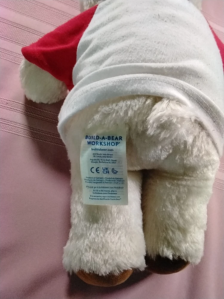 There is some pilling on the shirt. This adorable white plush bear from Build-A-Bear Workshop comes with a cozy Hugs T-Shirt, perfect for snuggling up with. The bear stands at 15 inches tall and has beautiful brown eyes. Made from soft polyester material, this original Build-A-Bear is perfect for any bear lover. As part of the Build-a-Bear franchise, this plush bear is a must-have for any collector or fan. It was manufactured in 2021 and is an original piece. The bear is in excellent condition and ready for a new home. Don't miss your chance to add this cute and cuddly bear to your collection!