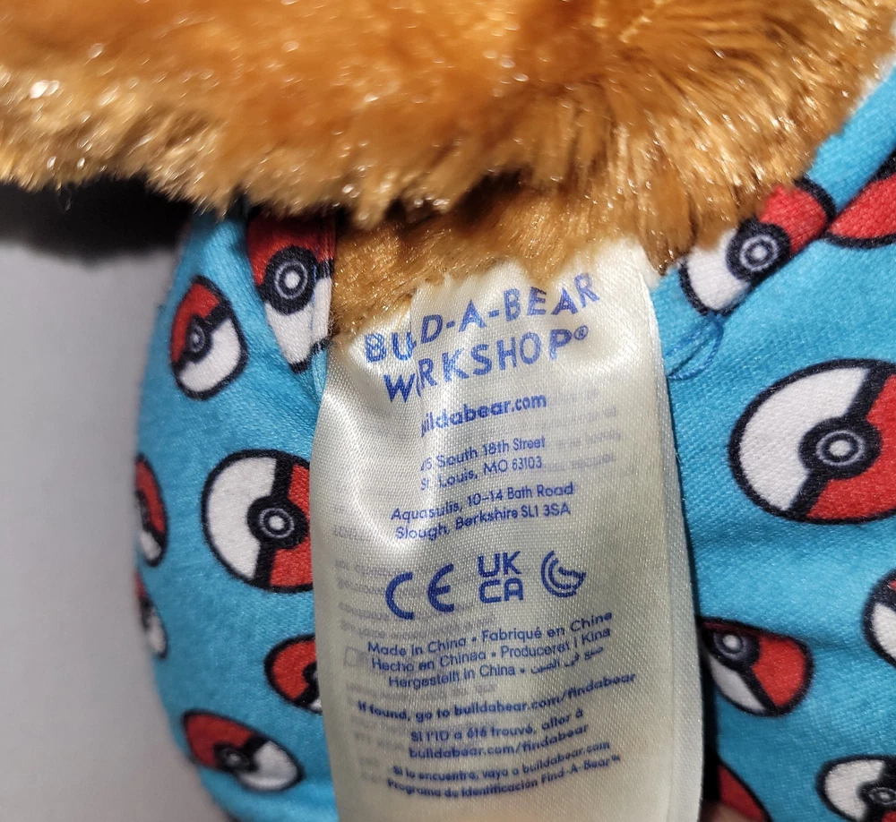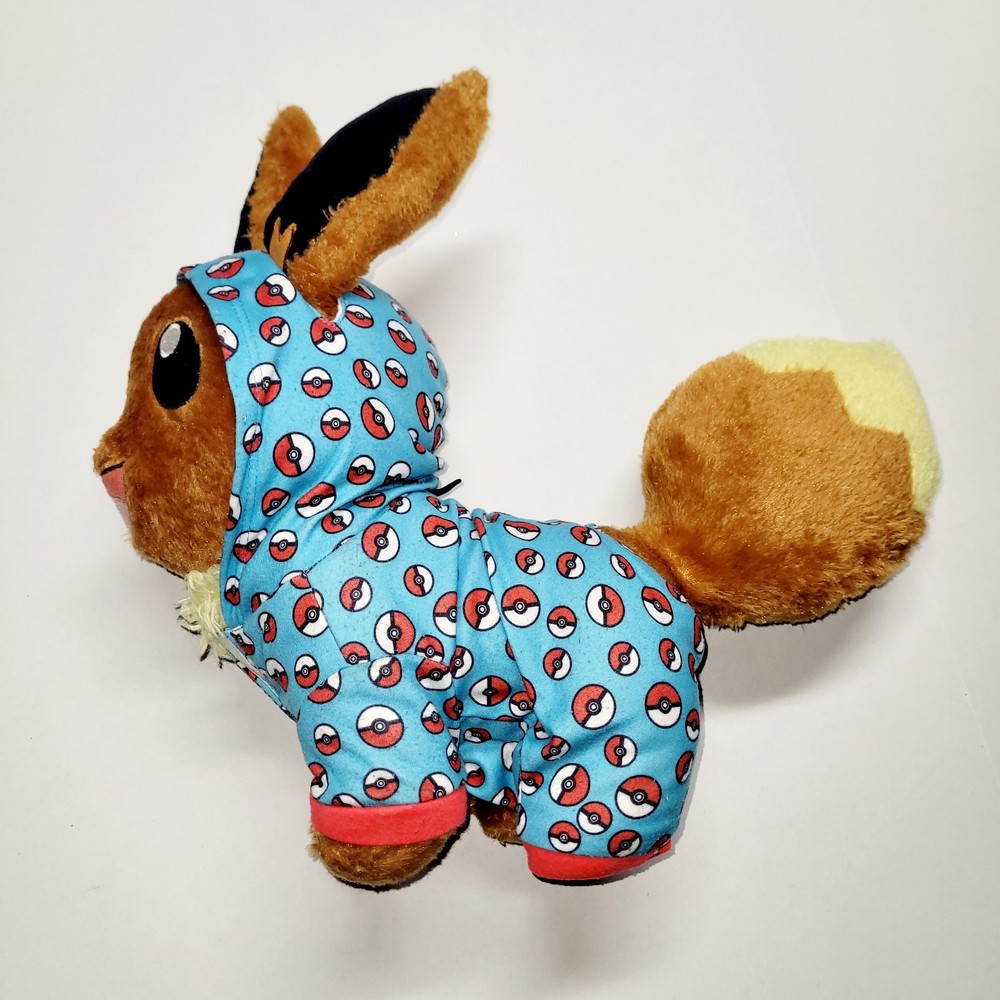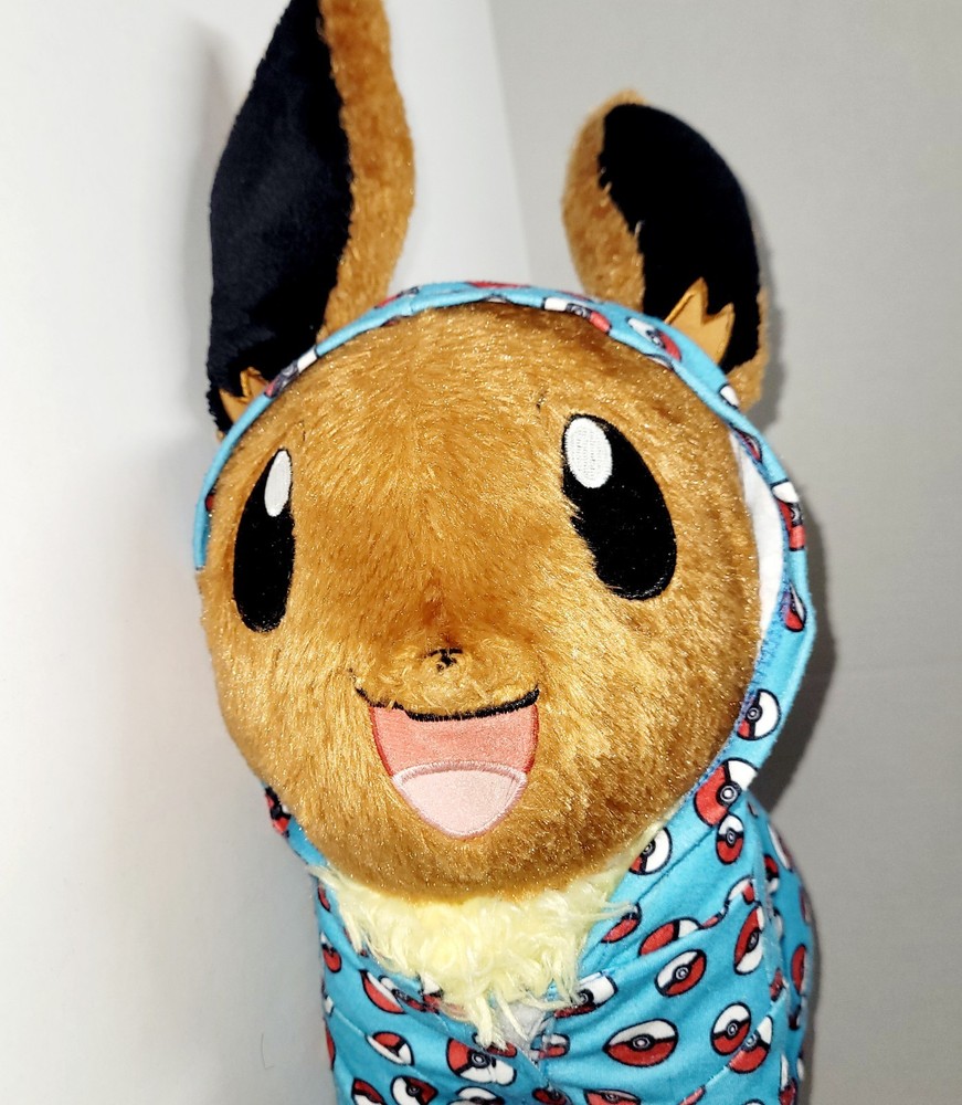 EEVEE WITH SOUND AND BAB POKEBALL PJ HOODIE. PRE OWNED. IN EXCELLENT USED CONDITION. PLEASE VIEW ALL PHOTOS ABOVE FOR PROOF OF CONDITION. STORED IN A CLIMATE CONTROLLED SMOKE-FREE AND PET-FREE HOME. SHIPS PROMPTLY AND SECURELY. This product is a stuffed animal from Build-A-Bear Workshop, featuring Eevee from the Pokémon franchise. It includes a BAB Pokeball Hoodie and is exclusive to the store. The bear is 17 inches in length and has a brown color. It is suitable for kids and has a sound function. The product was manufactured in 2021 and is a retired item.