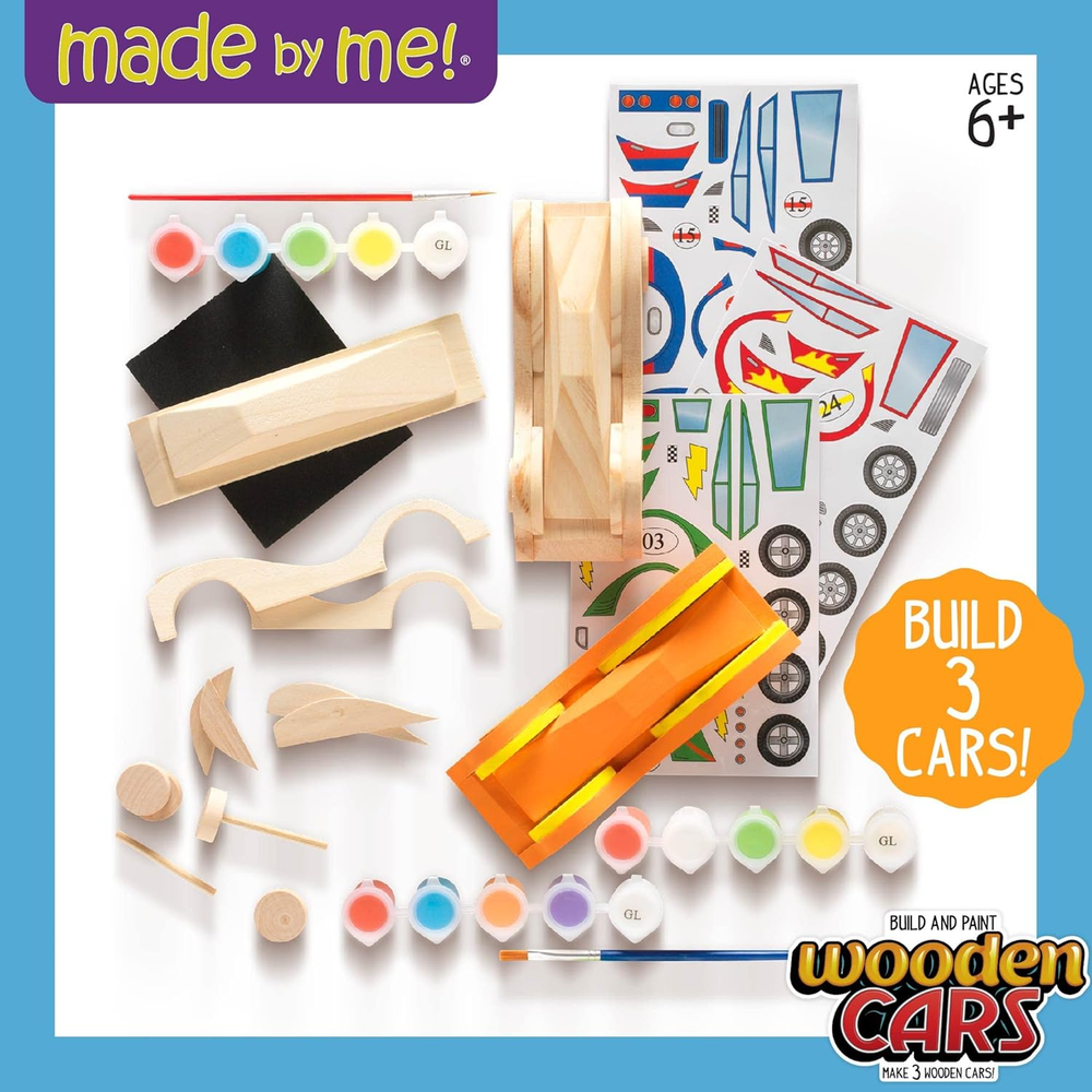 MAKE 3 OF YOUR OWN RACE CARS: Build your own functioning wooden race cars with action wheels and create unique designs to set your cars apart. The solid pine wood pieces make these cars durable for the fastest, fiercest racetracks around your house! 12 VIBRANT PAINTS & 3 STICKER SHEETS: Explore your creativity, color identification, and pattern-making as you mix 12 assorted paint colors to make your race car stand out from the rest. Add cool stickers like flame decals and numbers to get your car ready for the track. NO EXTRA TOOLS NEEDED: This arts and crafts kit includes all the materials to build and customize 3 working cars. The easy-to-assemble design means you don't have to worry about the hassle of tools or time. GREAT GIFT FOR LITTLE CAR ENTHUSIASTS: Great gifts for anyone who is creative and as a group activity for birthday parties, sleepovers, and any other fun get-togethers. KIT INCLUDES: 42 Pre-Cut and Pre-Sanded Wooden Pieces, 1 Sheet of Sand Paper , 3 Sticker Sheets, 3 Acrylic Paint Strips with Glue (4 Colors Each, 12 paints total), 2 Paintbrushes, Easy-to-Follow Instructions Developed by crafters for kids Real wooden cars Build and paint 3 cool cars Race your friends Product Description Build and paint 3 wooden cars with Made By Me! On your marks, get set, go! Get started by following the fully illustrated instructions, they’ll show you exactly where to glue 42 pre-cut and sanded wooden pieces to bring your racecars to life. Then, get your car ready for the racetrack! Mix and match 12 acrylic paints with awesome sticker decals! When you’re finished designing, put your craftmanship to the test and challenge your friends to a race and see which car zips through the finish line the fastest! Painting and art activities help boys and girls develop dexterity and encourage creative expression. See what colors you can come up with when you mix the shades! Model car kits are the perfect activity for adults and kids to do together. Great gift idea for Easter, Christmas, birthdays, summer, and more. Whether you're looking for a fun staycation activity or a rainy-day, screen-free idea, this build-and-paint kit is great for any little toddler and kid age 6 and up. From the Manufacturer Includes everything you need to decorate Wooden Cars. 42 Pre-Cut and Pre-Sanded Wooden Pieces, Sand Paper, 3 Sticker Sheets, 12 Pots of Acrylic Paint (0.101 fl oz each), 3 Pots of Glue (.101 f oz each), 2 Paintbrushes, Easy-to-Follow Instruction Booklet.
