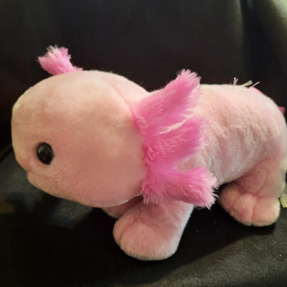 This Build-A-Bear stuffed animal is a limited edition bubblegum pink axolotl plush. It is 16 inches in size and weighs 1 pound. The plush is made of high-quality materials and features black eyes. It is an original item and is part of the Build-A-Bear franchise. This unit is sold as a single unit without packaging and is manufactured in 2021.