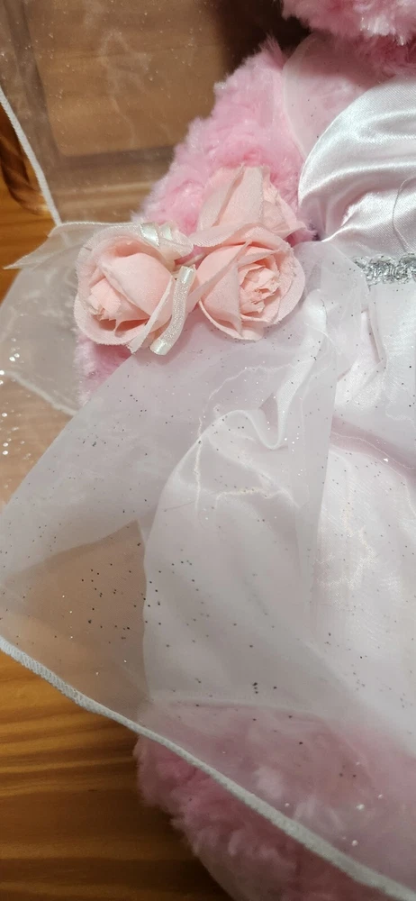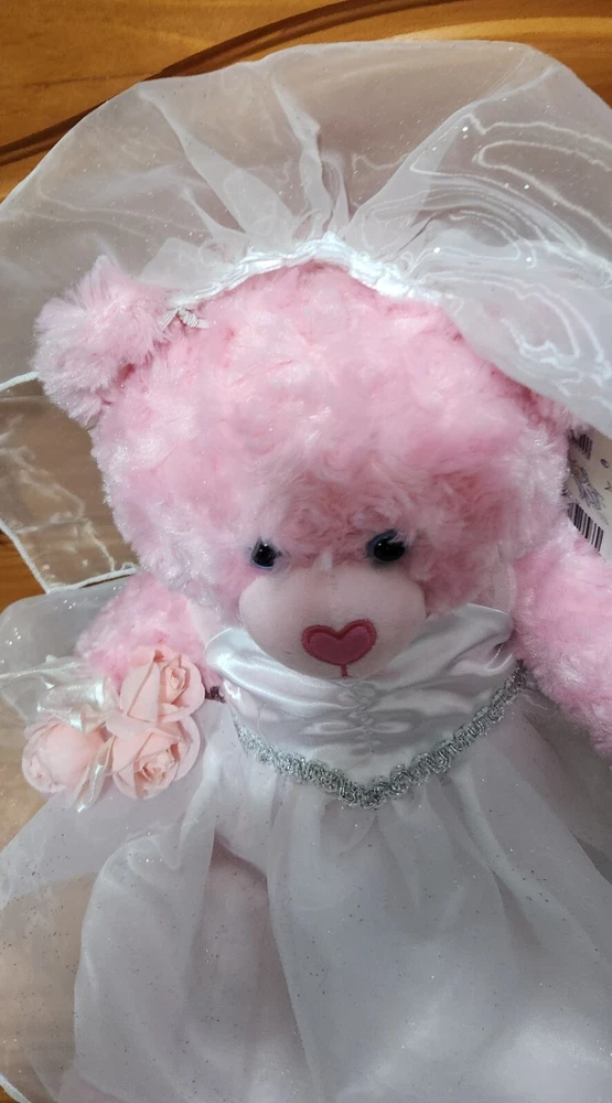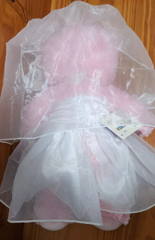 Brand new with tags Pink Cuddles BAB with sound ****plays here comes the bride, the sound chip is older i think so while the music starts out loud and normal, it starts to slow down and fade out after a few bars, still plays the whole song, its just starting to fade out**** Bear is spotless. Wedding dress new with tags Veil and corsage wristie also included