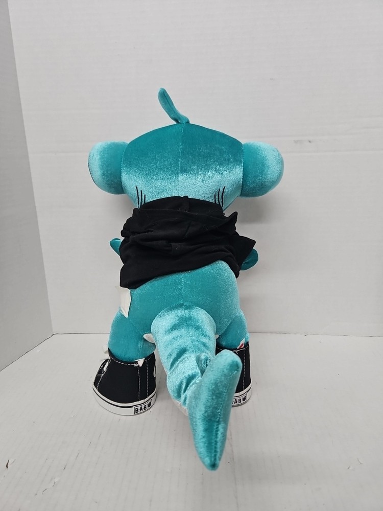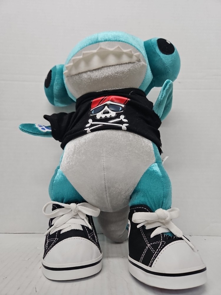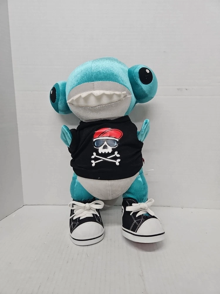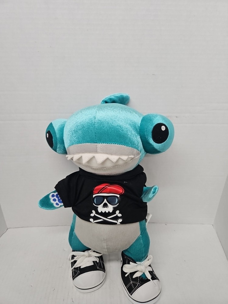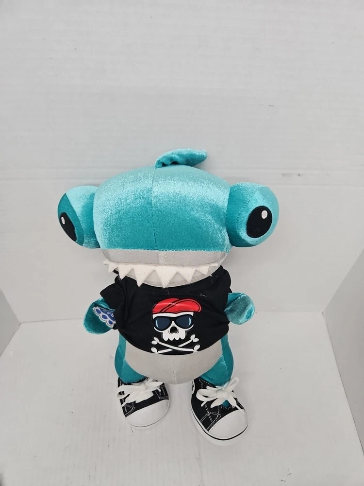 Celebrate the 30th anniversary of Shark Week with this limited edition Build-A-Bear Workshop set. This teal blue plush bear comes with a black shirt and hammerhead shark sandals, perfect for all occasions. The bear is 16 inches in size and made of soft, plush material. This set is a must-have for any marine life fan and is part of the anniversary collection. The bear and items included are original and have not been reproduced. Add this unique set to your collection today!