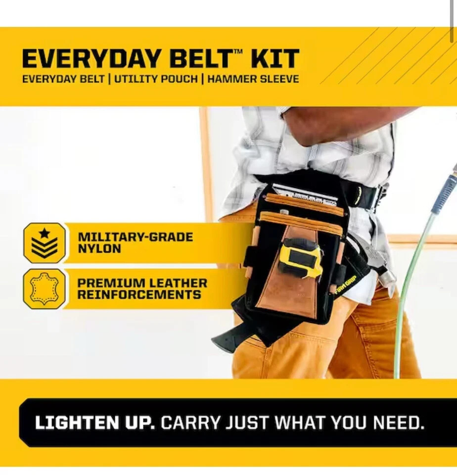 About This Product "Tired of jamming tools in your pockets or carrying around a heavy rig for jobs that don't need it? Lighten up and carry just what you need. The Everyday Belt Kit is a lightweight, modular tool belt system designed for jobs and trades where you need to carry around just the essential tools. Work lighter and more efficiently, while getting into tighter spaces, and customize your Everyday Belt based on the job with an assortment of modular accessory attachments (sold separately).Backed by a Lifetime Limited Warranty, the Everyday Belt Kit is engineered to withstand harsh daily use on the jobsite. The Everyday Belt is crafted with double layered, military-grade nylon, providing necessary structure to support your pouches, tools, and accessories. The quick-release buckle is forged from lightweight aluminum and provides set-and-forget sizing and increased load-bearing strength. The Utility Pouch delivers a compact and lightweight, hybrid design with military-grade nylon for enhanced performance. Key wear points are reinforced with the trusted durability of premium leather. The included Hammer Sleeve tucks behind the pouch providing quick access to your hammer while also protecting the jobsite and your body. Expand your Everyday Belt Kit with a full collection of Build-A-Rig accessories so you can customize your belt for any job.The Everyday Belt Kit is part of the Firm Grip Build-A-Rig system of belts, pouches, and accessories - empowering you to build YOUR RIG, YOUR WAY." Highlights Belt fits 28" to 55" waist sizes Lightweight, modular system includes the Everyday Belt, Utility Pouch, and Hammer Sleeve Hybrid leather and military-grade nylon construction delivers lightweight performance and enhanced durability Quick-release aluminum buckle with set-and-forget sizing and increased load-bearing strength Hammer Sleeve tucks behind the pouch providing quick access to your hammer while also protecting the jobsite and your body Built for the jobsite and backed by a Limited Lifetime Warranty Part of the Firm Grip Build-A-Rig collection of belts, pouches, and accessories Return Policy California residents see Prop 65 WARNINGS Product Information Internet # 329008838 Model # 1FG-3575 Store SKU # 1011429310