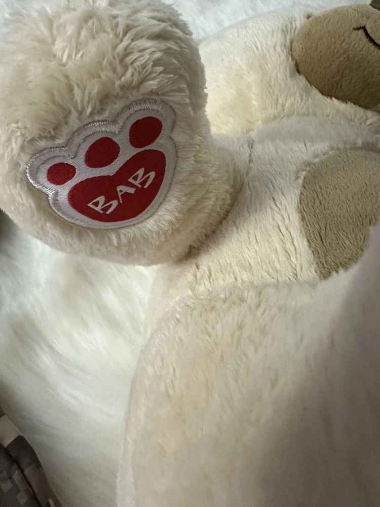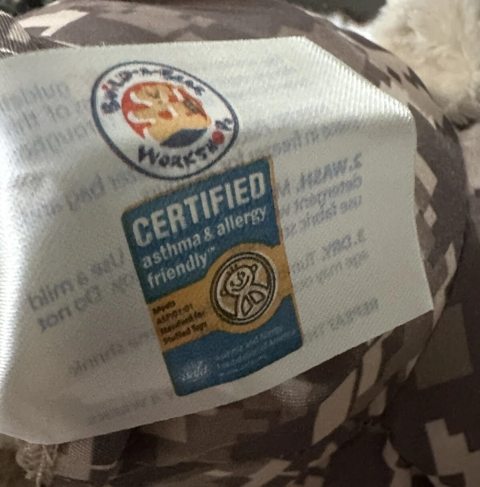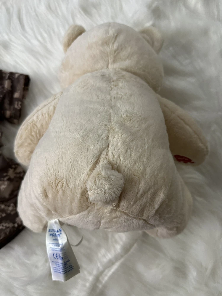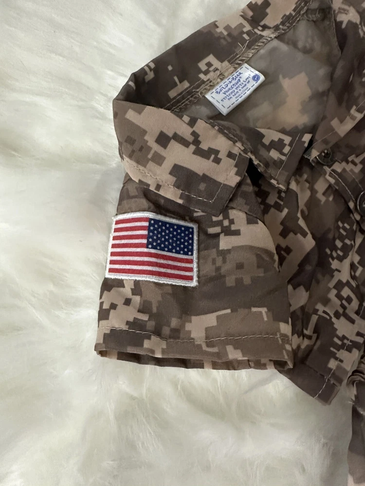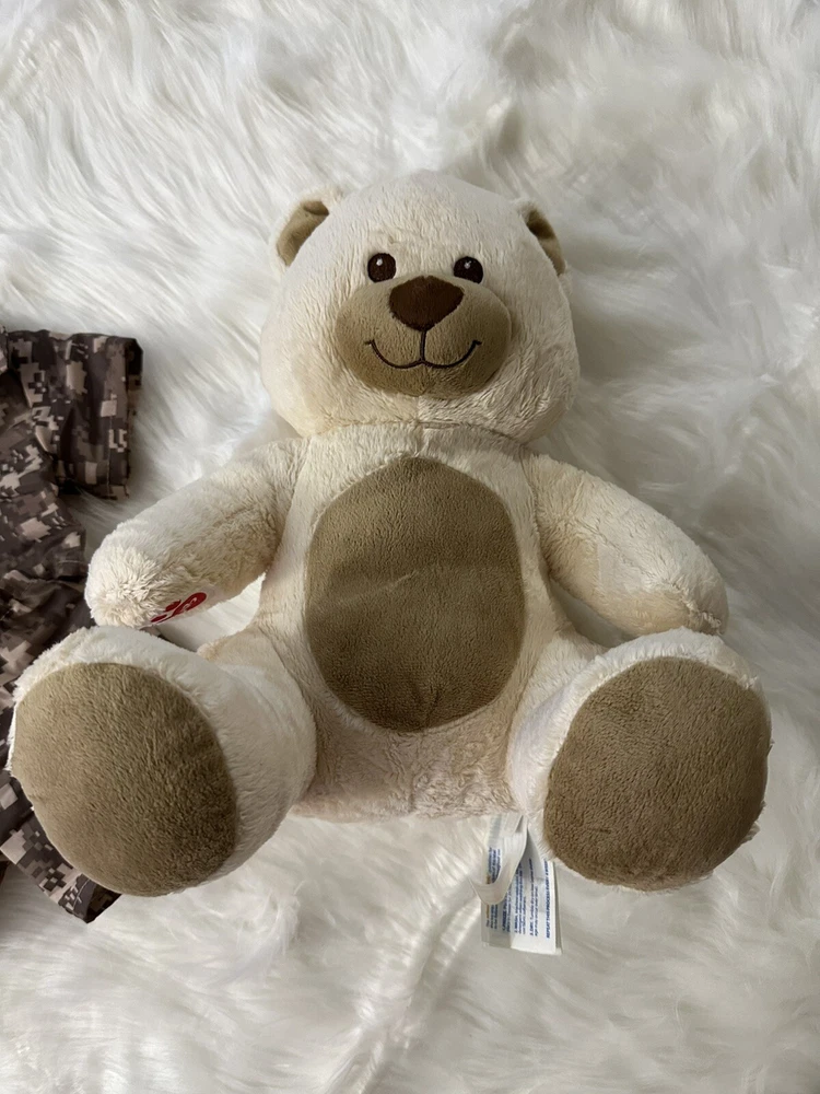 The product is a Build-A-Bear Workshop plush bear designed in honor of the U.S. military. The bear is medium-sized, tan and brown in color, and features a retired design. It is a part of the Build-a-Bear character family and is both washable and asthma and allergy-friendly. This special bear is a thoughtful gift for military members or supporters, offering a cuddly companion that also carries a patriotic sentiment.