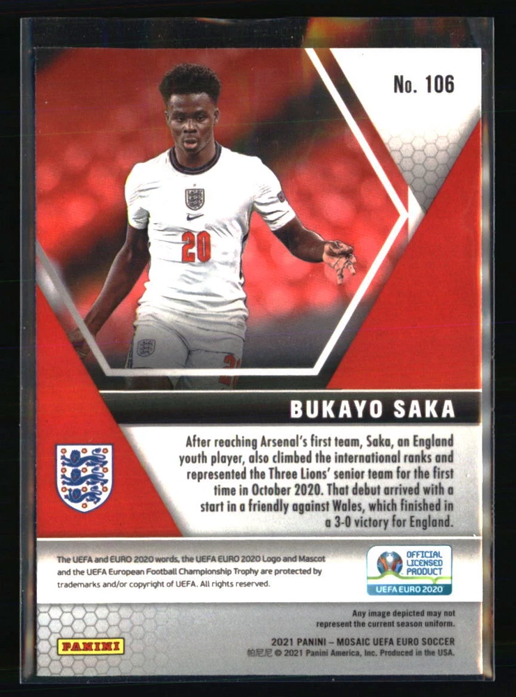Season: 2021 Year Manufactured: 2021 Set: 2021 Panini Mosaic UEFA EURO 2020 Team: England Card Number: 106 Manufacturer: Panini Sport: SOCCER Player|Athlete: Bukayo Saka Type: Sports Trading Card Graded: No Autographed: No