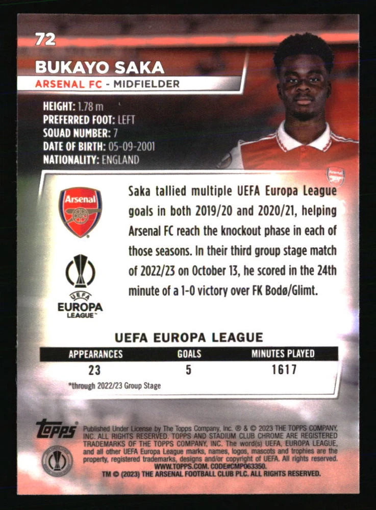 Bukayo Saka 2022-23 Stadium Club Chrome UEFA Club Competitions #72 SOCCER Card