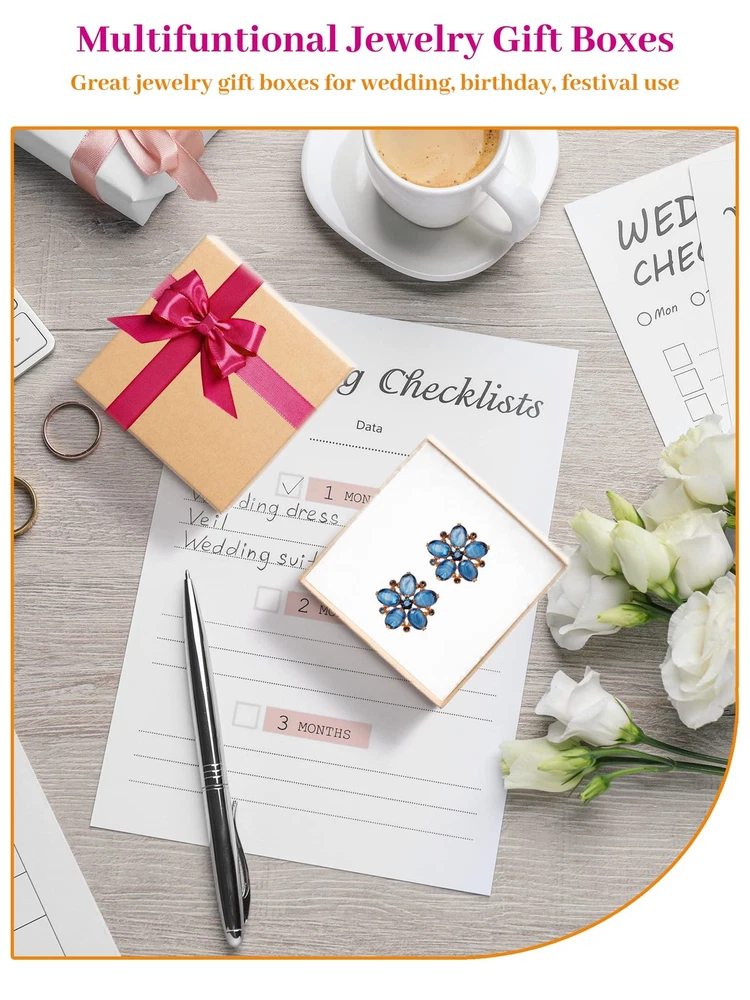 Box for Delicate Things Many times we have had something shipped to us and it arrives in a damaged condition. It is disappointing to find something you are looking forward to using reach you broken or unusable. Now, make sure that all your delicate items are packed safely and securely in cardboard boxes. These gift boxes for jewelry are specially constructed to keep and ship delicate items like glass, crystal, figurines, etc. The cardboard jewelry box bulk is made with 1.1 mm thick cardboard paper and does not bend or lose its shape easily. Is hard to tear and twist. The box comes lined with a layer of cotton fiber to nestle the item and prevent it from damage. The plain gift boxes come unadorned and ready to be personalized to your specification. If you run a business in retail items that are delicate and need to be protected, these boxes are ideal for you. You can print, paint or stamp your business logo and message on top of these boxes. They can be painted, embossed, or decorated according to your taste. They are also excellent for crafts. Use them as gift boxes or as storage boxes for your delicate pieces or decorations. Gift Box For Jewelry:Each gift box for jewelry measures 3.5x3.5x1 inch, pack of 96 jewelry boxes filled with cotton.This jewelry box offers spacious storage without taking up too much desktop space. Ideal for home use or travel, meets the needs of various scenarios. Sturdy Cardboard Jewelry Boxes:Each small jewelry gift box has a cotton-filled plush interior that effectively protects your jewelry from scratches and wear and tear, keeping your jewelry looking like new at all times.The mini gift box is made of 1.1 mm thick cardboard paper and will not bend or lose shape easily, is hard to tear and twist. The jewelry shipping box is lined with a layer of cotton fiber to nestle the item and protect it from damage. The natural cotton fiber is non-reactive and will not discolor. Small Gift Box Wtih Lids:This jewelry box adopts the classic clamshell design style, with a simple and generous appearance, suitable for a variety of decoration styles. Whether it is placed on the dresser or bedside table, it can show nobility and taste. Jewelry Gift Boxes For Women:This jewelry box is not only practical, but also has a high value, making it an ideal gift for family and friends. Whether it's a birthday, Christmas Day, Valentine's Day, Mother's Day or a special anniversary, this jewelry box is an ideal gift for your friends and family. Its elegant appearance and practical features are sure to win their love and appreciation. The exquisite packaging adds to the thoughtfulness and is perfect for expressing your feelings and blessings. Multifunctional Jewelry Boxes:Conveniently store different types of jewelry such as rings, necklaces, earrings and bracelets. No more worries about jewelry storage, everything is in order and easier to access. Avoid tangling and loss of jewelry. Whether it's rings, necklaces, earrings or bracelets, you'll find the right place. Perfect for selling handmade jewelry online or at booths, fairs and conventions. Give your products a classy and professional look with these simple cotton-filled jewelry boxes for sale. Easily customize each jewelry box with stamps or stickers and build your brand.
