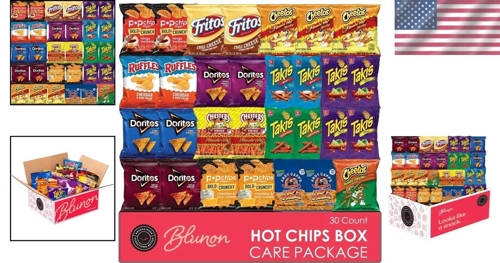Flavor Cheddar,Jalapeno,Buffalo,Spicy Unit Count 30.0 Ounce Number of Items 30 Type Potato Chip Get an extra zing in each mouthful with Blunon's snack bag variety pack. A convenient and economical way to buy all your favorite hot and spicy snacks. With 30 packs, this purchase gives you plenty of treats to last awhile. Stock up your pantry, slip in your bag, or fill up your office desk to share with coworkers and friends. Also a great gift for kids in college or anyone who loves sweet treats. Pack the heat! Assortment includes: Takis, Doritos Cool Ranch, Sweet Chili and Spicy Nacho, Cheetos Cheddar Jalapeno and Flamin Hot, Popchips Bold & Crunchy, Fritos, Chesters Hot, and Andy. Due to supply chain issues, substitution may occur. This great package includes all of your favorites to satiate any craving, from spicy to hot, buffalo to jalapeno, and everything in between. It includes all of the tastiest brands such as Takis, Doritos, Cheetos, Popchips, Fritos, Andy, and Chester's. The variety packs, with individual serving sizes, make on-the-go snacking easy. They are a convenient and economical way to buy all of your favorite snacks. Grab one in the car, at work, packed for lunch, or enjoy it at home! Great for trips, parties, school, and holidays and make a thoughtful addition to care packages or a get-well gift for someone special. Each package contains 30 single-serve bags of your favorite snack bags individually wrapped for portion control. Perfect for kids and adults too.