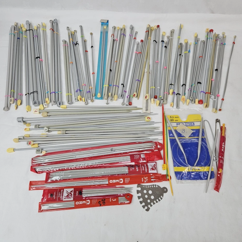 Large mixed job lot of vintage knitting needles and accessories. This bundle includes 30+ pairs of knitting needles in a wide range of sizes and lengths, along with a selection of extras such as circular needles and knitting accessories/tools . Mostly classic aluminium needles with various brands visible (see photos), plus some larger sizes and speciality pieces. A great mixed lot All items are exactly as shown in the photos – a well-balanced mix with potential. Condition Summary Used vintage condition with general signs of wear. Some items are unused/sealed. See photos for full detail.