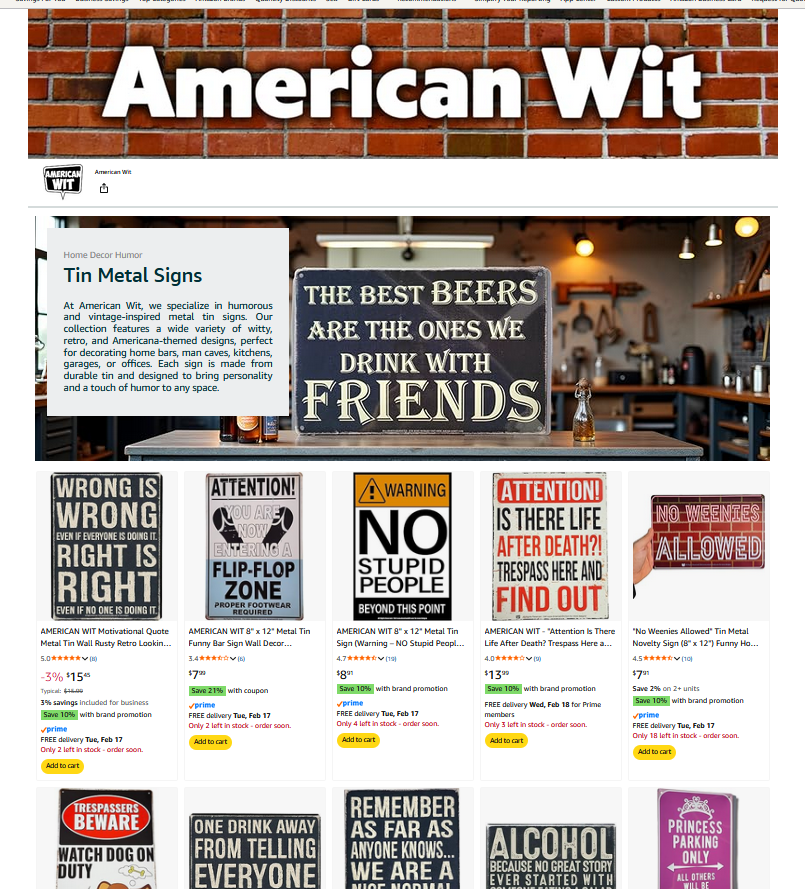 Freeboutiquetemplates.com American Wit Bulk Funny Bar Novelty Metal Tin Signs - Random Assortment (8" x 12") Garage Man Cave Restaurant Pool Hole Home Bar Vintage Wall Decor About this item 🍻 Funny Vintage Bar Wall Decor: Add humor and retro style to any space with these funny bar novelty metal tin signs. Featuring classic vintage-inspired designs and witty bar-themed sayings, these 8" x 12" signs bring personality and charm to garages, man caves, home bars, restaurants, and game rooms. 🪧 Durable Metal Construction: Made from sturdy metal tin, each sign is designed to last with a lightweight yet durable build. The printed designs offer a vintage look that complements rustic, industrial, and retro décor styles while remaining easy to hang or display. 🏠 Perfect for Multiple Spaces: Ideal for decorating garages, man caves, pool halls, restaurants, home bars, kitchens, patios, and entertainment rooms. These signs also work great as conversation starters, themed décor accents, or fun focal points for social spaces. 🎁 Great Bulk Décor & Gift Option: Random Assortment. All Different Designs Up to 50 Pack. 100 Pack or more will have repeat designs. Perfect for bulk decorating projects, bar renovations, party décor, or gift-giving. These novelty tin signs make excellent gifts for bar owners, homeowners, beer lovers, and anyone who appreciates funny vintage-style wall art. Please Note: Not for Resale Online! Made of High-Quality Durable Aluminum, with Smooth Edges. Safe and Non-Toxic. For Ages 14+.⭐⭐⭐⭐⭐ Welcome to our eBay store! We're a family-owned business dedicated to providing high-quality products and excellent customer service. We specialize in toys and novelty items, offering a wide range of options to suit your needs. Our inventory includes top brands and products that we personally select and test to ensure the best quality. Whether you're looking for ducks or tin signs, we've got you covered. Our team is always here to answer any questions you may have or provide assistance with any issues. We value our customers and strive to exceed your expectations, so please don't hesitate to reach out to us. Please write a Product Review when you have a chance. Your honest feedback is important to us and helps other shoppers make informed decisions. On Feb 20, 2025 at 17:47:56 PST, seller added the following information: Get business information that counts! - Vendio Counters are active content free.