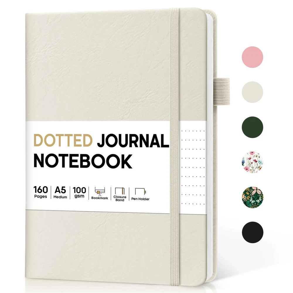 160 Pages Dotted Journal: Discover the freedom of 5mm-spaced dotted pages, perfect for bullet journaling, sketching, and organizing. The subtle dot grid provides structure without limiting creativity, helping you easily design layouts, track goals, and develop ideas in your personal style. Perfect for Creative Planning: Taja dotted journal is ideal for those who love crafting custom planners, creating mood boards, or organizing thoughts freely. It’s a versatile tool for artists, students, professionals, and anyone looking to visualize projects, tasks, and ideas with precision. Premium 100gsm Paper: Made with high-quality 100gsm paper, Taja harccover dotted journal offers a smooth, enjoyable writing experience with no ink bleed-through. Whether you're using pens, pencils, or markers, the durable paper ensures clean and crisp lines, preserving your work beautifully. Portable Size with Handy Extras: Sized at 5.7"x8.6", this medium A5 notebook is compact enough for easy carrying while still providing ample space for your creativity. The faux leather cover, expandable inner pocket, ribbon bookmark, and pen holder offer style and practicality for daily use. Lay-Flat Design for Seamless Writing: The 180° lay-flat binding makes it effortless for both left- and right-handed users to write, draw, or sketch without any interruptions. With a perfectly flat surface, this notebook enhances your creative flow on any surface.