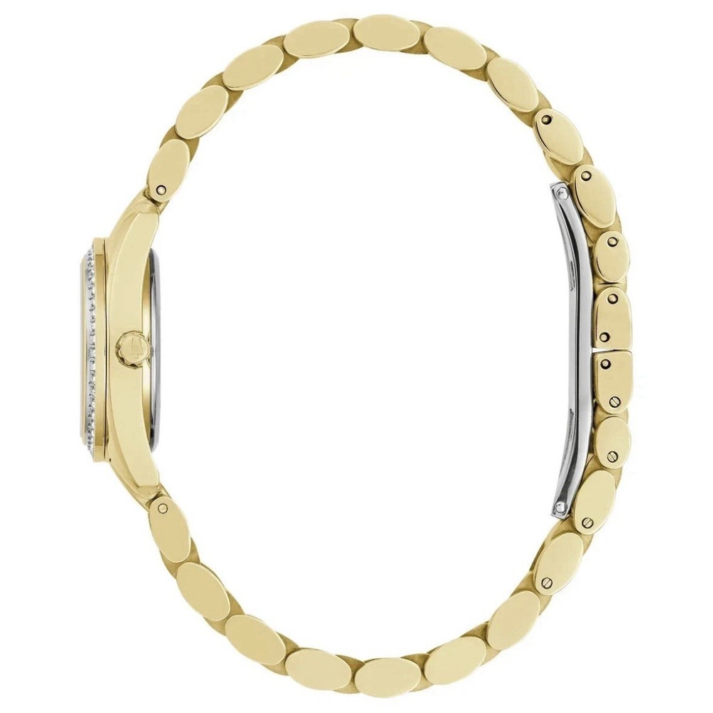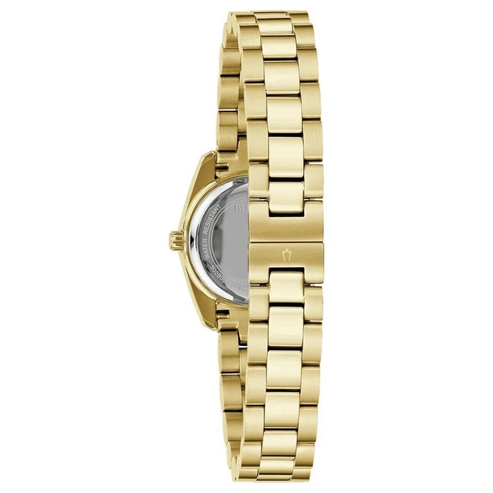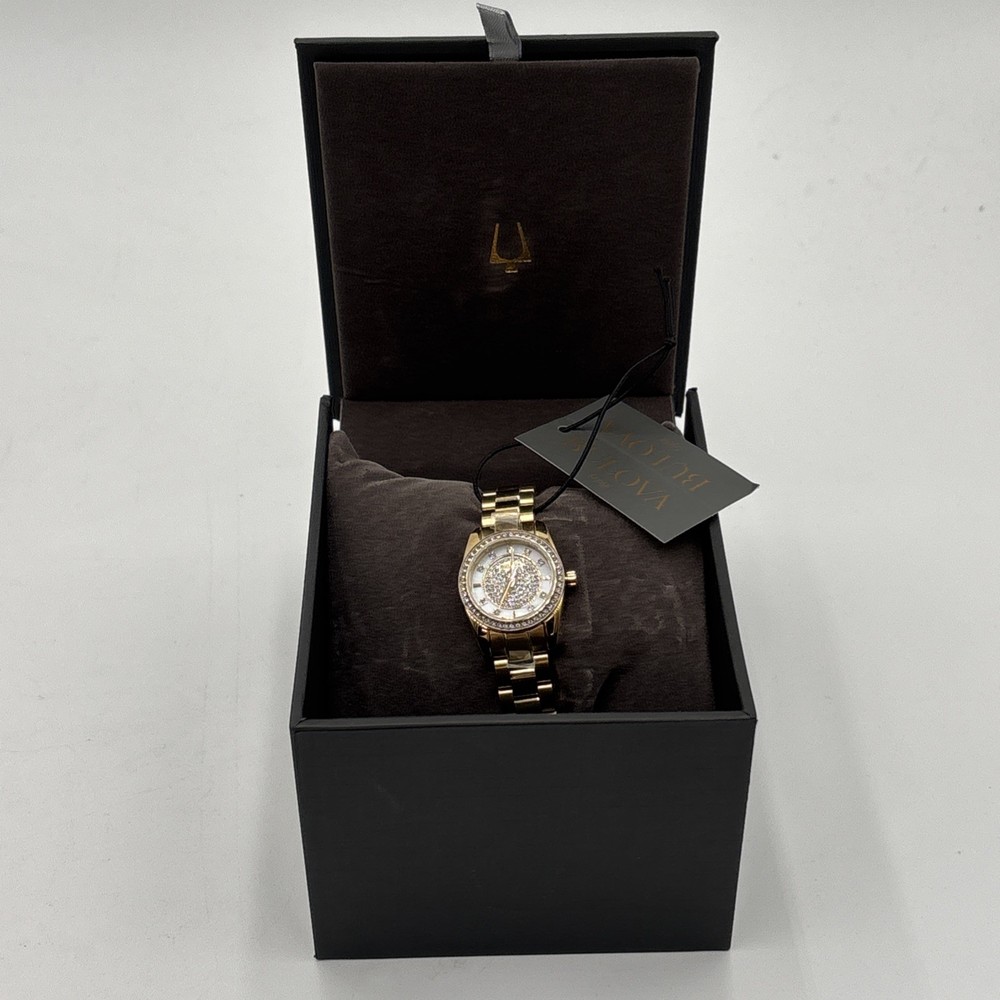 The Bulova Classic Gemmed Stainless Steel Quartz Women's Watch (Model Number 98L315) is a luxurious timepiece suitable for various occasions. With a round white dial and gemmed accents, this elegant watch exudes a classic and timeless style. The stainless steel case and bracelet in a gold color add a touch of sophistication, while the quartz movement ensures accurate timekeeping. Featuring a deployant closure and water resistance up to 50 meters, this watch is both practical and stylish for everyday wear or formal events. Complete with original packaging and manual, this Bulova watch is a perfect choice for any woman looking for a blend of luxury and functionality.