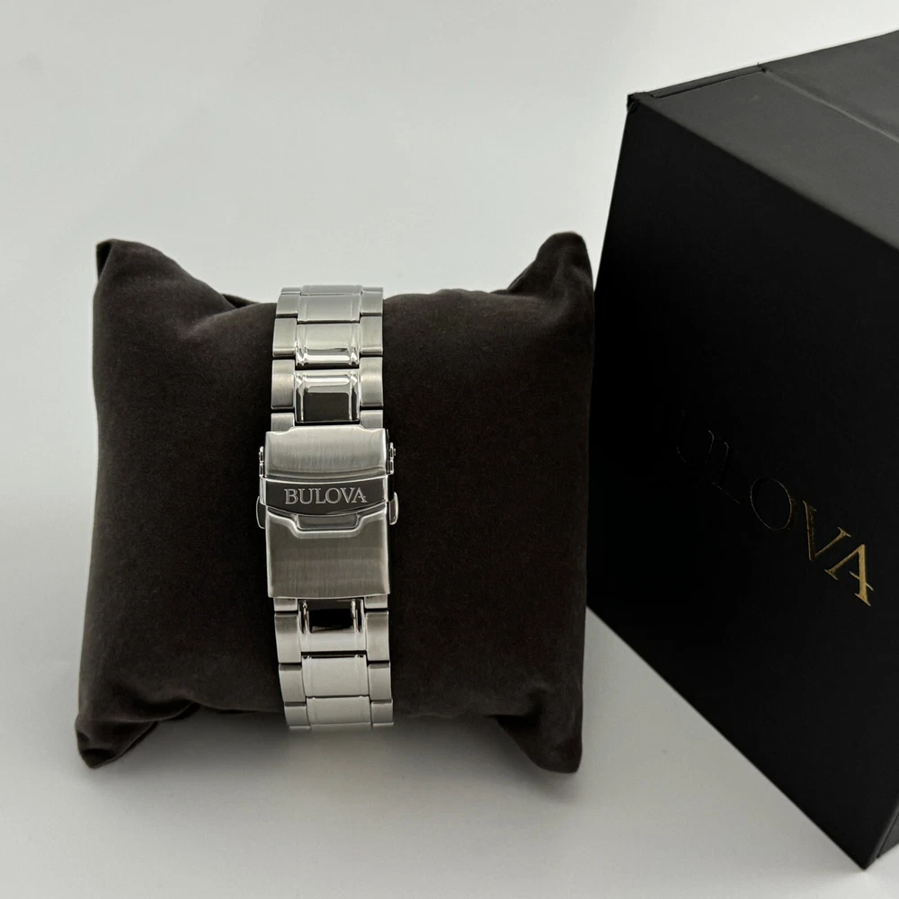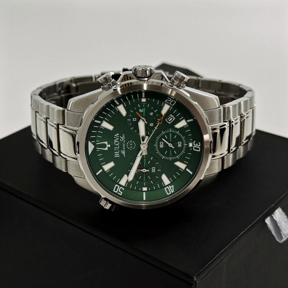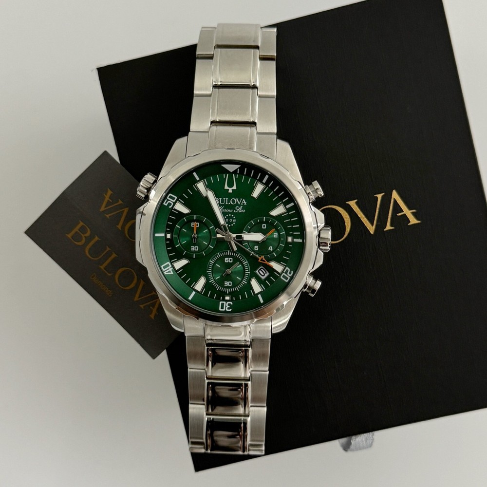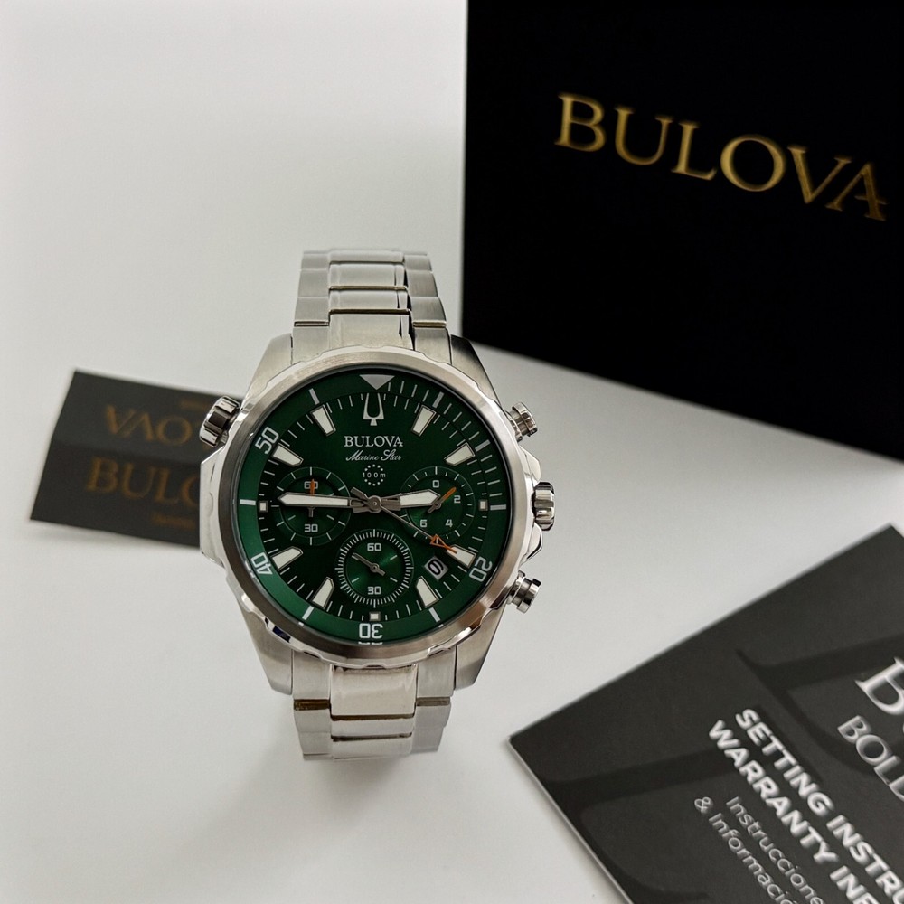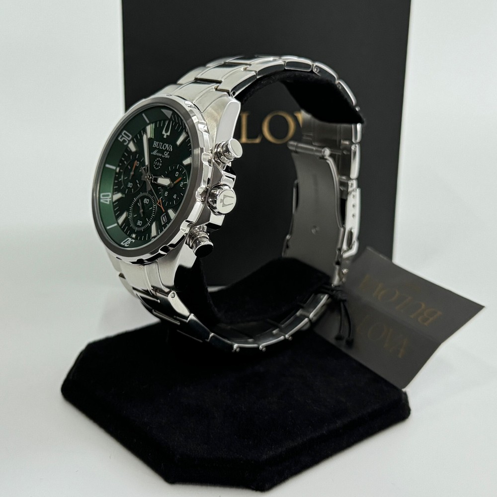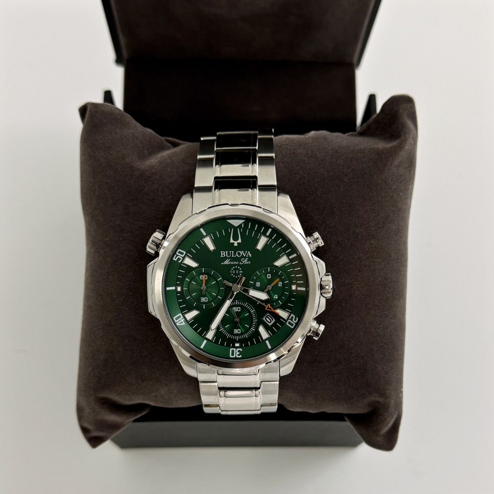 Bulova Classic Green Marine Star Stainless Steel 96B396 Watch (43MM) From the Marine Star collection brings the energy and ruggedness of the ocean to those who want to explore the sea. Six-Hand Chronograph Function with Calendar, The silver-tone stainless steel case features a balance of brushed and polished facets, a flat mineral crystal, and a pull-out crown achieving 100m water resistance. The dial is a refreshing burst of green with white accents, inspired by vintage Bulova timepieces, featuring silver-tone polished stainless steel hands and applied markers, all of which have been treated with luminescent material for low-light legibility. Brand new with box We use USPS or UPS with tracking number Technology Quartz Battery powered movement. Quartz crystal regulates time with an accuracy of 15 seconds per month. Case Width (MM) 43 Lug Width (MM) 22 Dial Green Silver Tone Luminous Hands and Markers Clasp Safety Folding Clasp with Push Buttons Crystal Mineral Crystal Shock and Shatter Resistant Thanks for shopping at our store! If you are happy with your purchase- we would appreciate a 5-star rating and positive feedback! We answer messages daily, but please allow at least 12 hours for a reply- sometimes it takes us awhile to catch up on after hour messages If you have a shipping related question/request, please put it in the message box at checkout- Once the order is completed, the confirmed address on file cannot be changed.