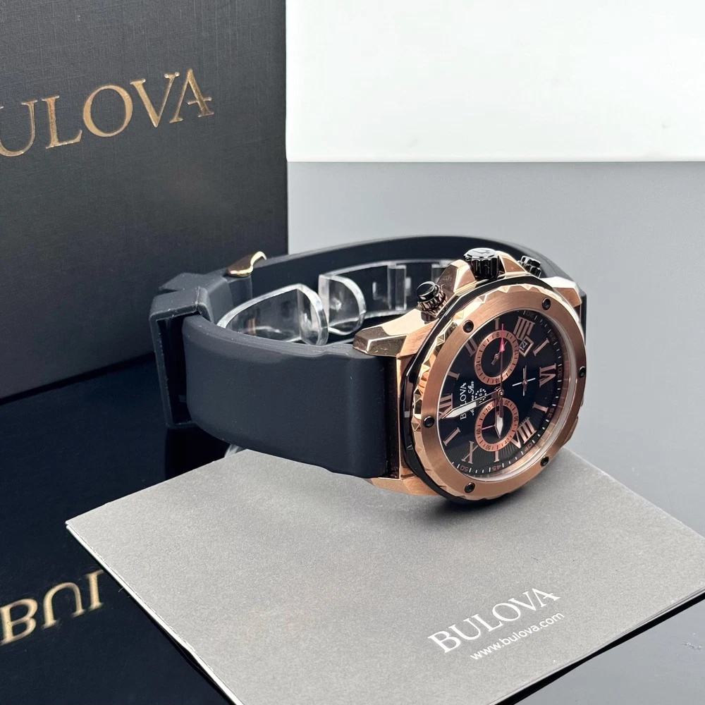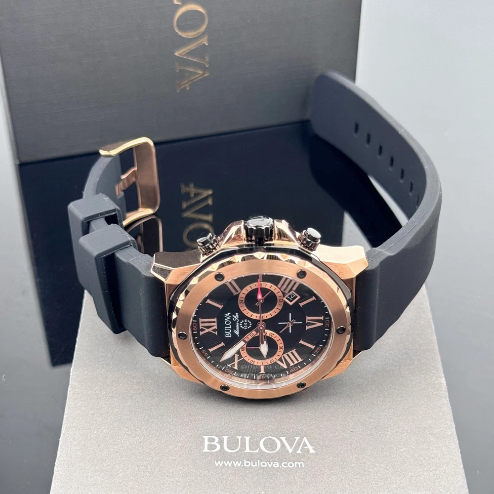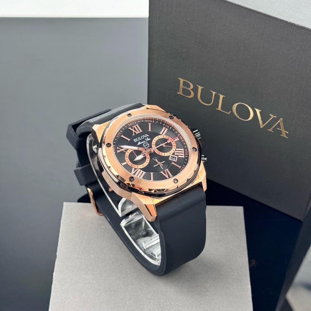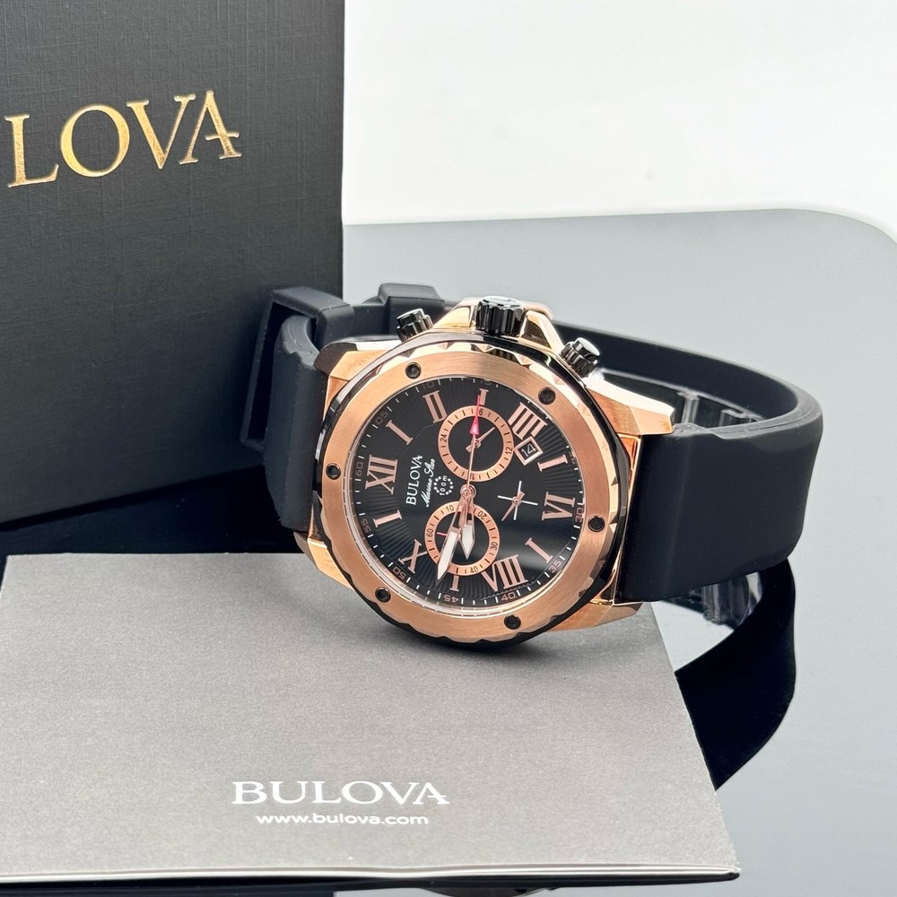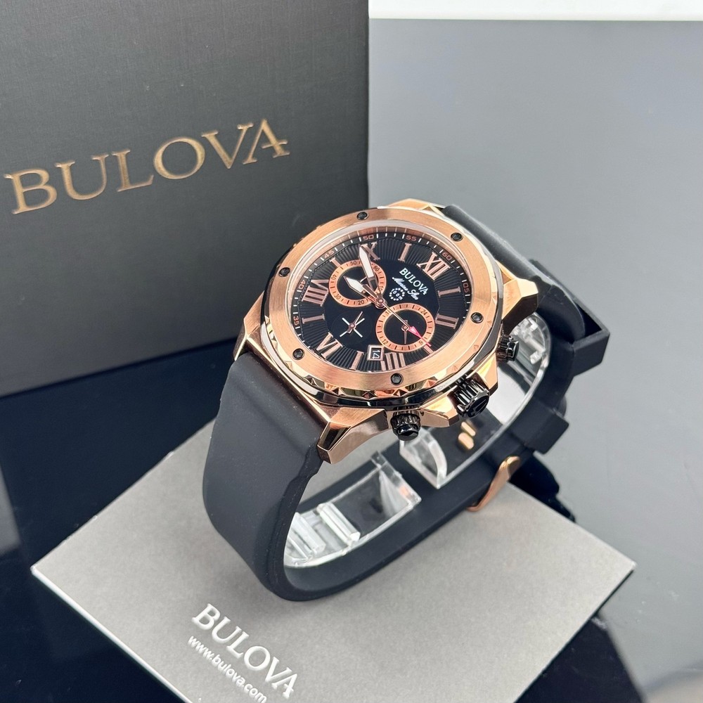 From Bulova's Men's Marine Star Collection, live and play in maritime watches that feature bold accents, iconic patterns and innovative materials inspired by the sea.Round black patterned dial with luminous hands and rose gold-tone Roman numerals makes reading easy. Details: Chronograph subdials track minutes and hours. Two-Tone Stainless Steel Water resistant to 330 feet Date function Chronograph, Calendar 12/24-hour format Quartz movement Battery operated Mineral-crystal face cover Rose gold-tone ion-plated stainless steel case with black accents Stainless steel caseback Adjustable black band Manufacturer's 3-year limited warranty Model no. 98B104 Shipping: All items will be shipped within 2 days upon receipt of payment (except weekends and holidays). If Payments are received on weekends or holidays, goods will be shipped on the following business day. Buyer confirms (offers) address & Phone number after order item.If you need to change your address after placing an order, please contact me. We offer expedited service. If you need, please contact us. Returns: We support a 30-day return and exchange policy. If you are not satisfied with the product you received, you can contact us for a return or exchange. In order to be a full refund, less shipping expenses, your returned merchandise must be in its original new condition, as shipped, with all packaging, manuals, and paperwork intact and unaltered.