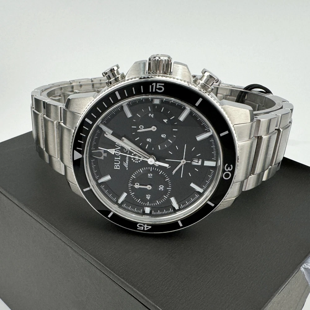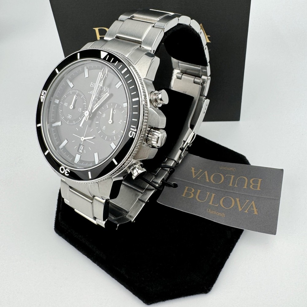 From the Marine Star Collection. New six-hand chronograph movement with 200-meter water resistance. In stainless steel with black glass insert on ratcheted rotating bezel, black dial with luminous hands and markers, and calendar feature, domed mineral crystal, screw-back case, stainless steel bracelet with fold-over buckle closure, safety bar and extender. Quartz Watch, movement powered by a battery. The quartz crystal regulates the time and is water-resistant up to 0200M. Brand new with box We use USPS or UPS with tracking number MODEL 96B272 MOVEMENT 6S20 TECHNOLOGY Quartz A movement powered by a battery. The quartz crystal regulates the time achieving accuracy to 15 seconds a month. CASE WIDTH (MM) 45 LUG WIDTH (MM) 22 DIAL Black Silver-Tone Luminous Hands and Markers STRAP TYPE Bracelet Stainless Steel CASE MATERIAL Silver-Tone Stainless Steel CLASP Safety Fold Over Clasp with Push Buttons CRYSTAL Domed Mineral Crystal Impact and shatter resistant, dome-shaped crystal raised at an angle within the bezel WATER-RESISTANCE 0200M ADDITIONAL FUNCTIONS 6 Hand 1/20 Second Chronograph Measures up to 60 Minutes Calendar Small Second Hand Thanks for shopping at our store! If you are happy with your purchase- we would appreciate a 5-star rating and positive feedback! We answer messages daily, but please allow at least 12 hours for a reply- sometimes it takes us awhile to catch up on after hour messages If you have a shipping related question/request, please put it in the message box at checkout- Once the order is completed, the confirmed address on file cannot be changed.