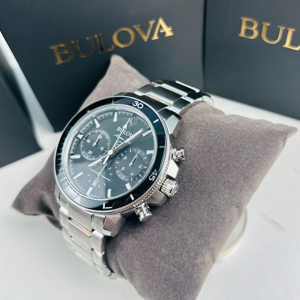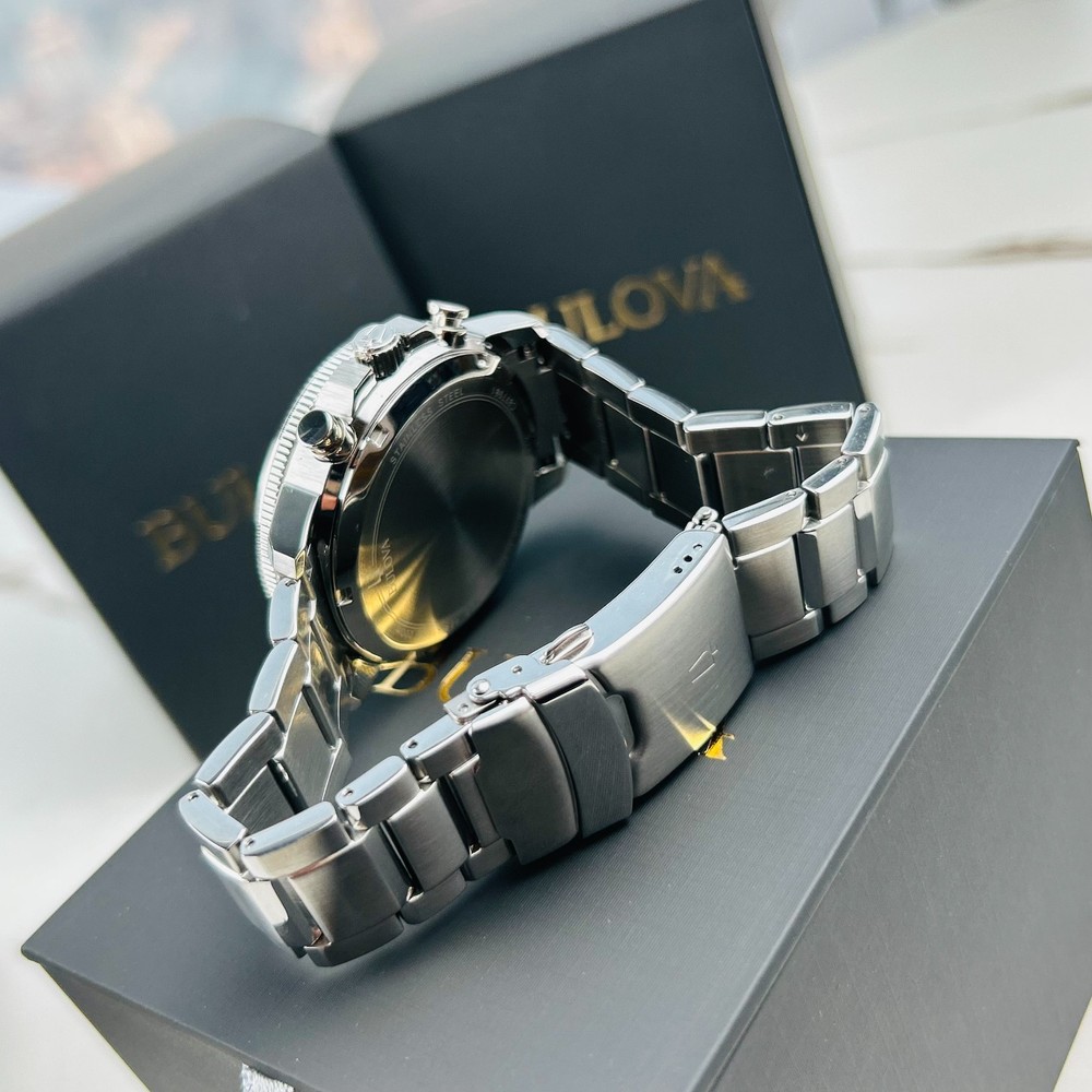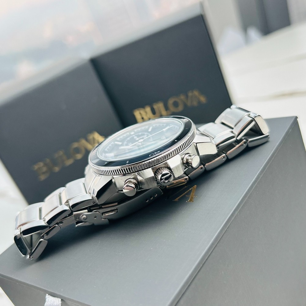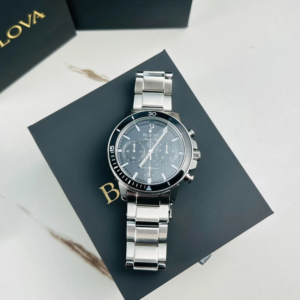 Brand: Bulova Model: 96B272 Movement: Quartz Dial Color: Black Crystal: Mineral Crystal Case Width: 45mm Lug Width: 22mm Material: Stainless Steel Water Resistance: 200m Features: Analog Display, Chronograph, 200M Water Resistance 6 hands 1/20 Second Chronograph Measures up to 60 Minutes Calendar Small Second Hand Shipping: Fast Shipping! Ship via UPS, USPS, FEDEX From the Marine Star Collection. New six-hand chronograph movement with 200-meter water resistance. In stainless steel with black glass insert on ratcheted rotating bezel, black dial with luminous hands and markers, and calendar feature, domed mineral crystal, screw-back case, stainless steel bracelet with fold-over...buckle closure, safety bar and extender.